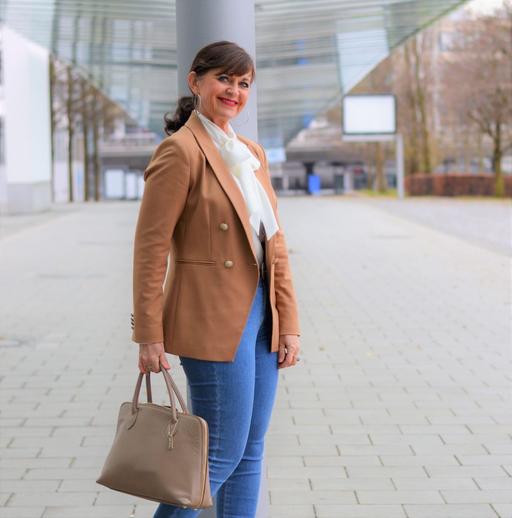 Meine liebste Kombination mit einer Jeans besteht aus Bluse und Blazer. Diese Kombination ist perfekt für den Casual Friday im Büro. Die Schluppenbluse gibt dem Look einen gewissen femininen Touch.