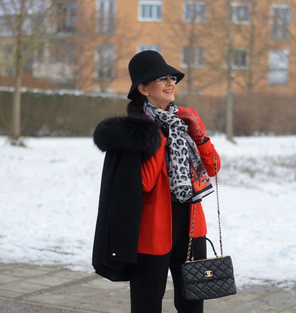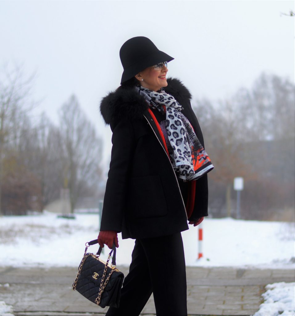 Mit einem schicken Tuch, welches in extravaganten Motiven versehen ist, bekommt der Look meinen persönlichen Stil. Die Farben schwarz-rot sind in ganz unterschiedlichem Mustermix in dem Tuch wiederzufinden. Ich trage oft ein Tuch zu meiner Garderobe, nicht nur im Winter. Mal ist es ein Tuch, mal ist es ein Schal – das wähle ich passend zum Komplettlook aus.