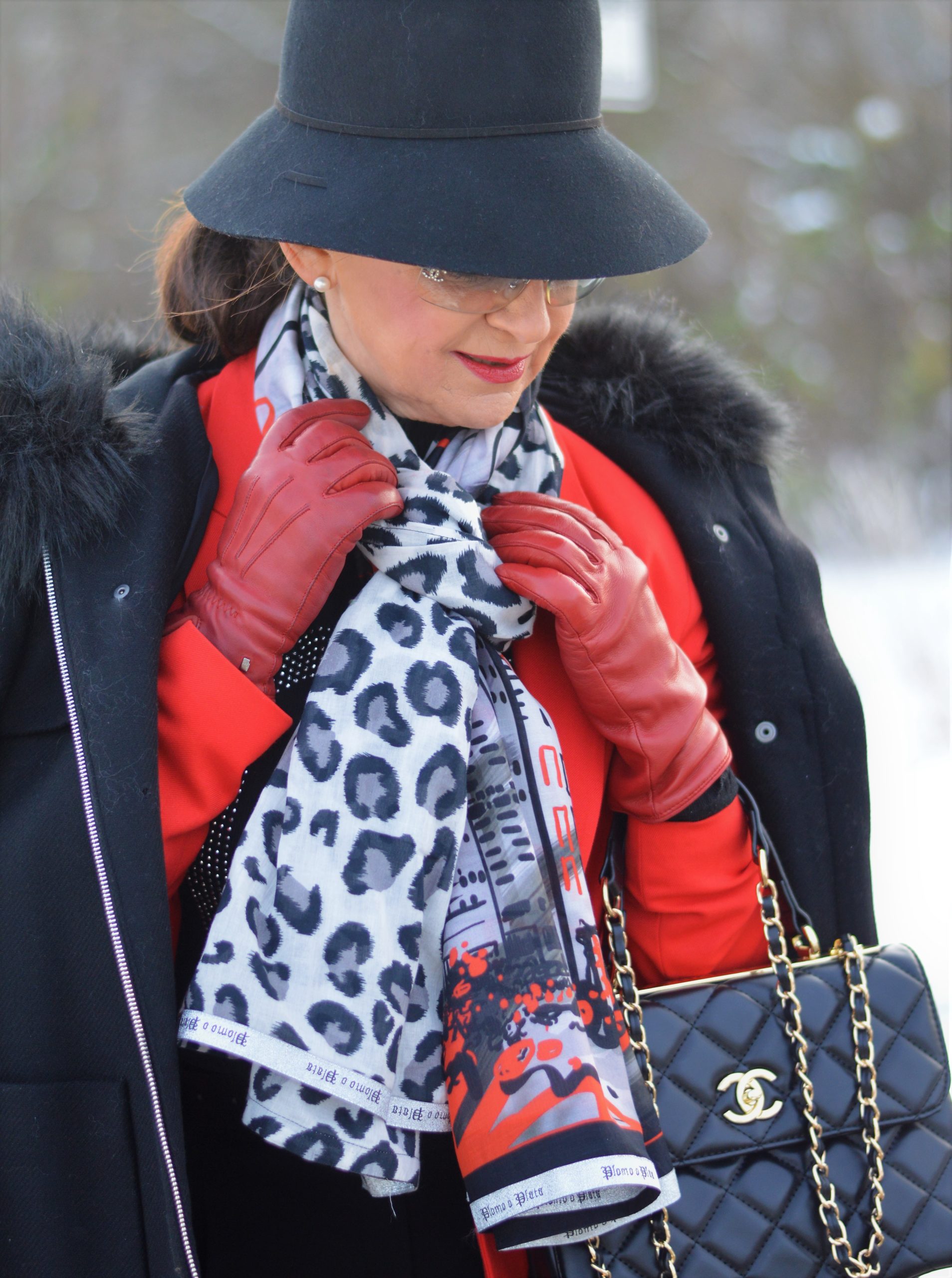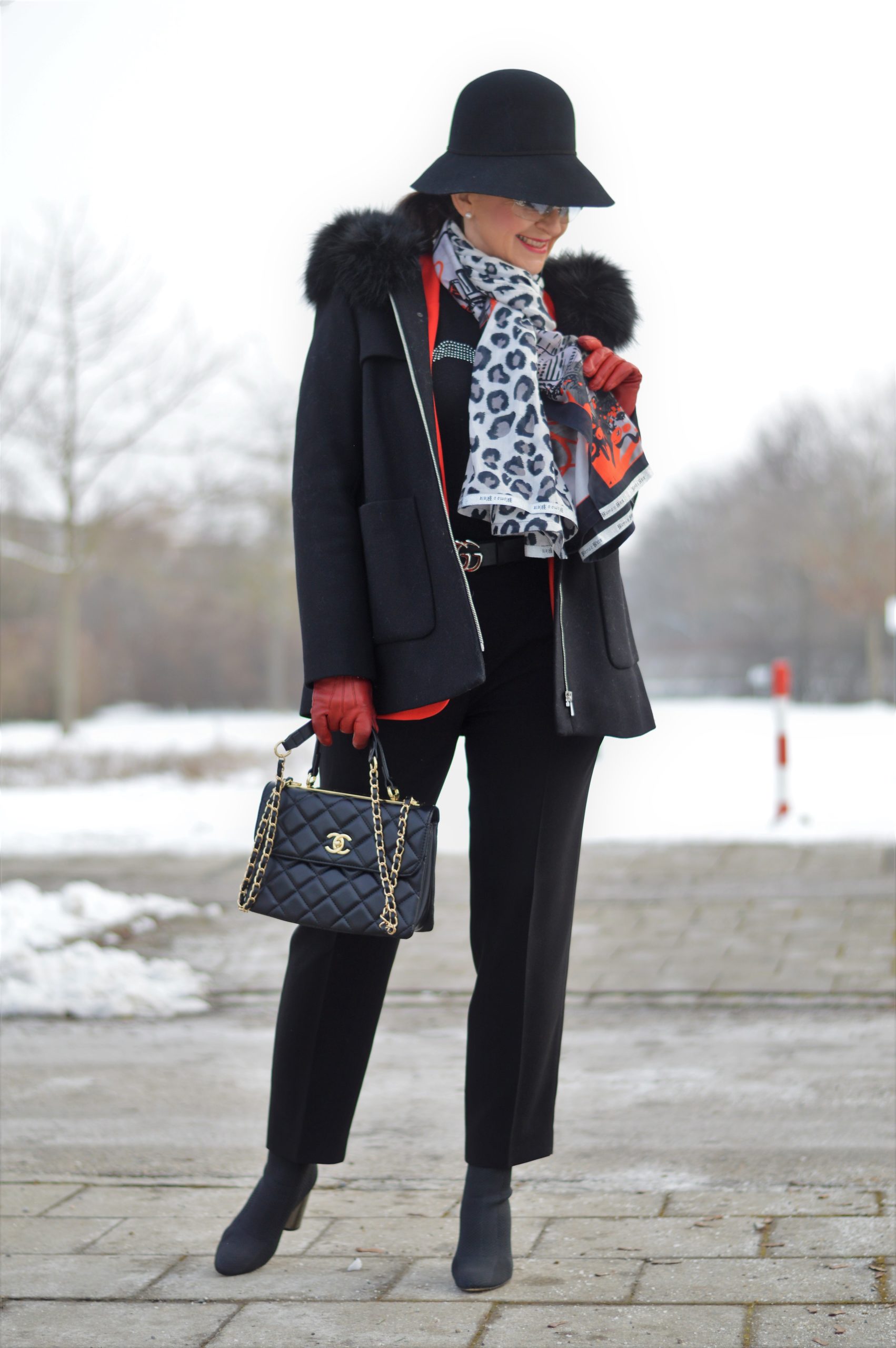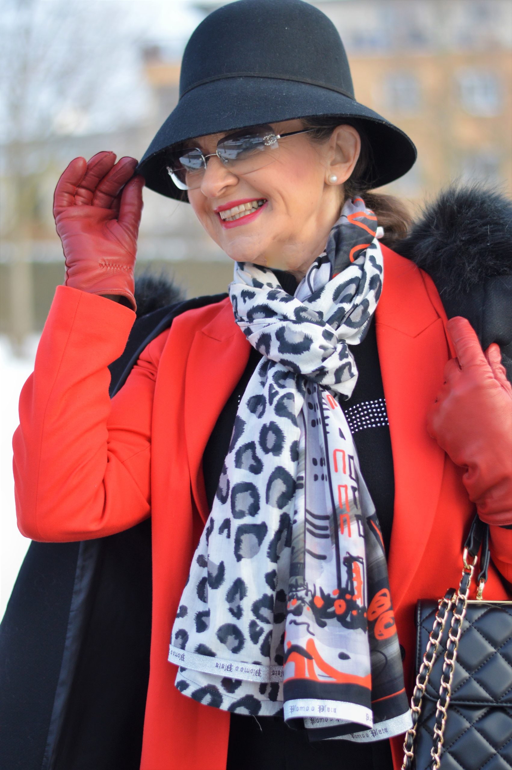 Mit einem schicken Tuch, welches in extravaganten Motiven versehen ist, bekommt der Look meinen persönlichen Stil. Die Farben schwarz-rot sind in ganz unterschiedlichem Mustermix in dem Tuch wiederzufinden. Ich trage oft ein Tuch zu meiner Garderobe, nicht nur im Winter. Mal ist es ein Tuch, mal ist es ein Schal – das wähle ich passend zum Komplettlook aus.
