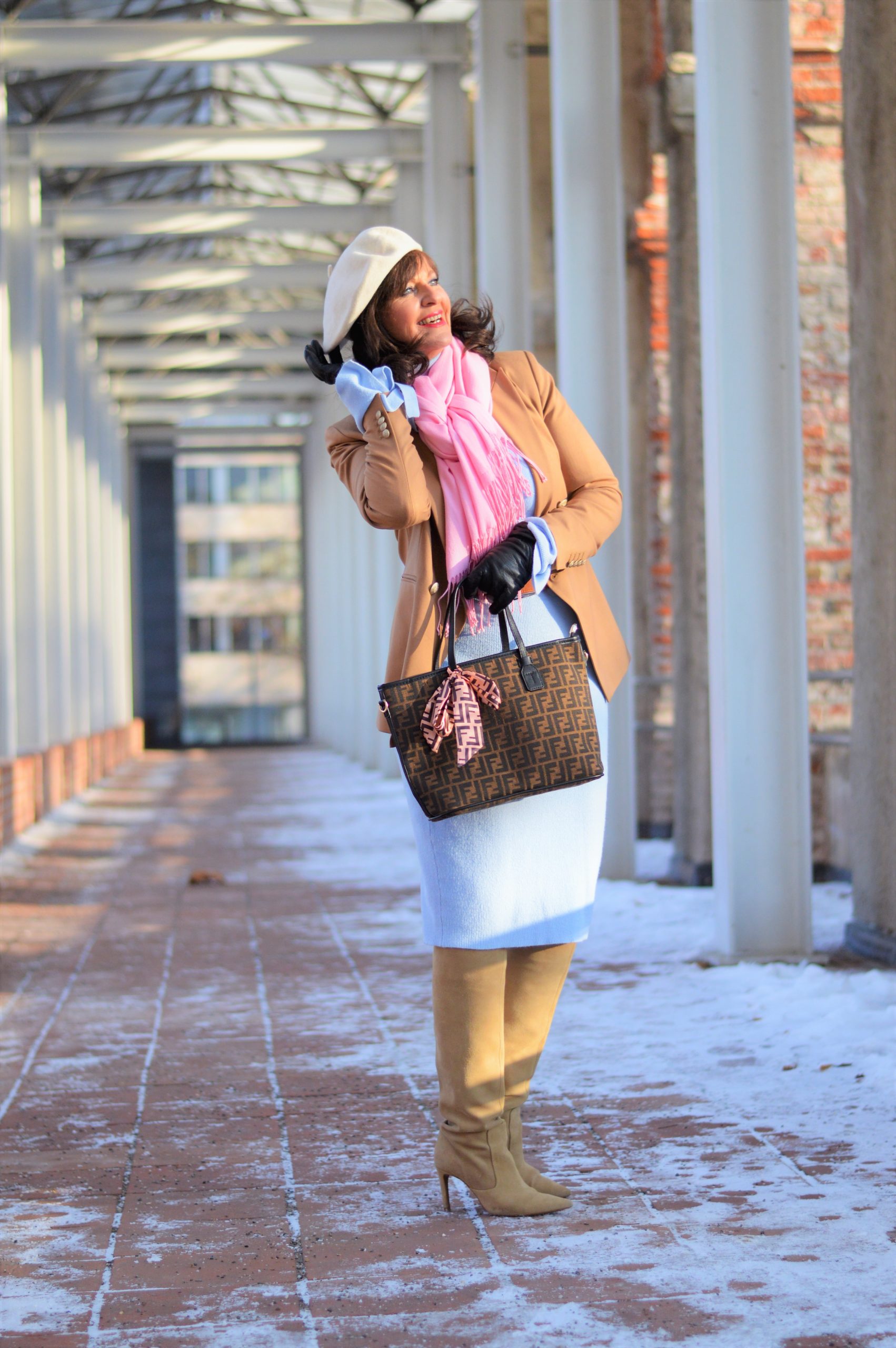 Bei dieser Kombination habe ich auf farbliche Akzente gesetzt. Wer farbliche Unterschiede liebt, greift zu einem Blazer. Ich habe mich für einen camelfarbigen Blazer entschieden. Ein schwarzer Blazer ergänzt sich ebenfalls sehr gut zum hellblauen Strickkleid.