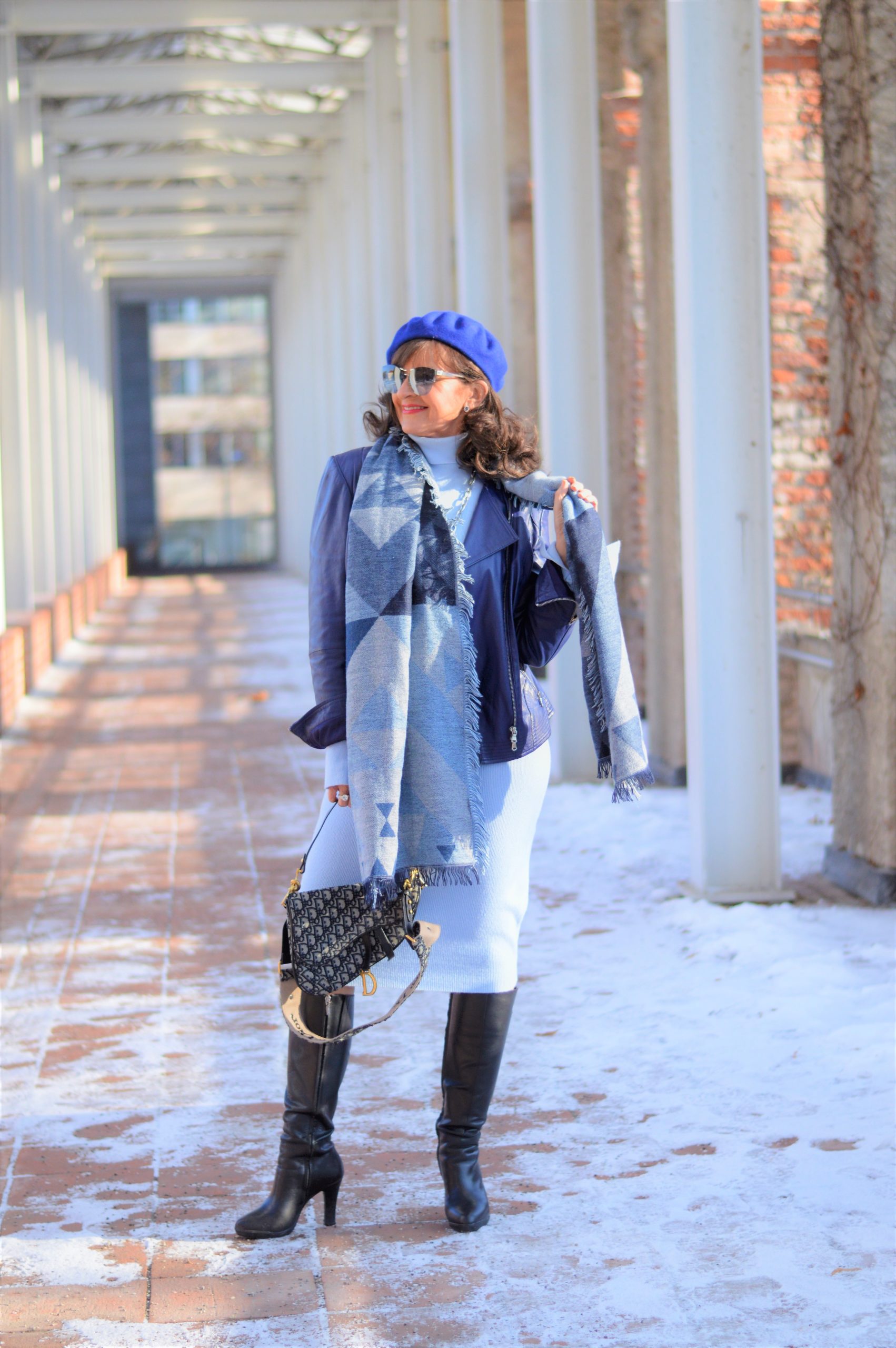 Der Look ist Ton-in-Ton, in unterschiedlichen Blauschattierungen. Das große Tuch hat verschiedene Blaunuancen und ist ein wirklicher Hingucker. Als Liebhaberin von Baretts, auch Baskenmütze genannt, trage ich mein Barett in Classic Blue dazu. War es im letzten Jahr die Trendfarbe des Jahres.