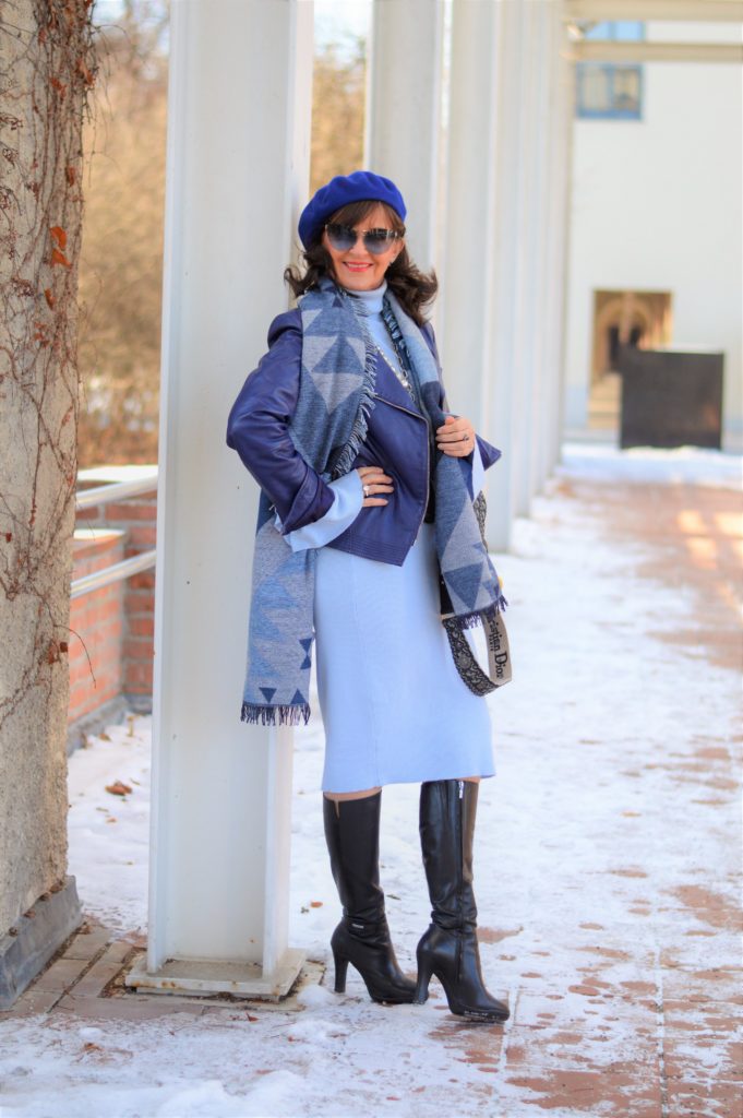 Ich zeige Dir mein aktuelles Lieblingskleid in Strick. Es ist hellblau und hat besondere Armabschlüsse. In den Wintermonaten trage ich durchaus Pastelltöne. Sie erfrischen den Look und an trüben Tagen greife ich gern zu dieser Farbigkeit.
