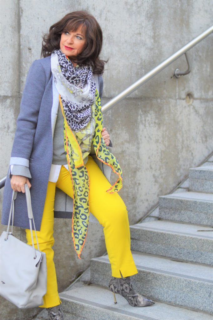 Ganz klar ist der Blickfang die gelbe Hose, die Kombi von Bluse und Pullover finde ich toll und passt dazu ausgezeichnet. Zum Glück hat Deine innere Stimme gesiegt, wäre schade gewesen um den Mantel. Die Stiefeletten, die liebe ich so, sehen dazu fantastisch aus. Das Leo-Tuch ist super und auch die Kette mag ich sehr.