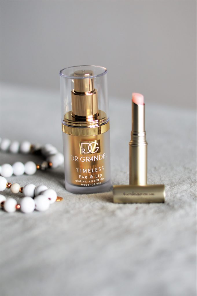 Die empfindliche Augenpartie profitiert von der richtigen Pflegetechnik. Ich trage die zarte Augencreme TIMELESS Eye & Lip ohne grobes Reiben und Zerren auf. Damit verhindert man unnötige Faltenbildung. Nur eine kleine Menge der Augen- und Lippenpflege Dr. Grandel Eye & Lip gebe ich auf meinen Ringfinger. Von außen nach innen, und zwar in kreisenden Bewegungen creme ich den Augenbereich ein. Wenn es die Zeit erlaubt, male ich quasi eine liegende Acht um meine Augenpartie. Das entspannt und beruhigt den Augenbereich.