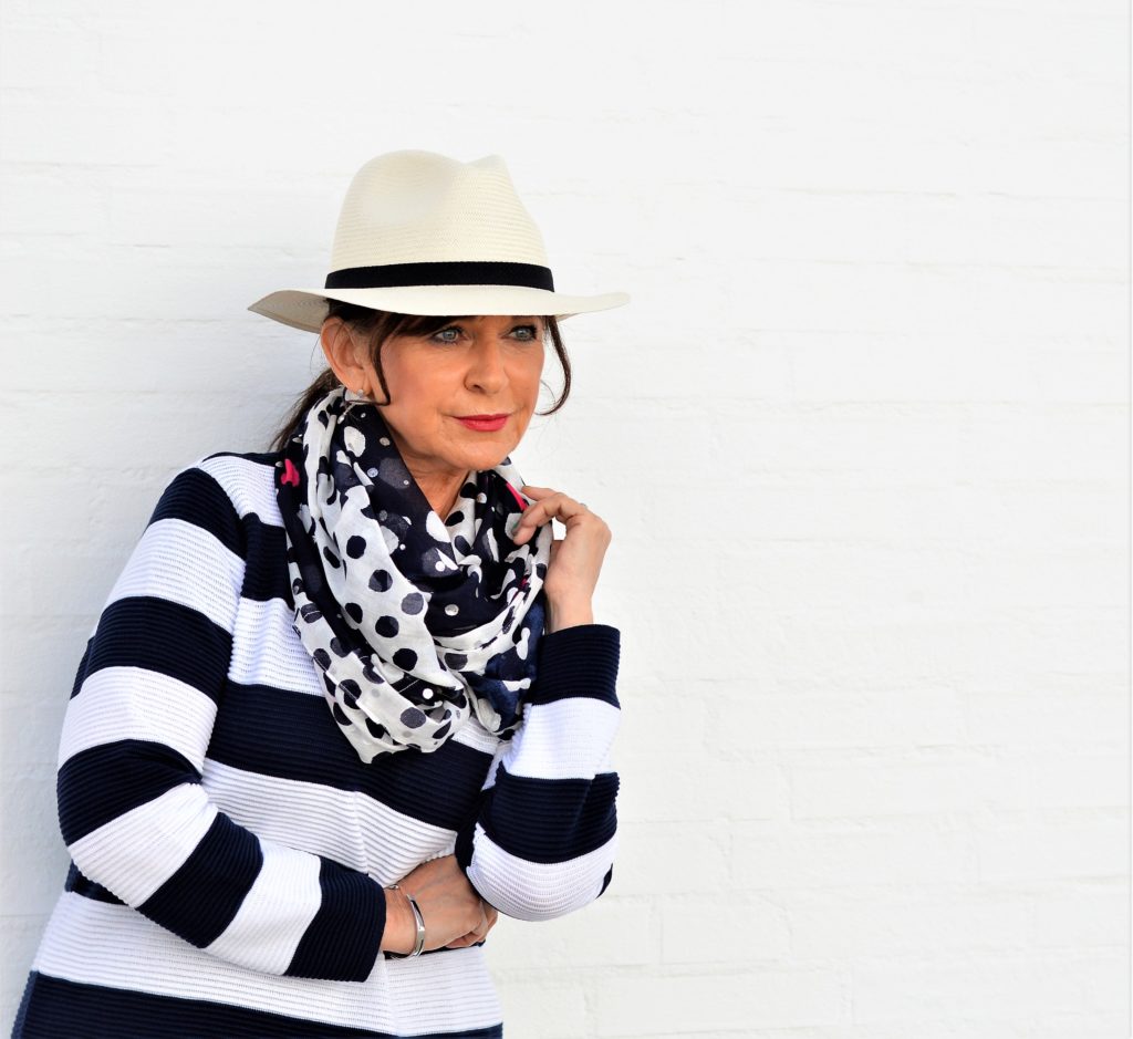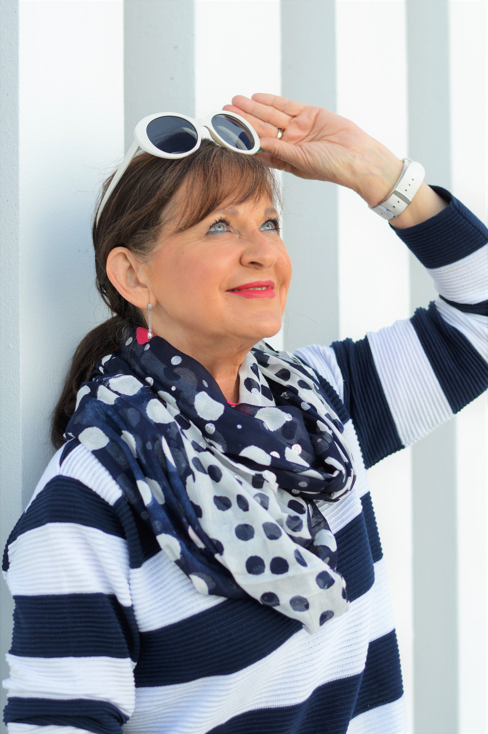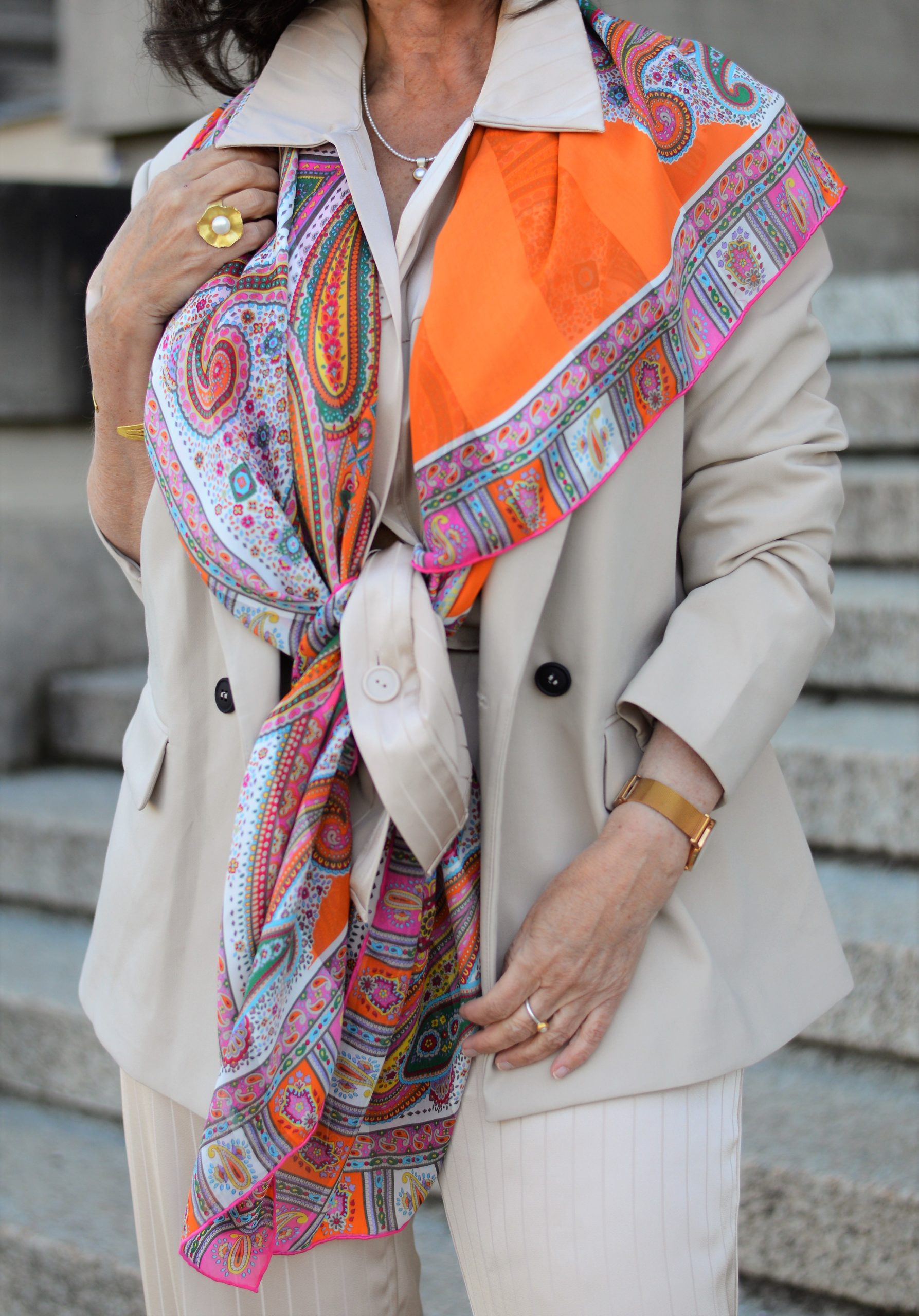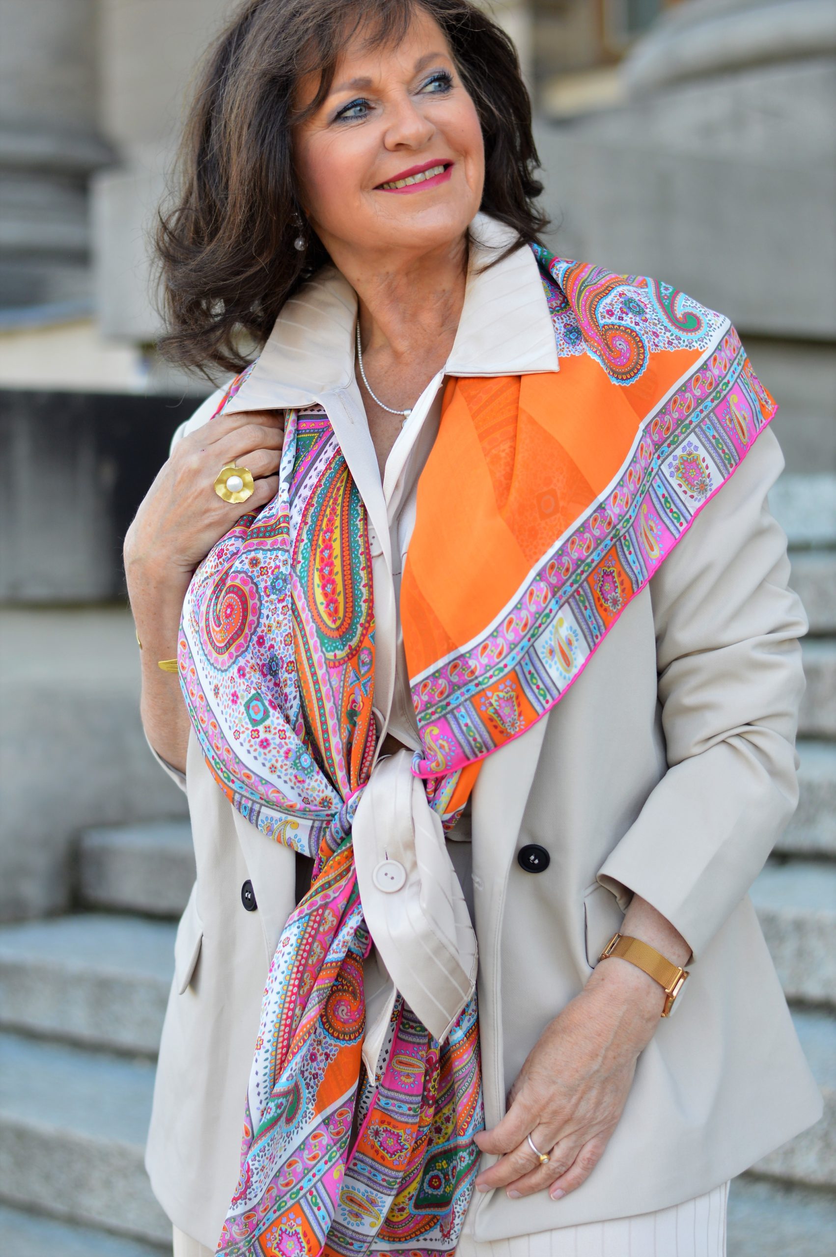 Deinen Blog sehe ich sehr gerne und ich habe eine Frage dazu. Ich selbst bin noch nicht „50+“, aber Mitte Vierzig, und mein Modegeschmack ist sehr dicht an Deinem – besonders liebe ich Halstücher, Nickitücher seit meiner Jugendzeit. Ich habe bloss das Gefühl, daß die vielleicht „out“ sind und bin etwas unsicher deshalb. Am liebsten trage ich zur weißen Bluse Nicki Halstücher ordentlich gebügelt und als Band gelegt, zur Seite, nach vorn oder auch nach hinten geknotet – kann ich das noch tragen und wie findest Du diese Looks?
