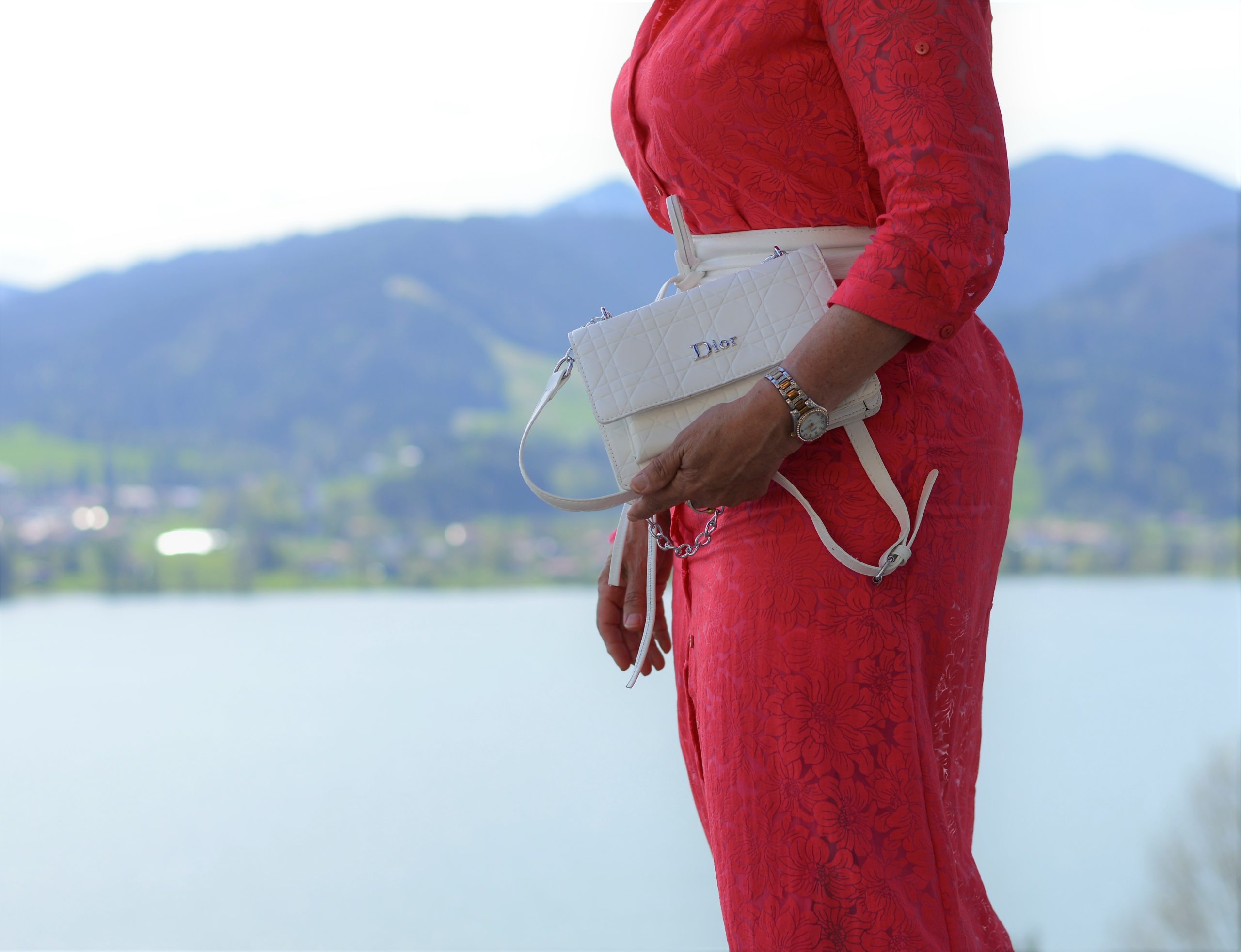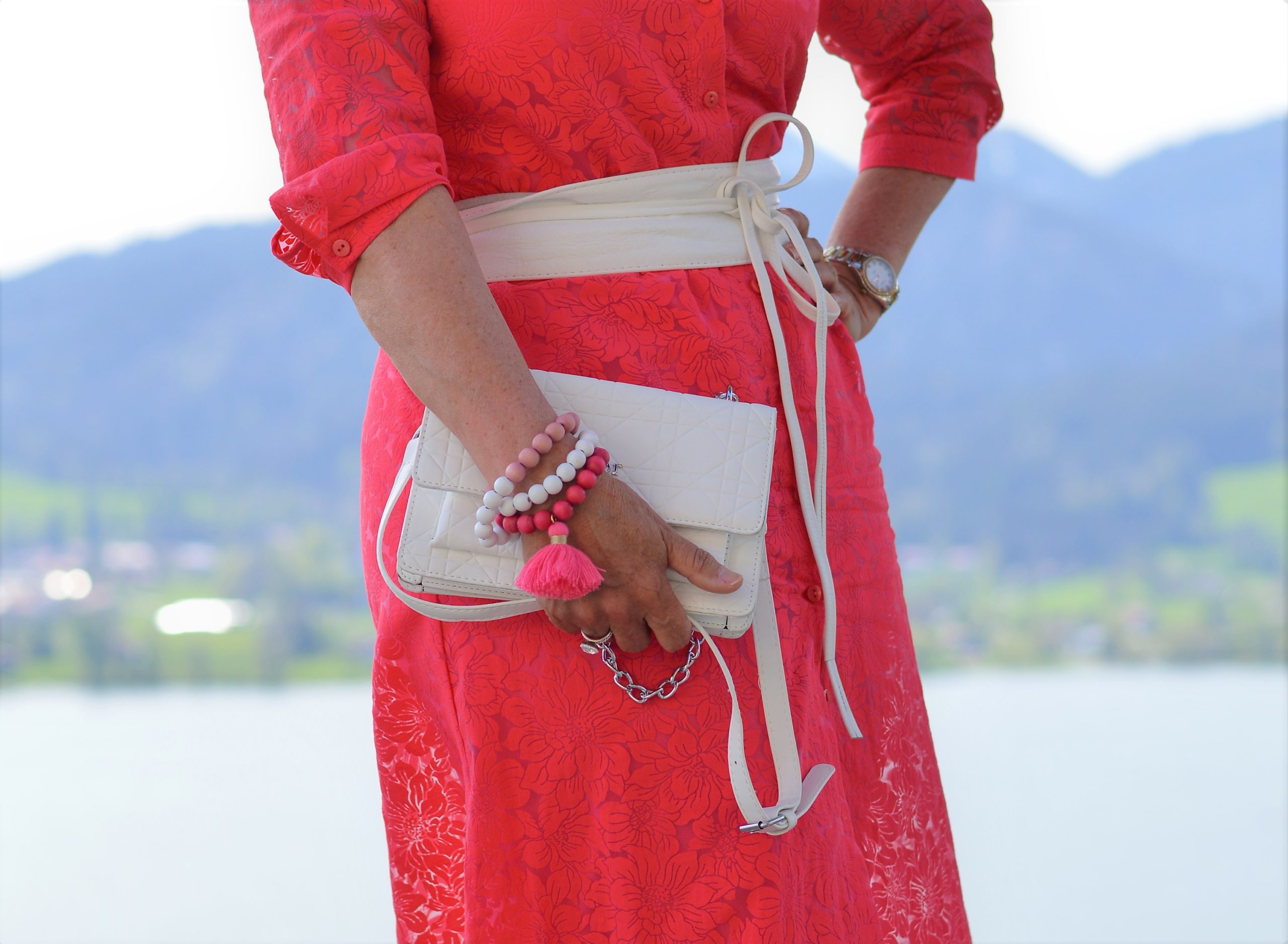 Die sommerliche Handtasche gehört zum Kleid auf jeden Fall dazu. Welche Farbe hebt sich gut von diesem charmanten Koralle ab? Ich finde weiß ist eine gute Ergänzung. Vor allem wenn der Gürtel in weiß dazu getragen wird. Ich bin kein Freund von weißen Schuhen. Deshalb habe ich es absolut neutral mit der Schuhauswahl gehalten. Ein schicker zeitloser und stilvoller Sling-Pumps gefällt mir für den femininen Look am besten.