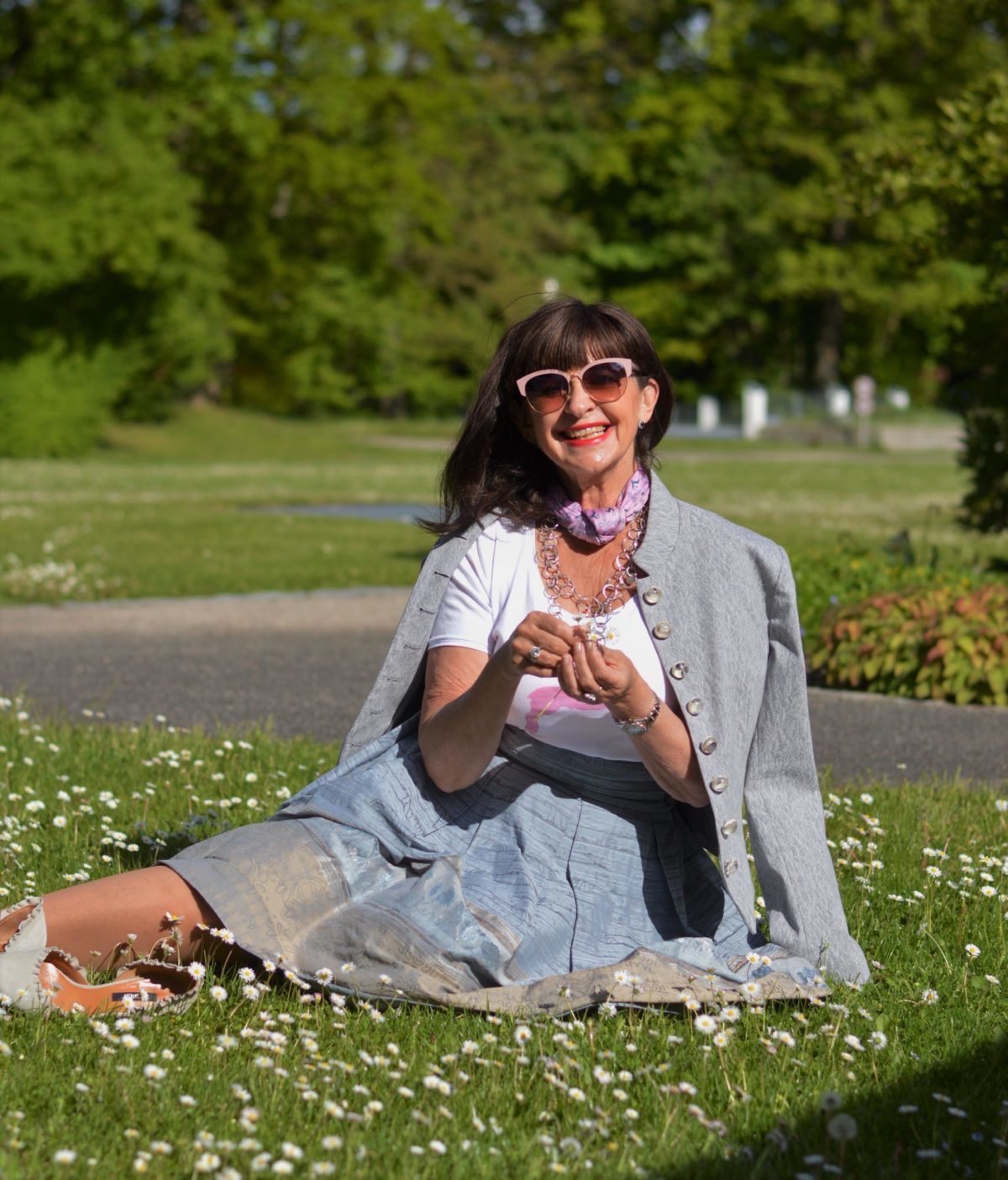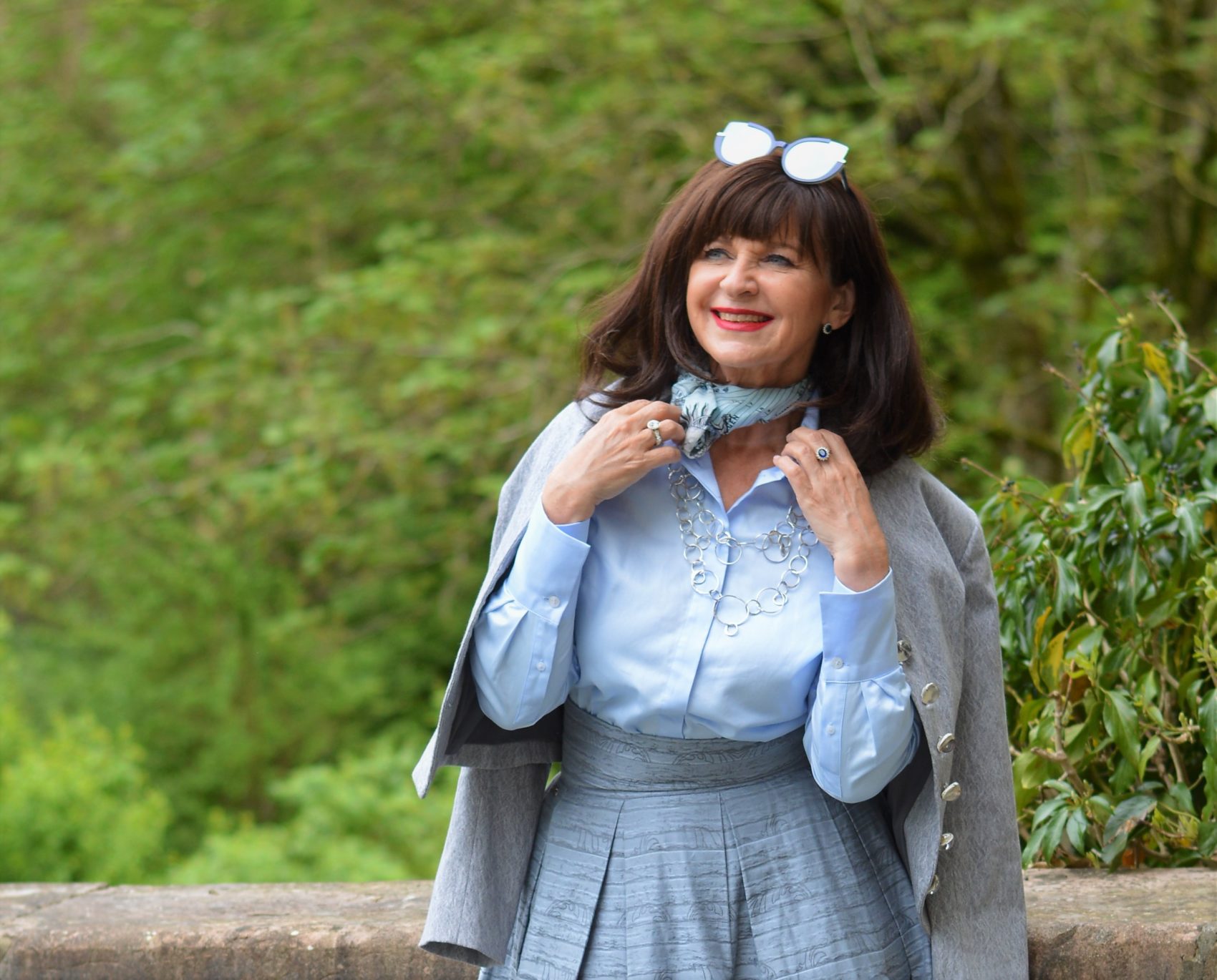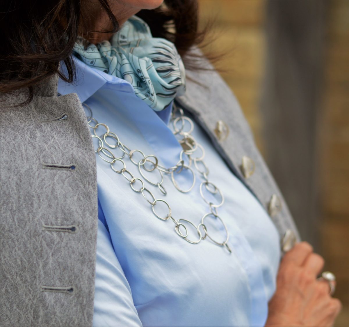 Diese Outfit Idee gehört zu den Ton-in-Ton-Looks. Eine duftige Bluse in hellblau passt sehr gut zur Grundfarbe des Rocks. Als Eyecatcher trage ich ein kleines Halstuch. Besonders apart wirkt zur 1. Outfit Idee die handgefertigte Kette in Silber aus dem Hause MM MADAME aus Hamburg.