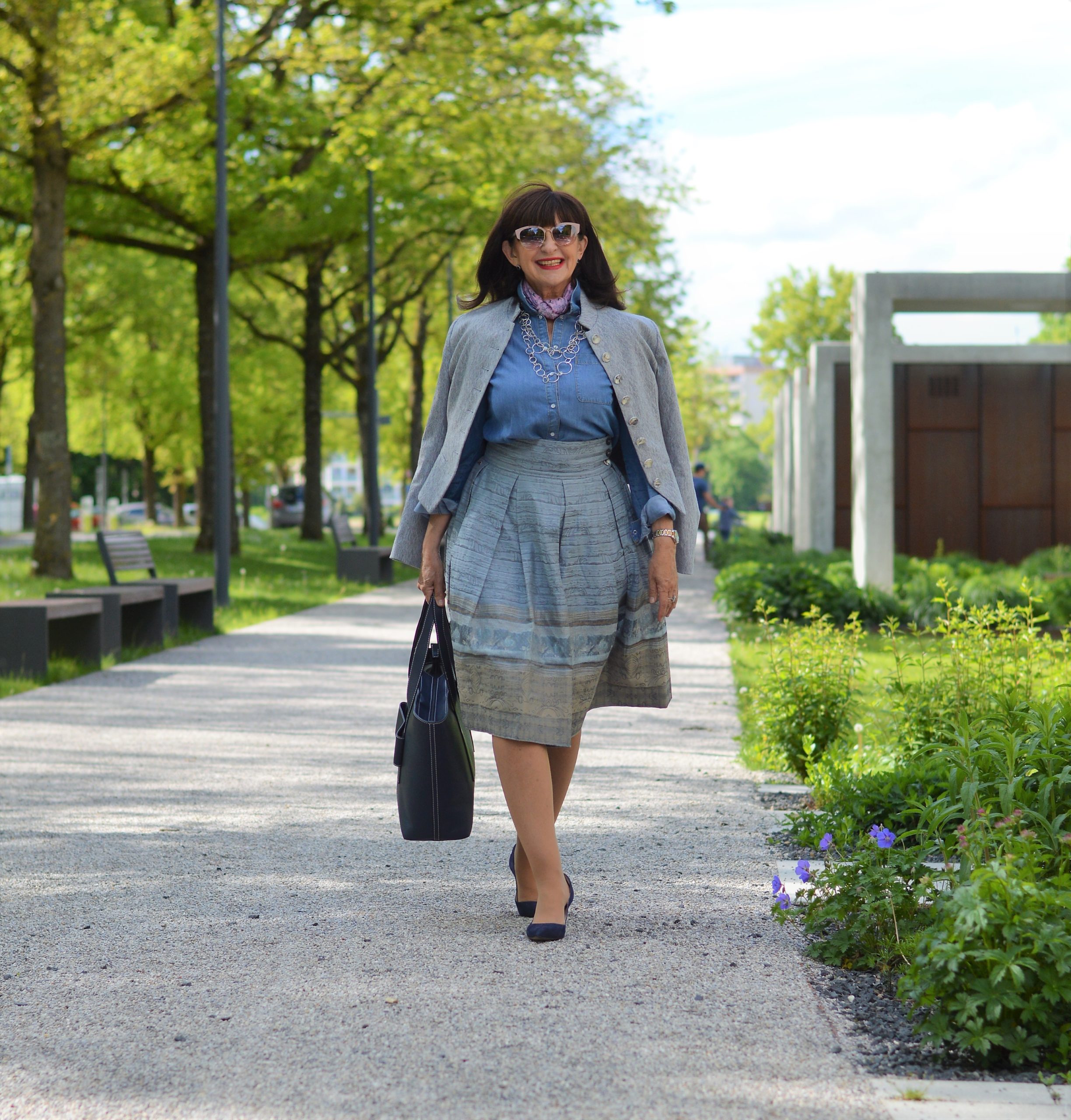 Moderne Trachtenmode und das beliebte Jeanshemd. Diese vielseitige Denim-Bluse – ich finde die Begrifflichkeit Bluse schöner als Hemd – findet aktuell wieder großen Anklang. Egal wo wir Denim-Kombinationen sehen, die Jeansbluse ist stets dabei. Als Accessoire greife ich zum rosefarbenen Halstuch und zur edlen Halskette in Silber. Die exklusive Business-Tasche ist der richtige Begleiter für einen abwechslungsreichen und sehr terminlastigen Tag.
