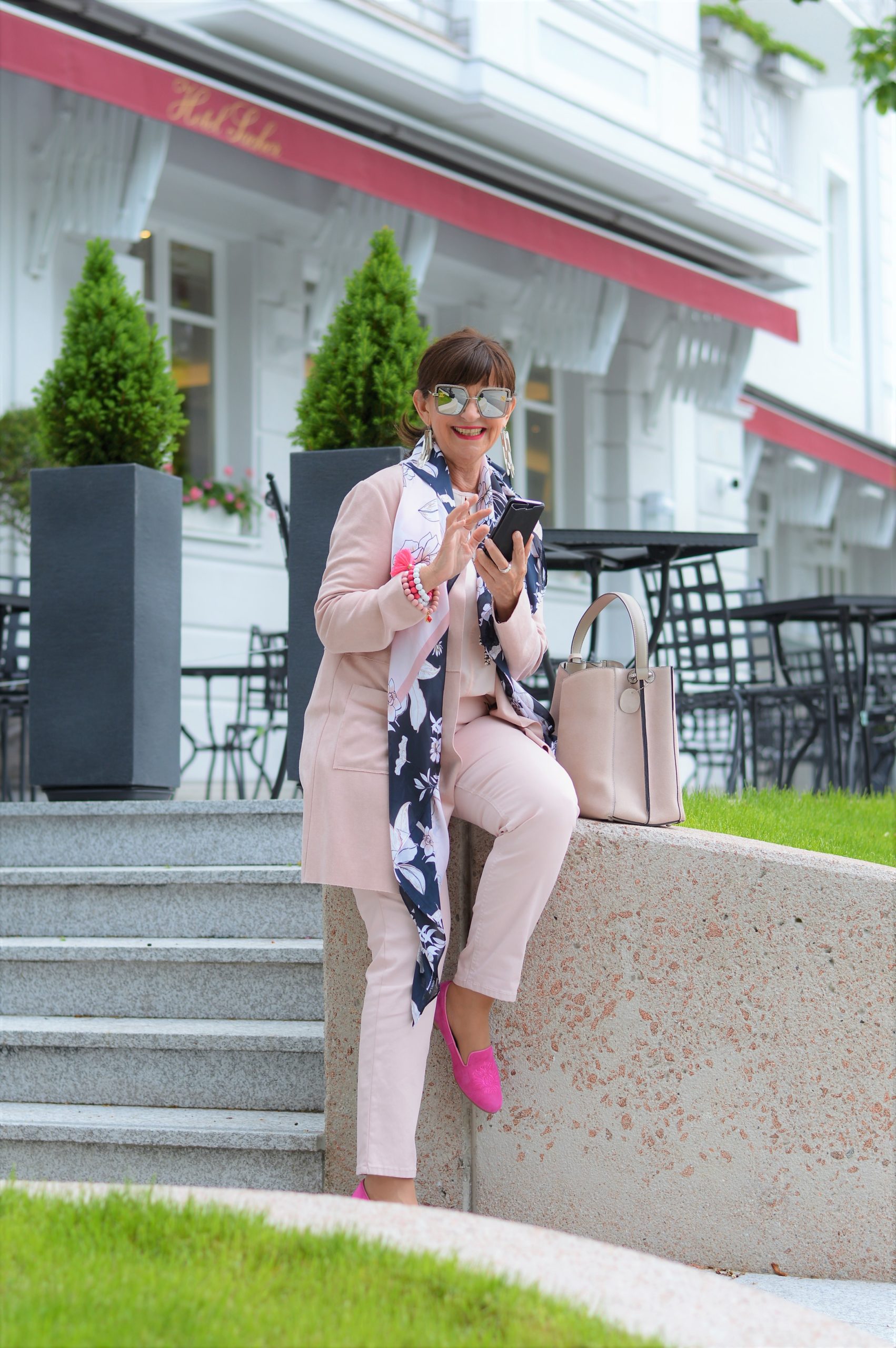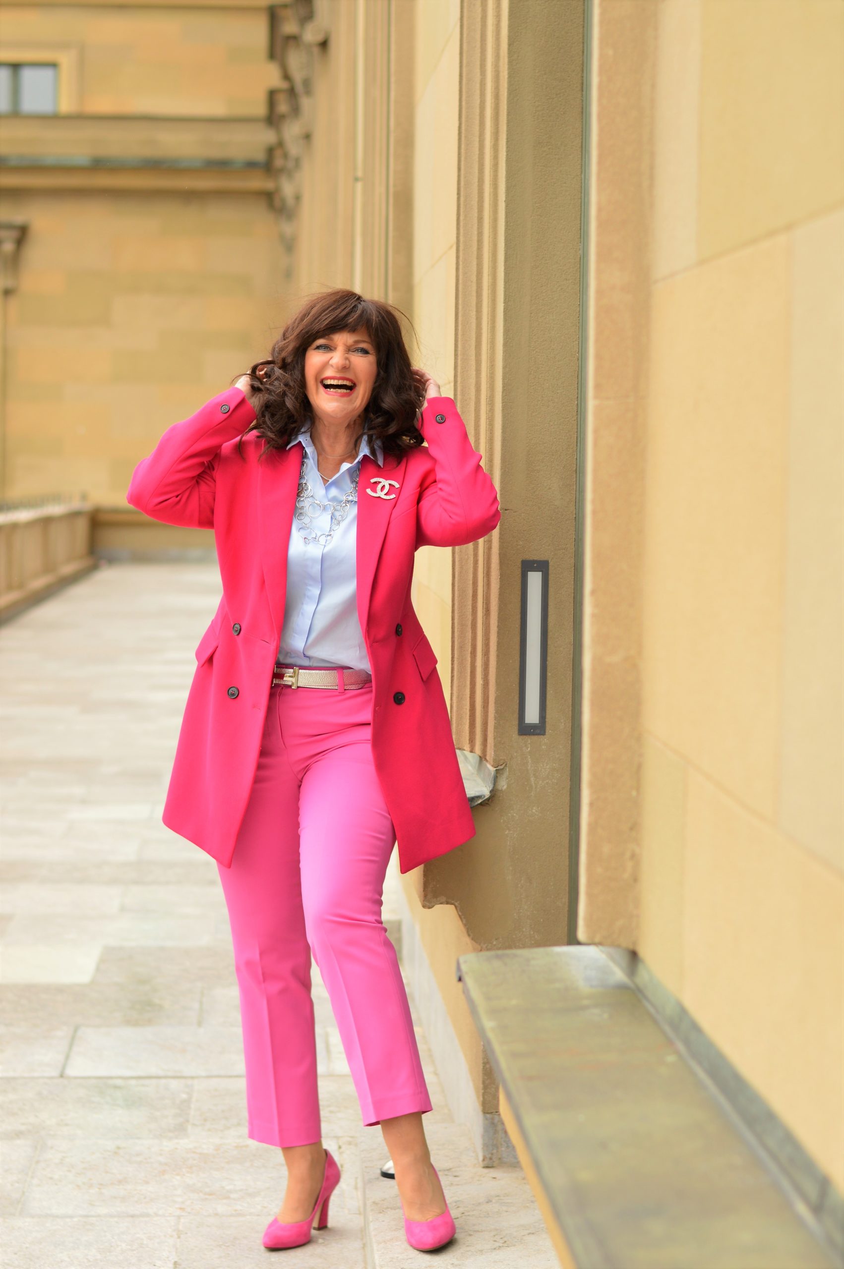 Der pinke Longblazer wird mit einer pinken City Hose kombiniert. Darunter trage ich eine hellblaue sommerleichte Baumwollbluse. Die passenden Schuhe sind farbharmonisch auf meinen Pretty-in-Pink-Look absolut ab.