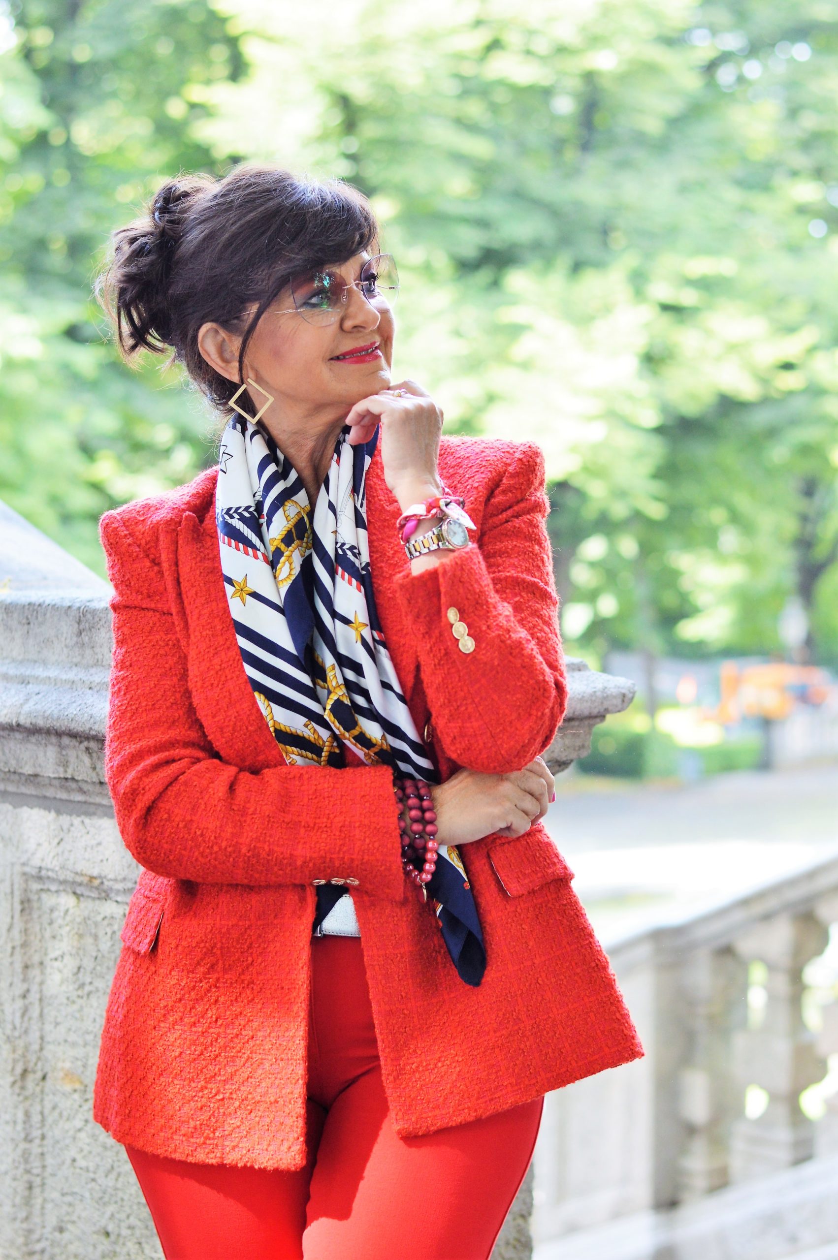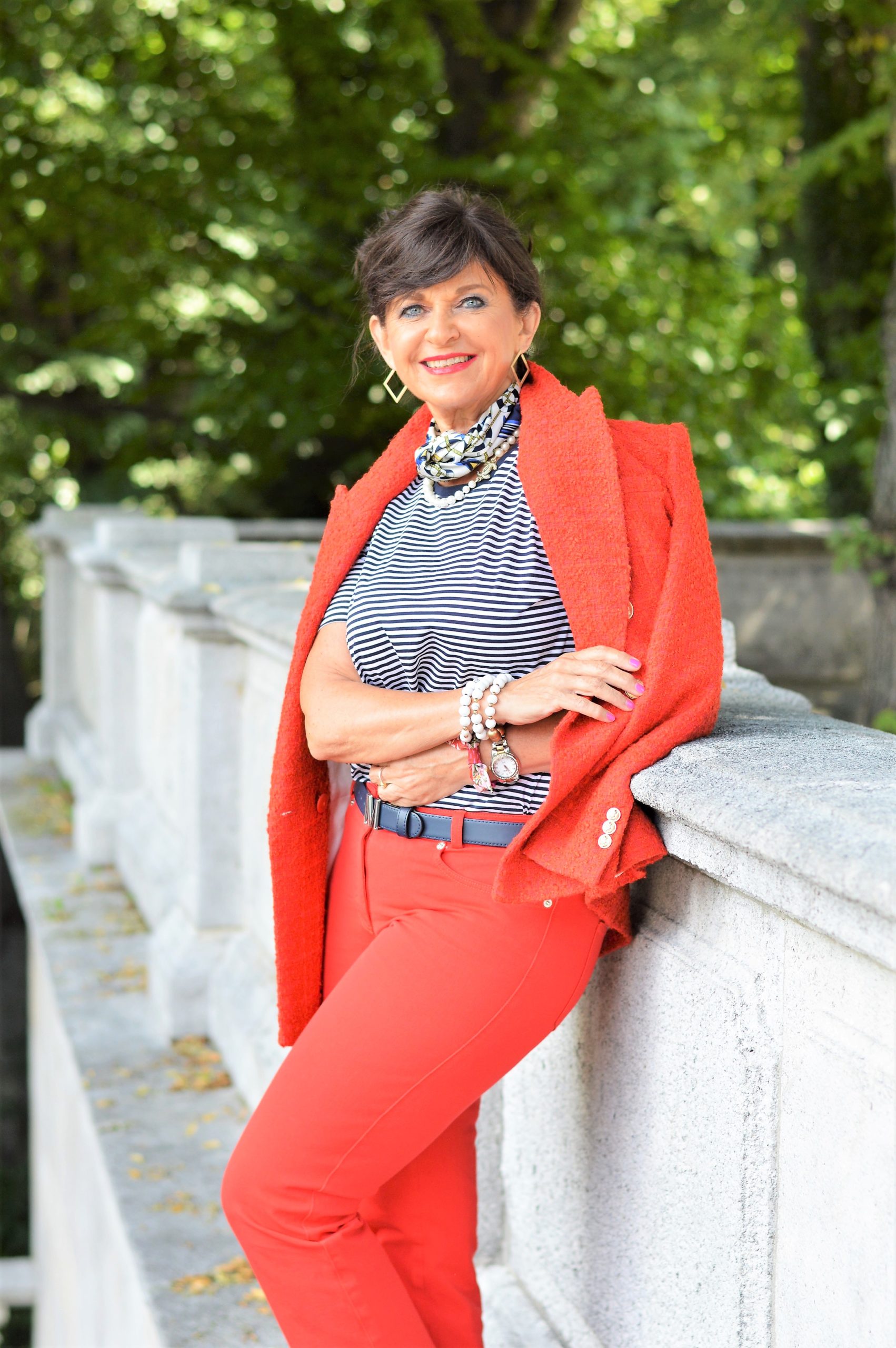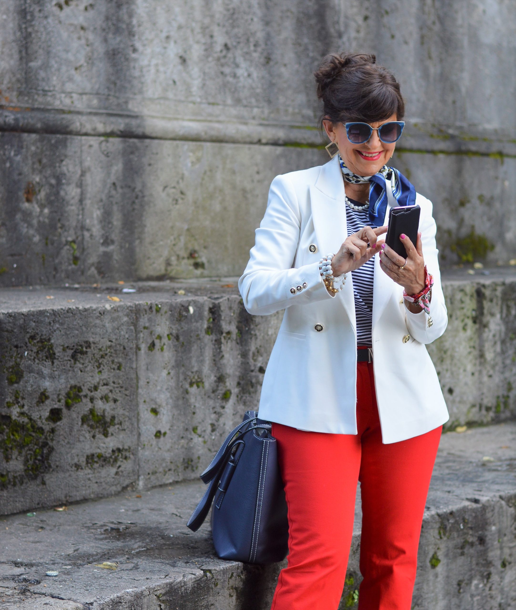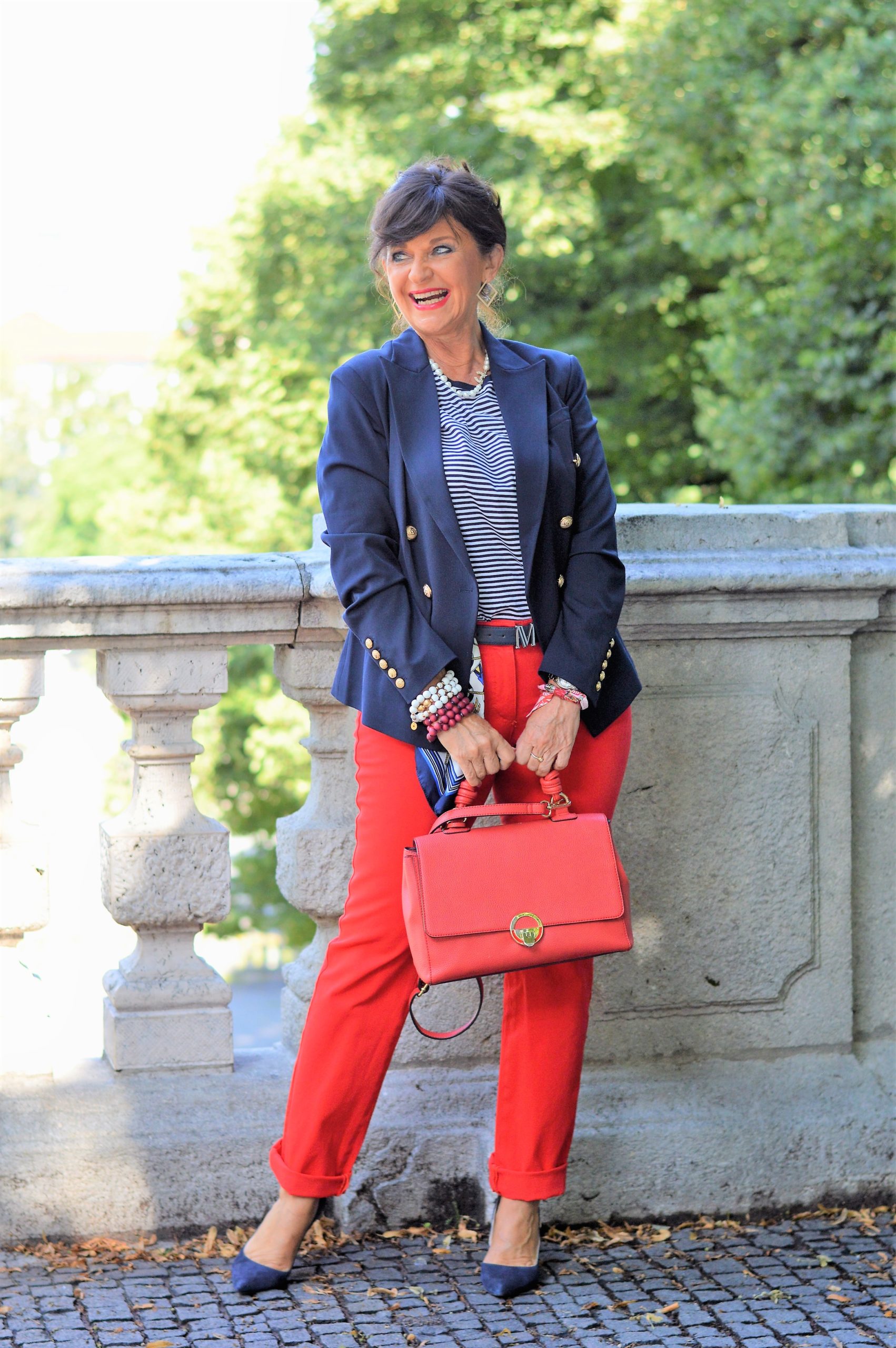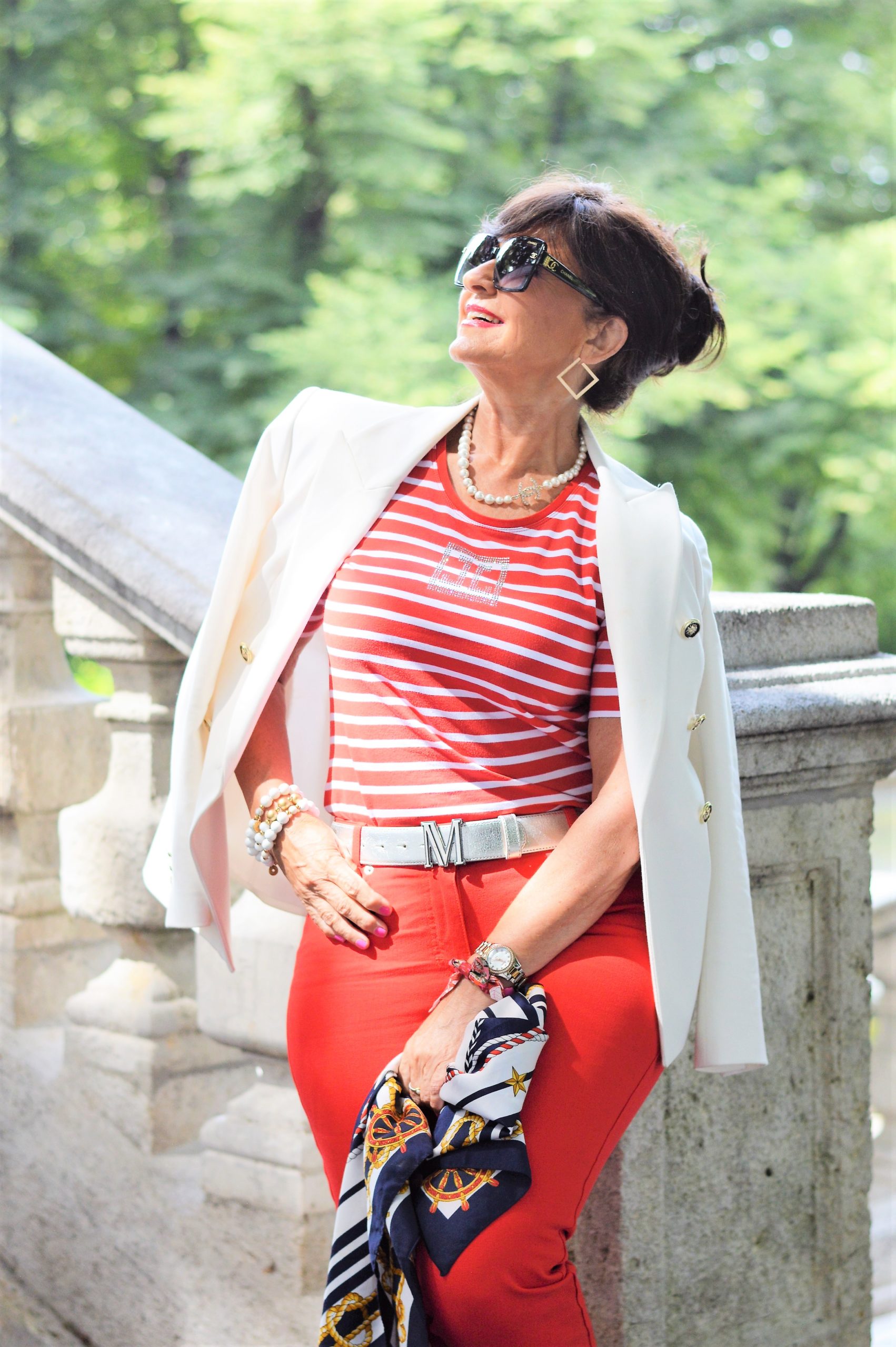 Die rote Jeans und der rote Boulce Blazer sind ein Outfit mit Hingucker-Effekt. Klar, eine Frau, die ganz in Rot gekleidet ist fällt auf jeden Fall etwas mehr auf. Der Marine Look besteht zwar aus den drei Farben Rot – Weiß – Blau. Eine kleine Abwandlung habe ich mir trotzdem getraut.