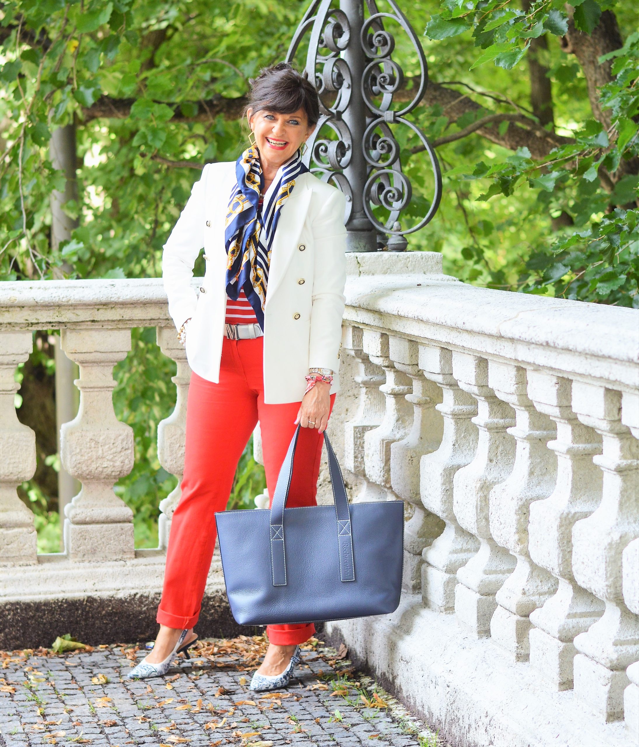 vielleicht konnte ich Dich zu einer roten Hose inspirieren. Deine Wahl mit einer weißen oder blauen Hose ist natürlich genauso schön. Falls Du keine rote Hose hast, hast Du vielleicht einen roten Rock – damit kannst Du die Styling Tipps ebenfalls umsetzen.