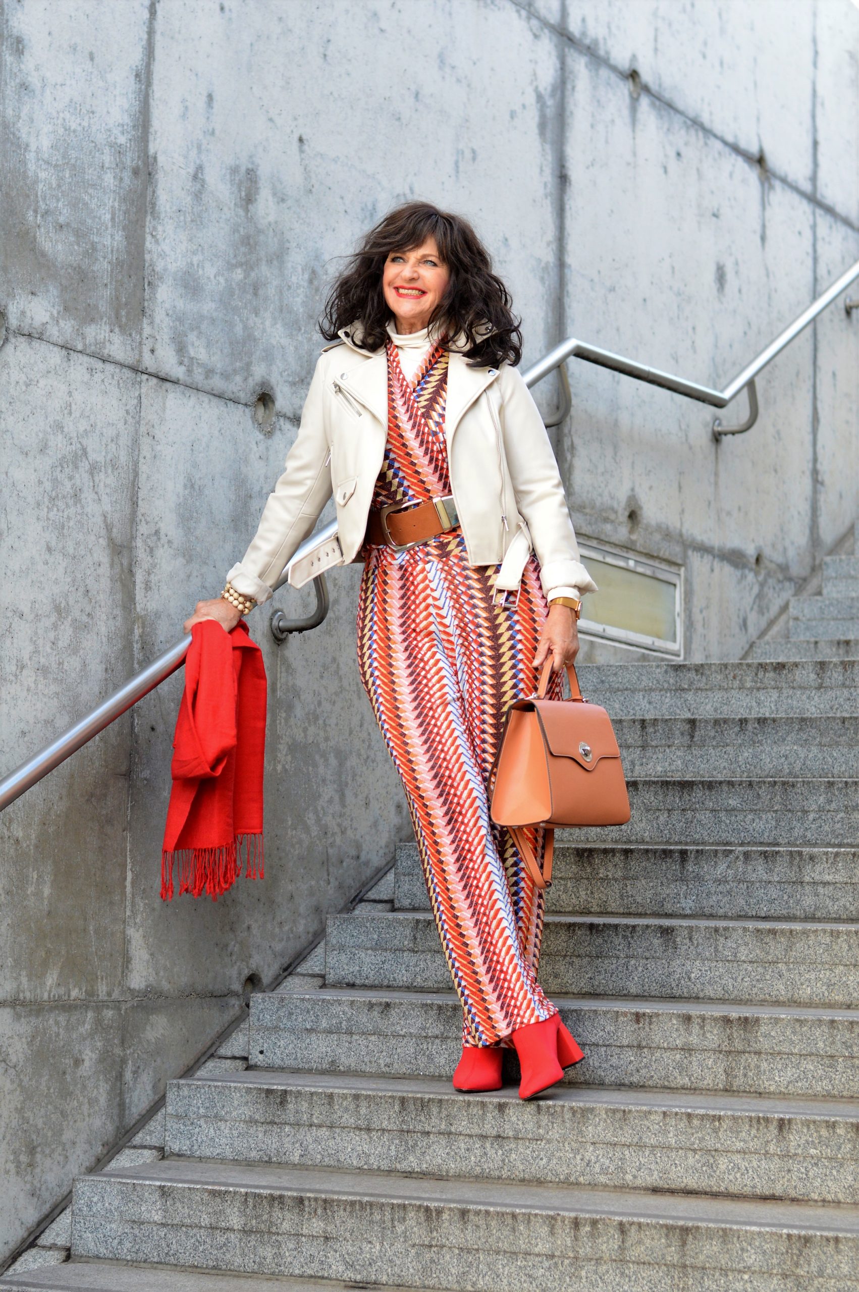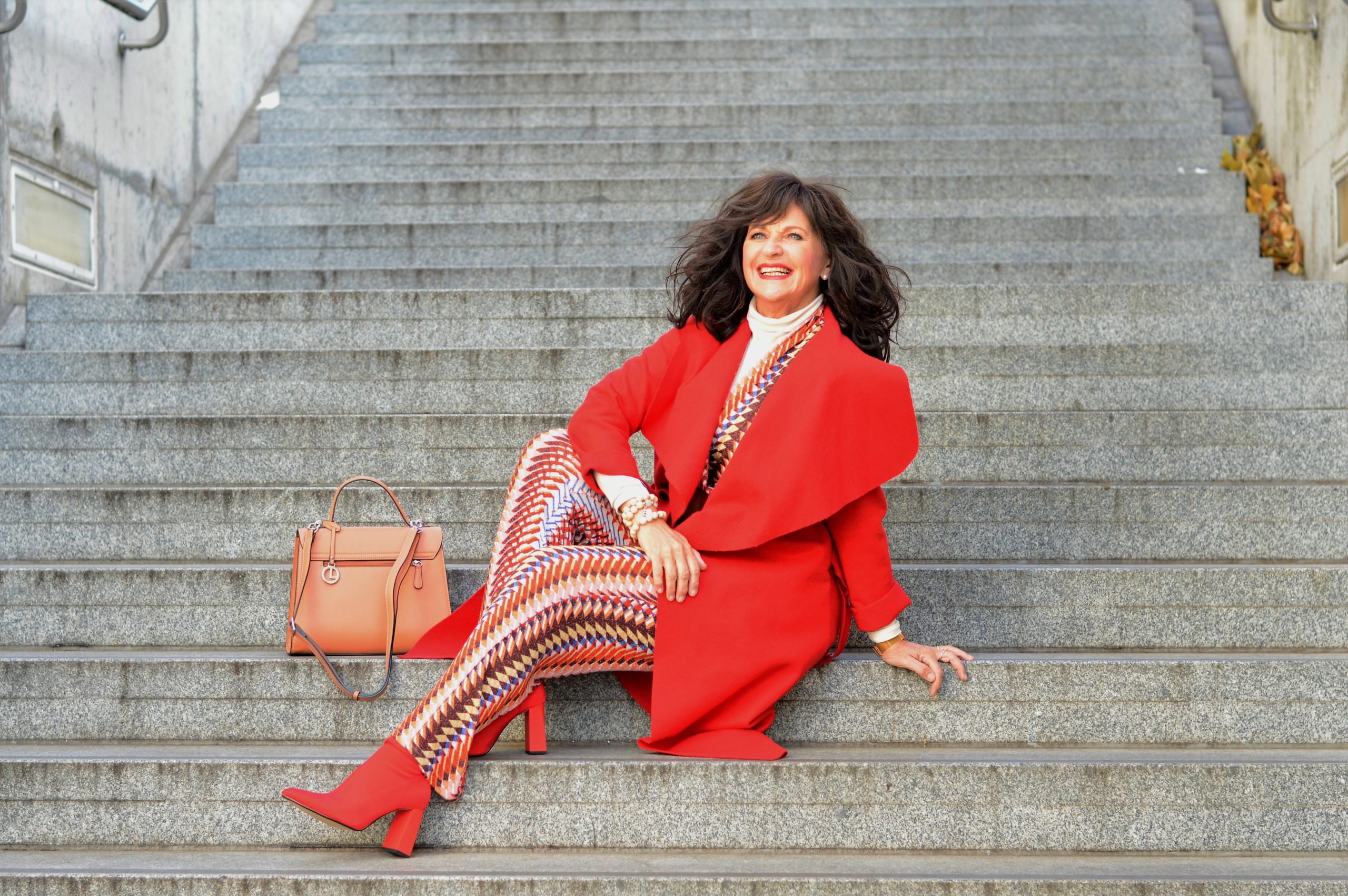 - Ein leichter Seidenrolli ist unter dem Jumpsuit genial zu kombinieren. Ich empfehle helle Farben, die Deinem Teint schmeicheln. Darüber kombiniere ich einen roten Strickmantel. Rote Accessoires dazu geben dem Look den WOW-Effekt.
