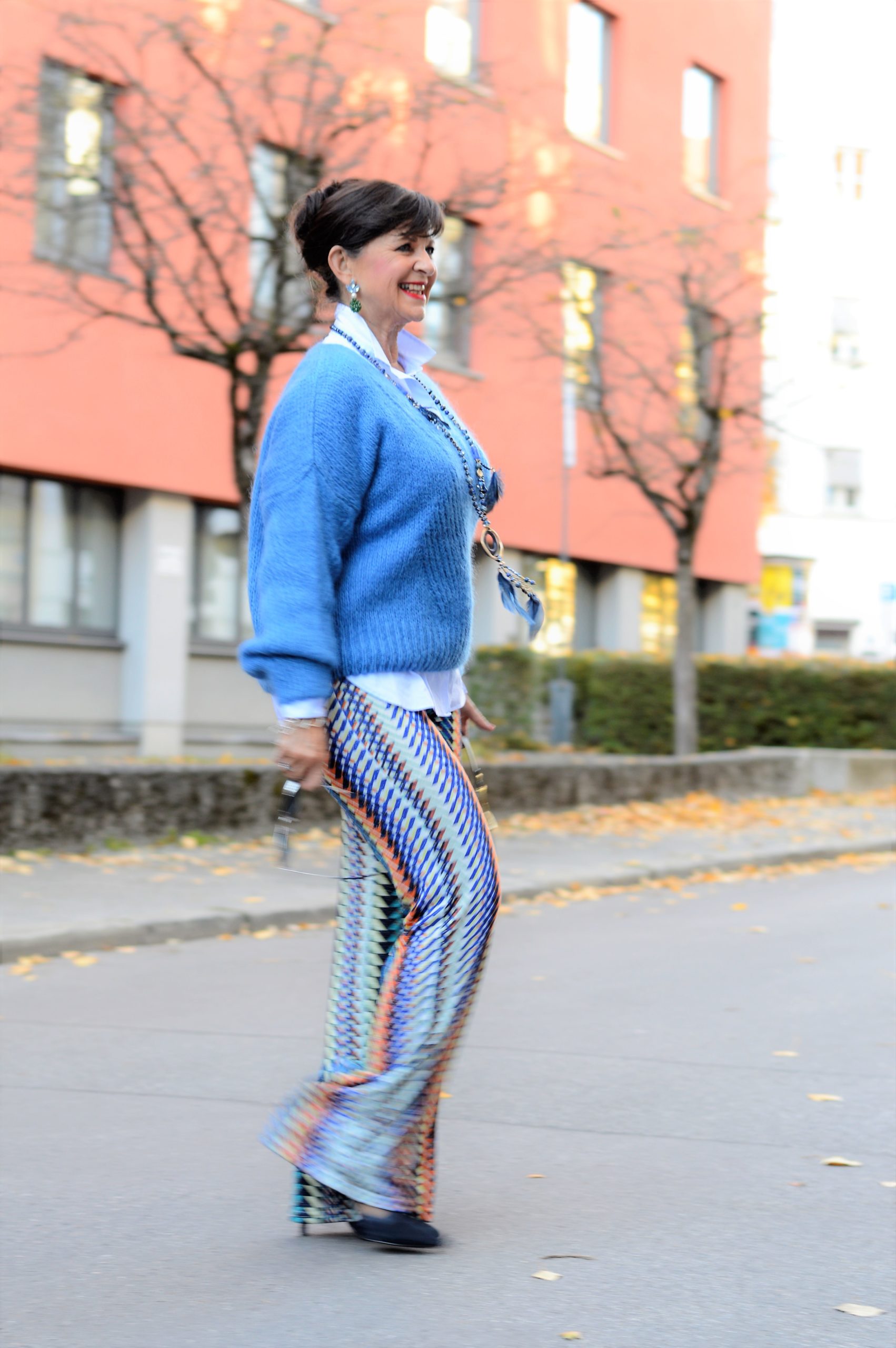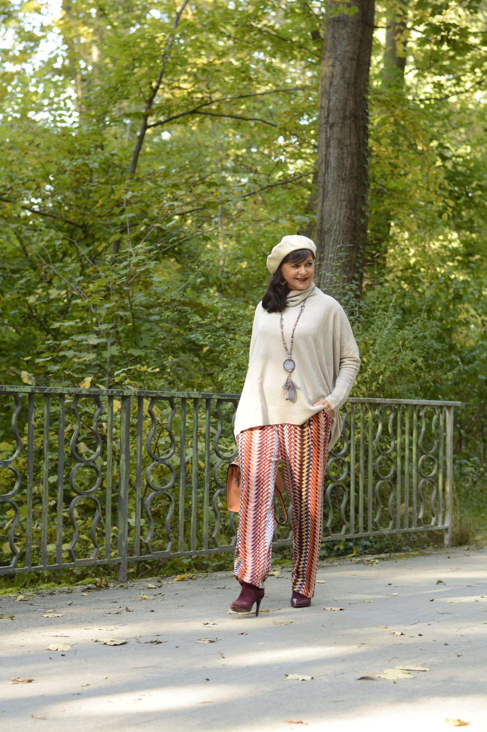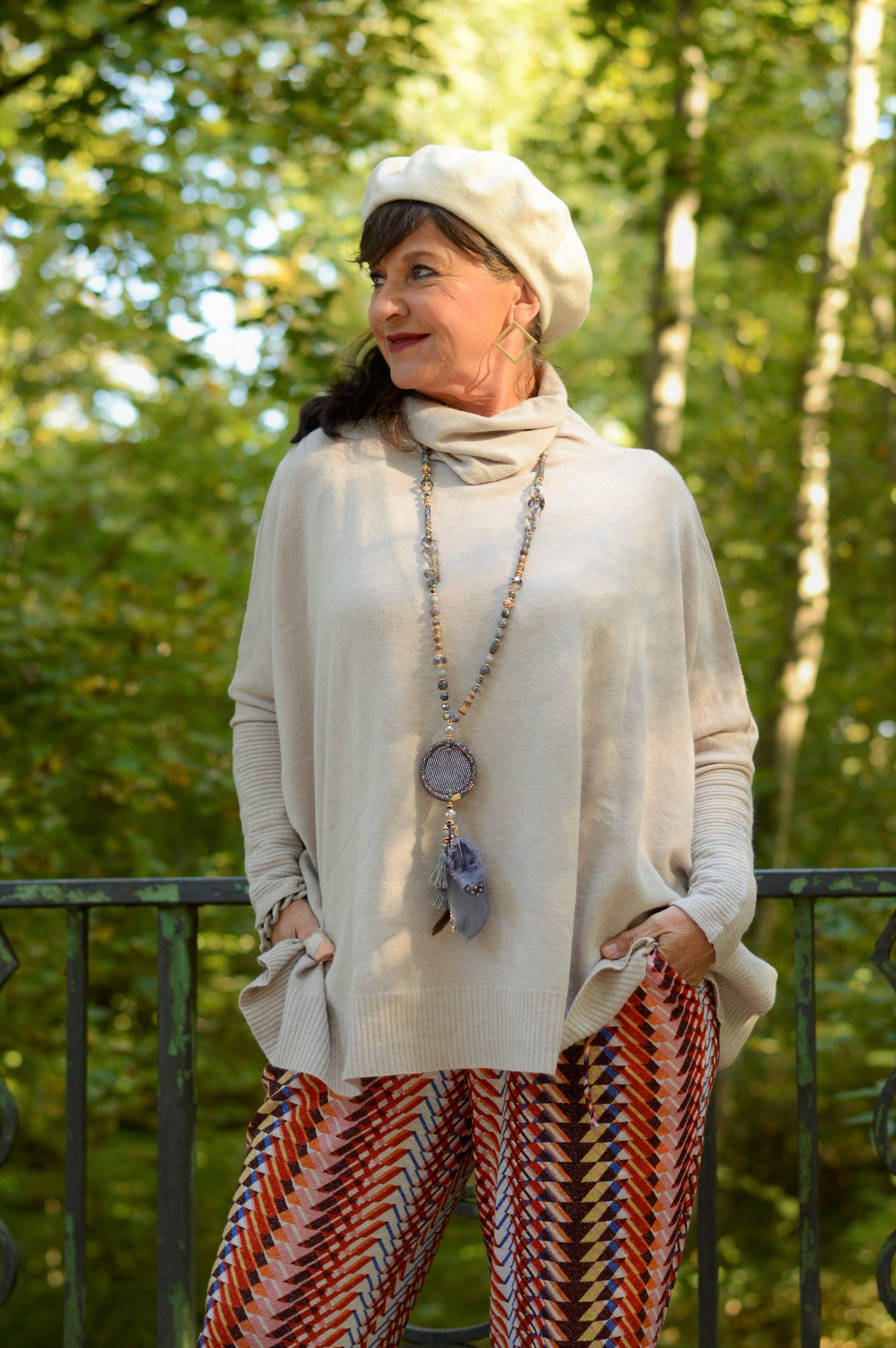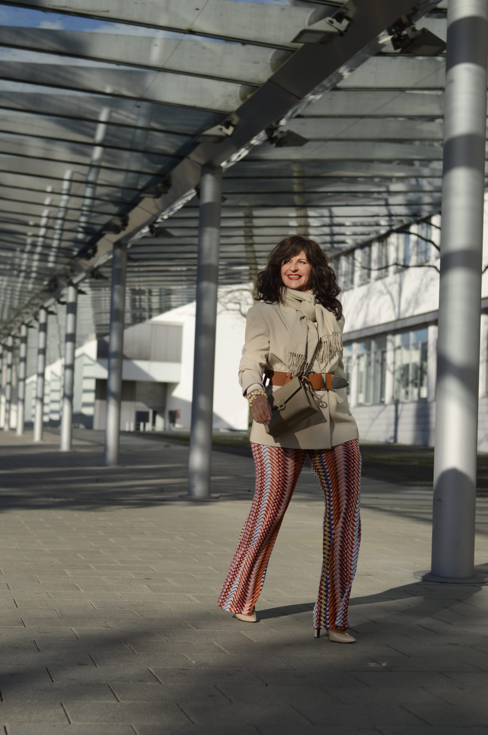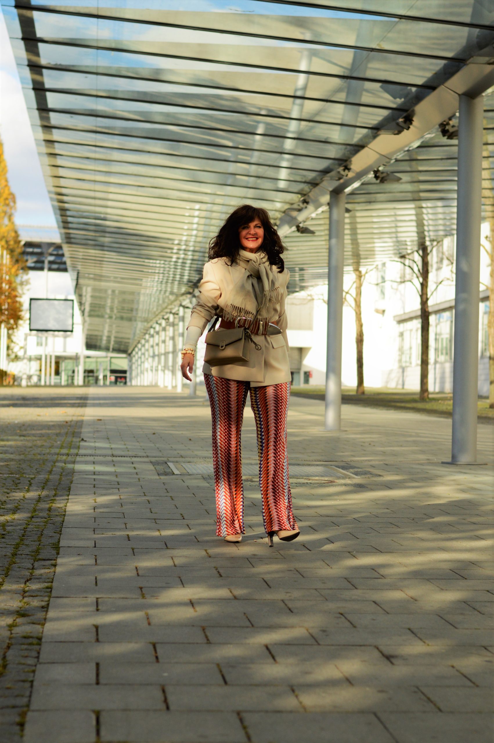 Kleidung wirkt in Bewegung immer anders als nur auf einem Foto. Ich habe zur Hose ein tolles Video auf meinem Instagram-Account eingestellt. Da könnt ihr die Hose mit Blazer und einer weiteren Kombination mit kuscheligem Pulli sehen. Zum Pulli trage ich einen kuscheligen Schal. Dazu gibt es einen neuen Bindetipp für XL-Schals im Herbst.