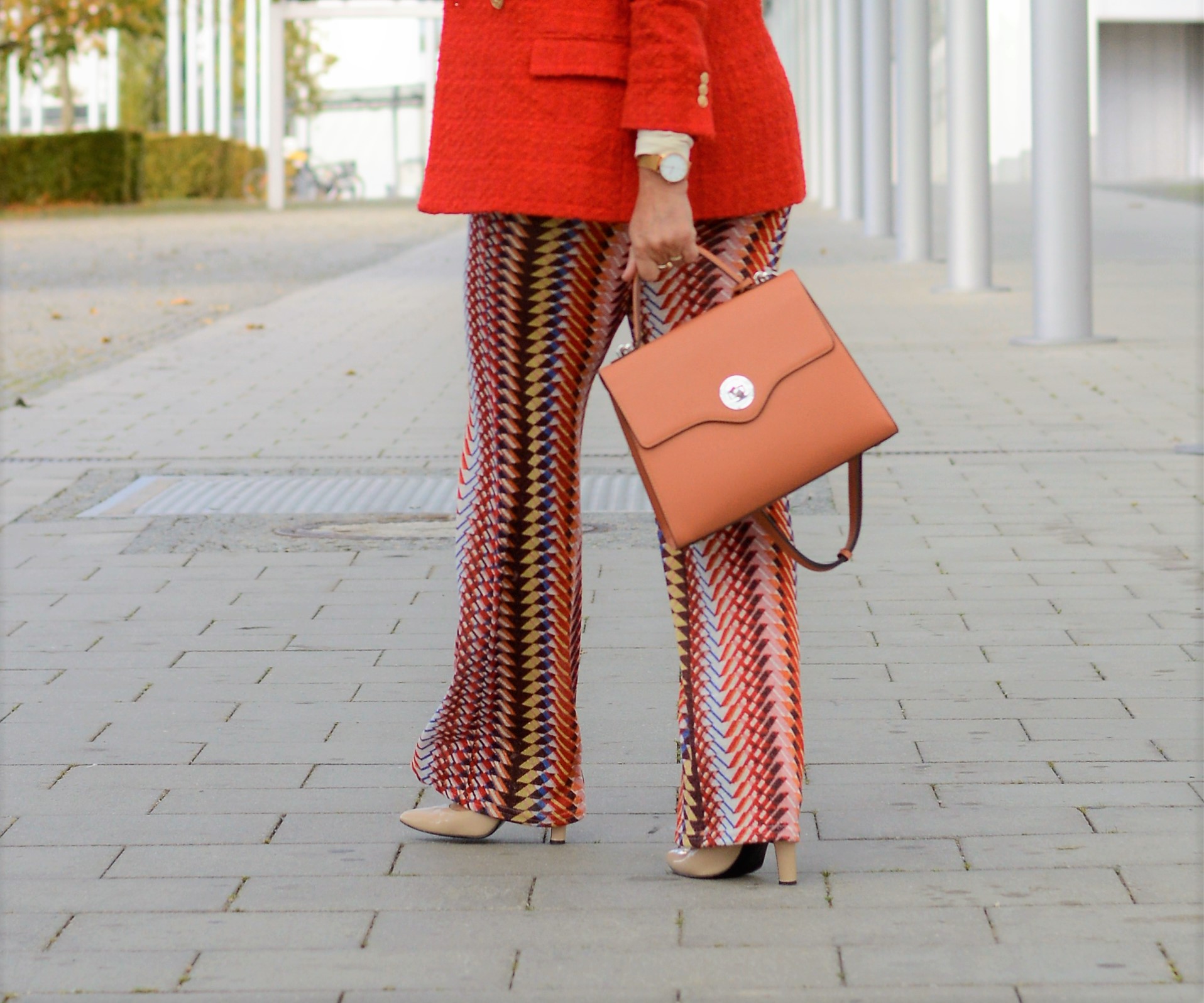 - Hose und Blazer – egal, ob rot oder beige, beide Farben passen genial zur Saison und zur Hose. Unter den Blazer kombiniere ich im Herbst sehr gerne einen leichten Rolli. Das lässt den Look sehr clean erscheinen. Außerdem können dazu zahlreiche Schals getragen werden.