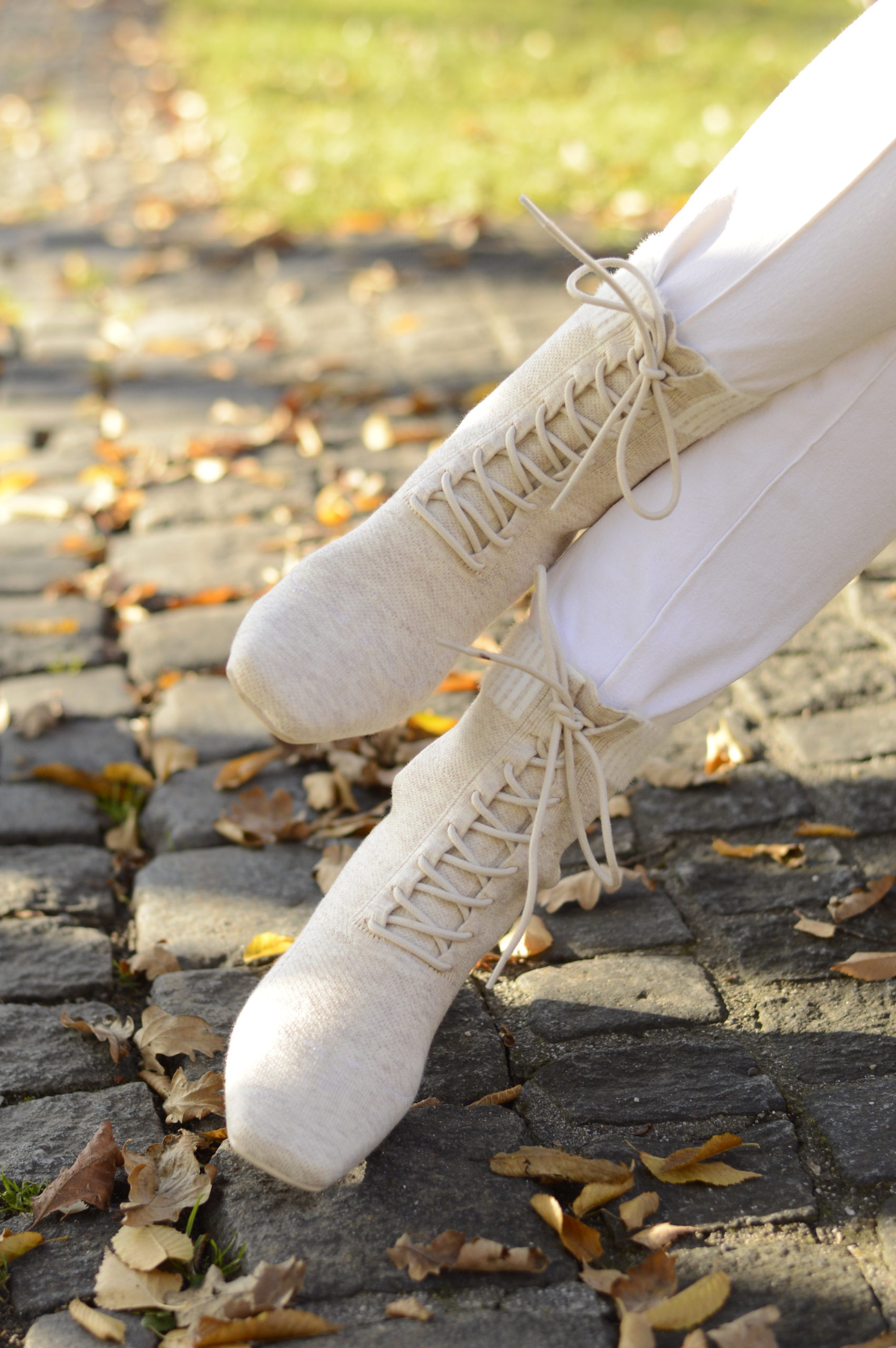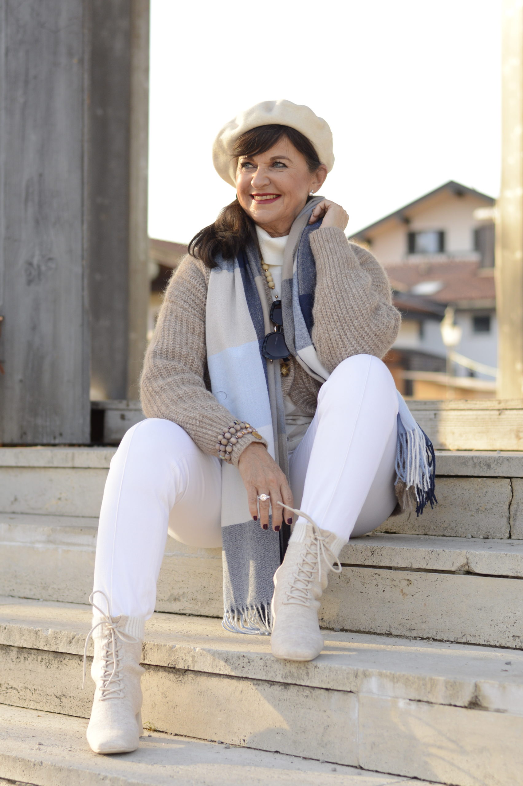 Monochromer Look mit heller Hose, hellem Pulli, hellen Stiefeletten und ein Schal darf niemals fehlen