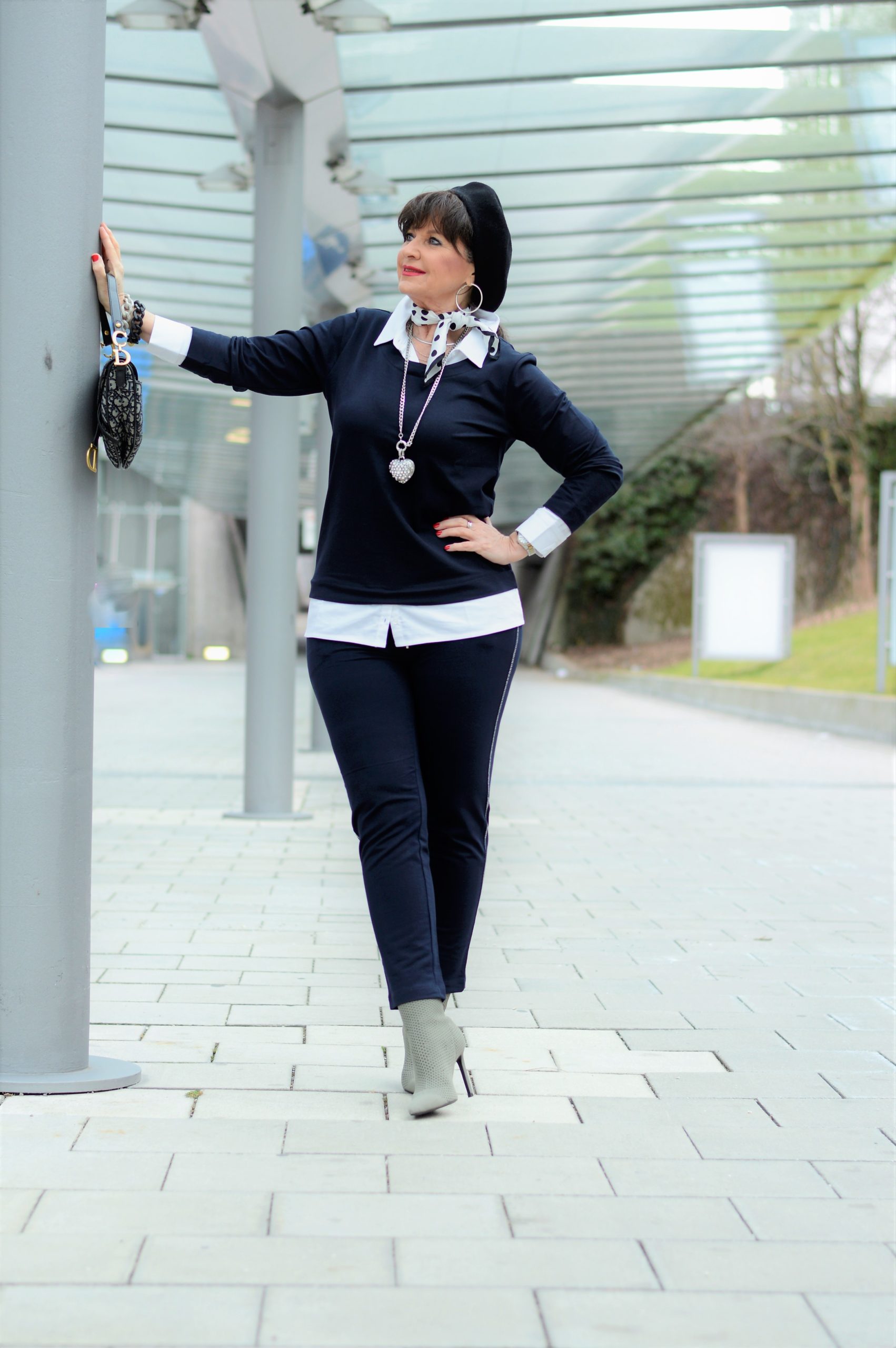 Der City Look in dunkelblau mit weiß darf im Modefrühling 2022 nicht fehlen. Dunkelblau kommt niemals aus der Mode. Mit dunkelblau machen wir quasi alles richtig. Ein schicker City Look lässt sich gleichzeitig als Casual Business Look kombinieren, wenn man auf die passenden Accessoires achtet. Der lässige Look 4 besteht aus einem 2-in-1-Oberteil und einer bequemen 7/8 Jogpants mit Strass-Applikation.