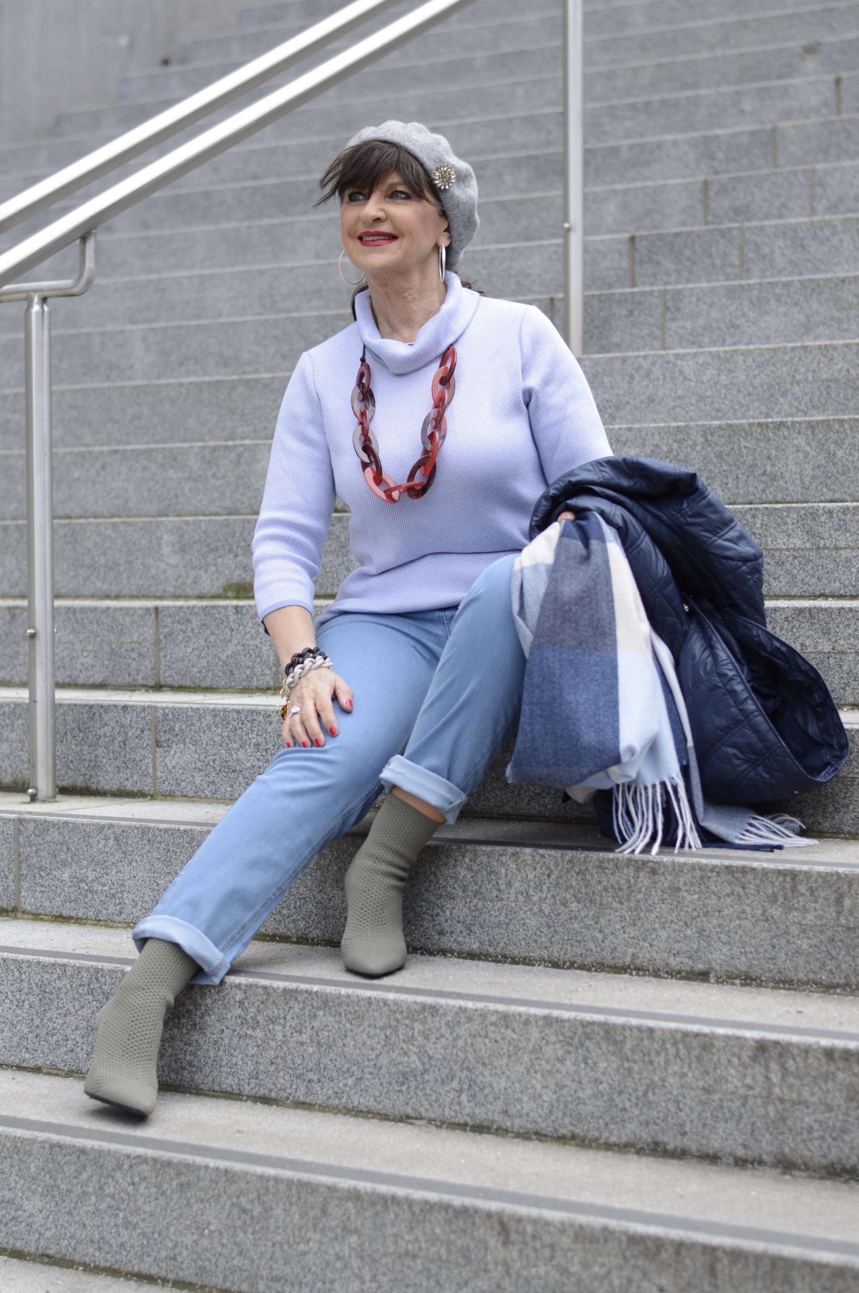 Da das Wetter im Frühling noch unbeständig ist, kombiniere ich einen leichten Pullover mit zweifarbigem Strukturstrick dazu. Der Pulli ist vom Material überaus leicht. Besonders gut gefällt mir der halsferne Rollkragen.
