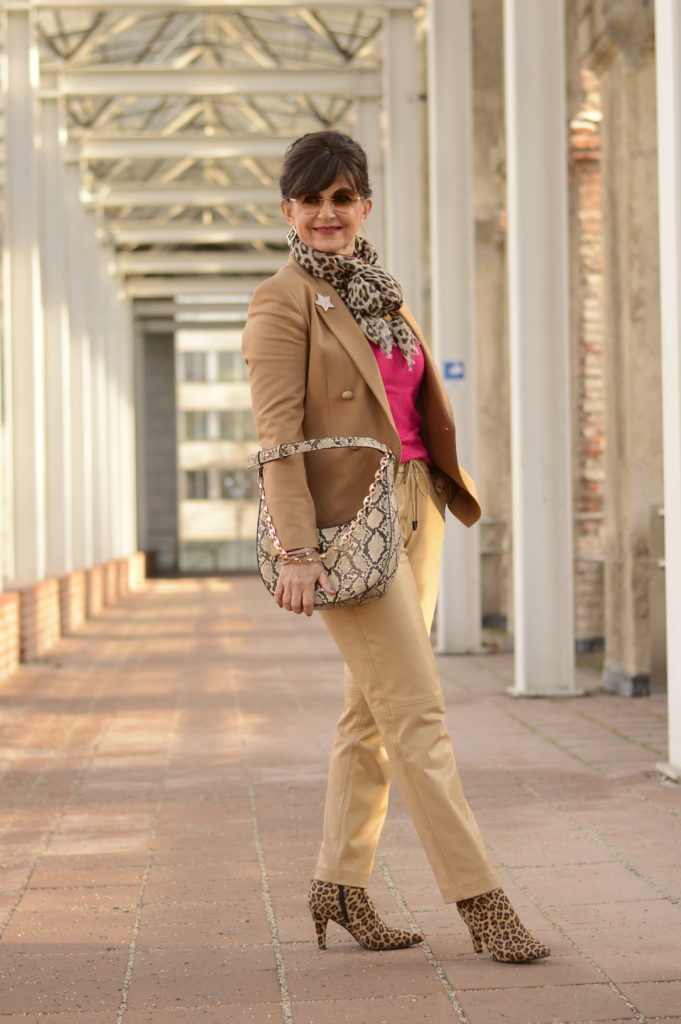 Mich begeistert zum Ausgleich dieser Look. Ein reiner Business-Look war noch nie „meins“, aber dieser Mix aus legerem Schnitt, hochwertigen Materialien und leuchtendem Pink mit dezentem Beige sowie die Accessoires mit Animal Print, das hat was! Auf deine abschließende Frage „Bist Du eine Lady, die gerne pink träg?“ muss ich zwar leider antworten „Nein, Pink ist nicht meine Farbe“, aber in manchen Kombinationen sehe ich es gern – so auch bei diesem Outfit.