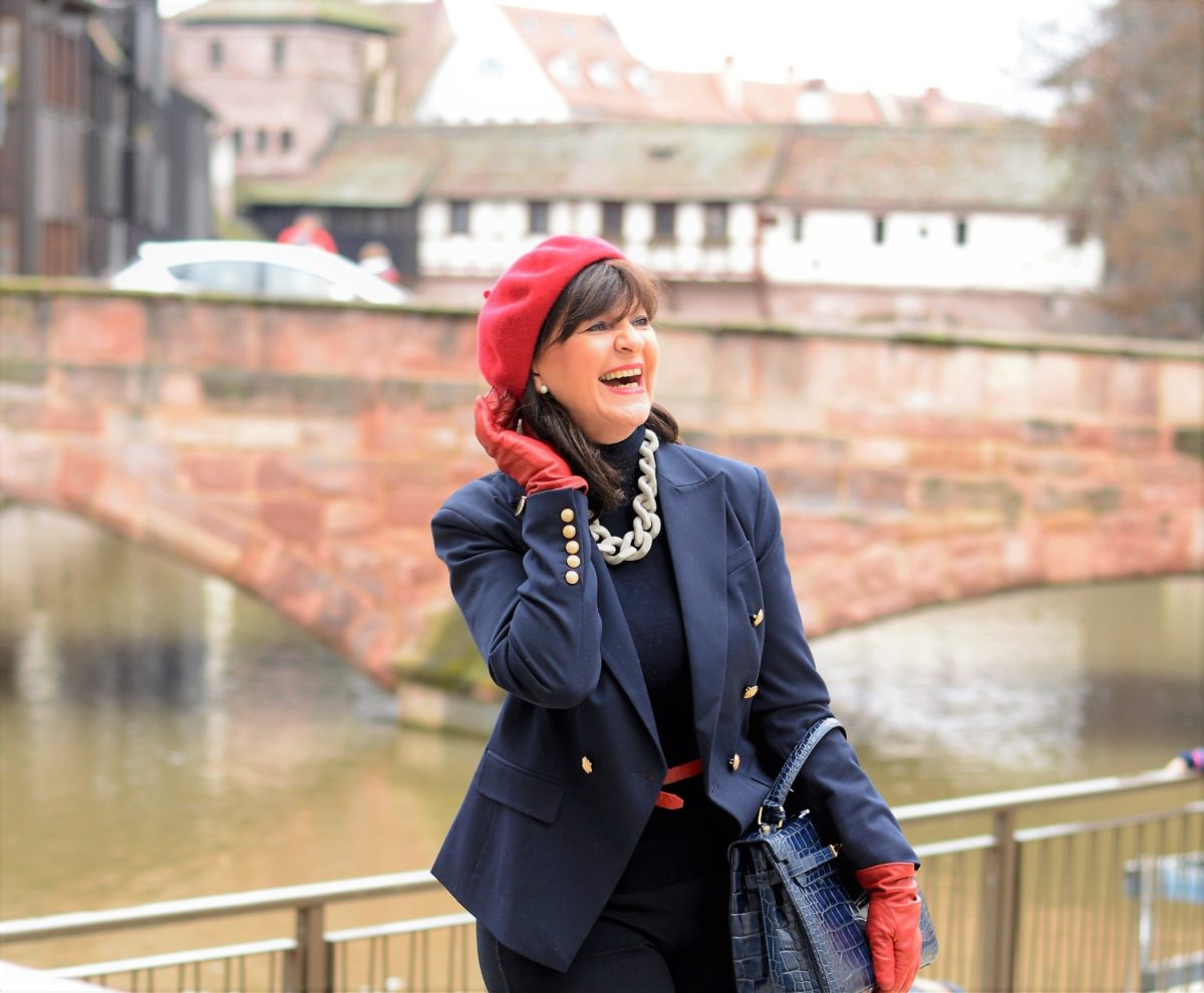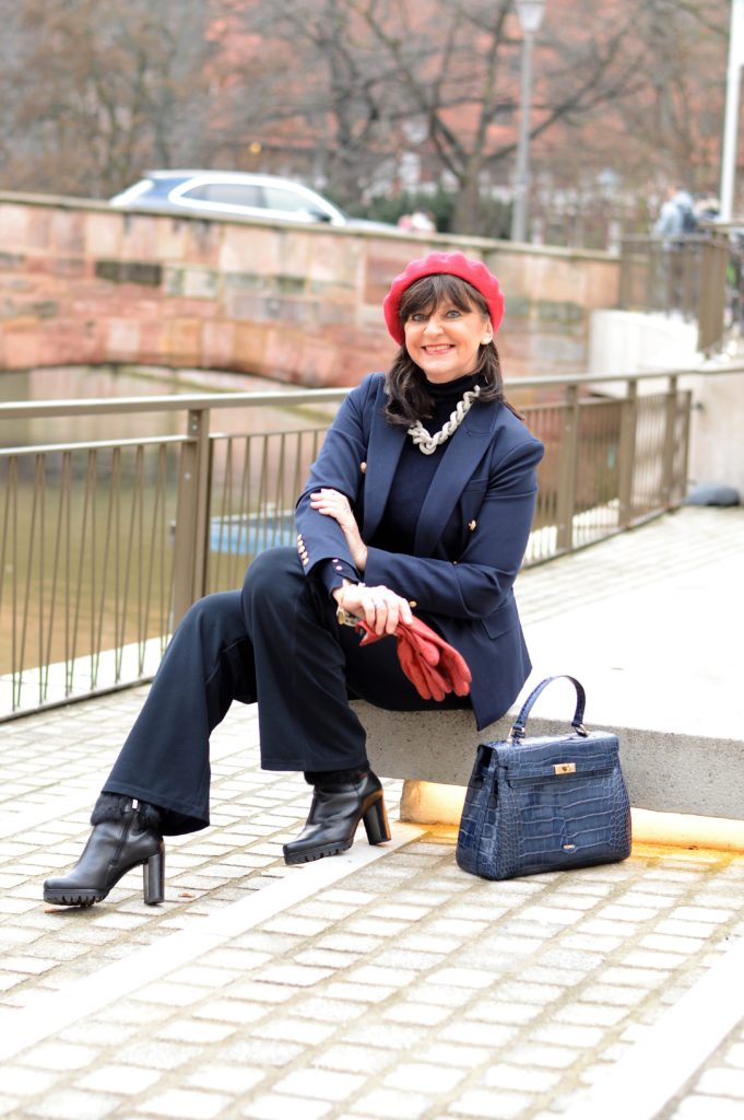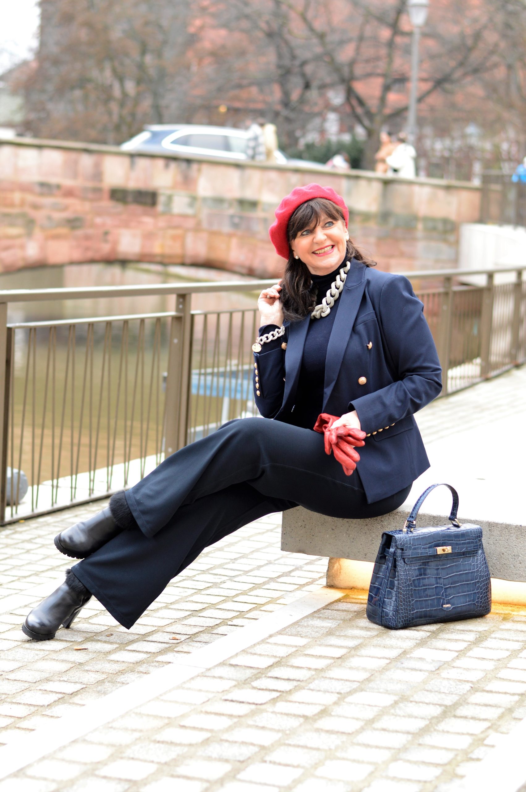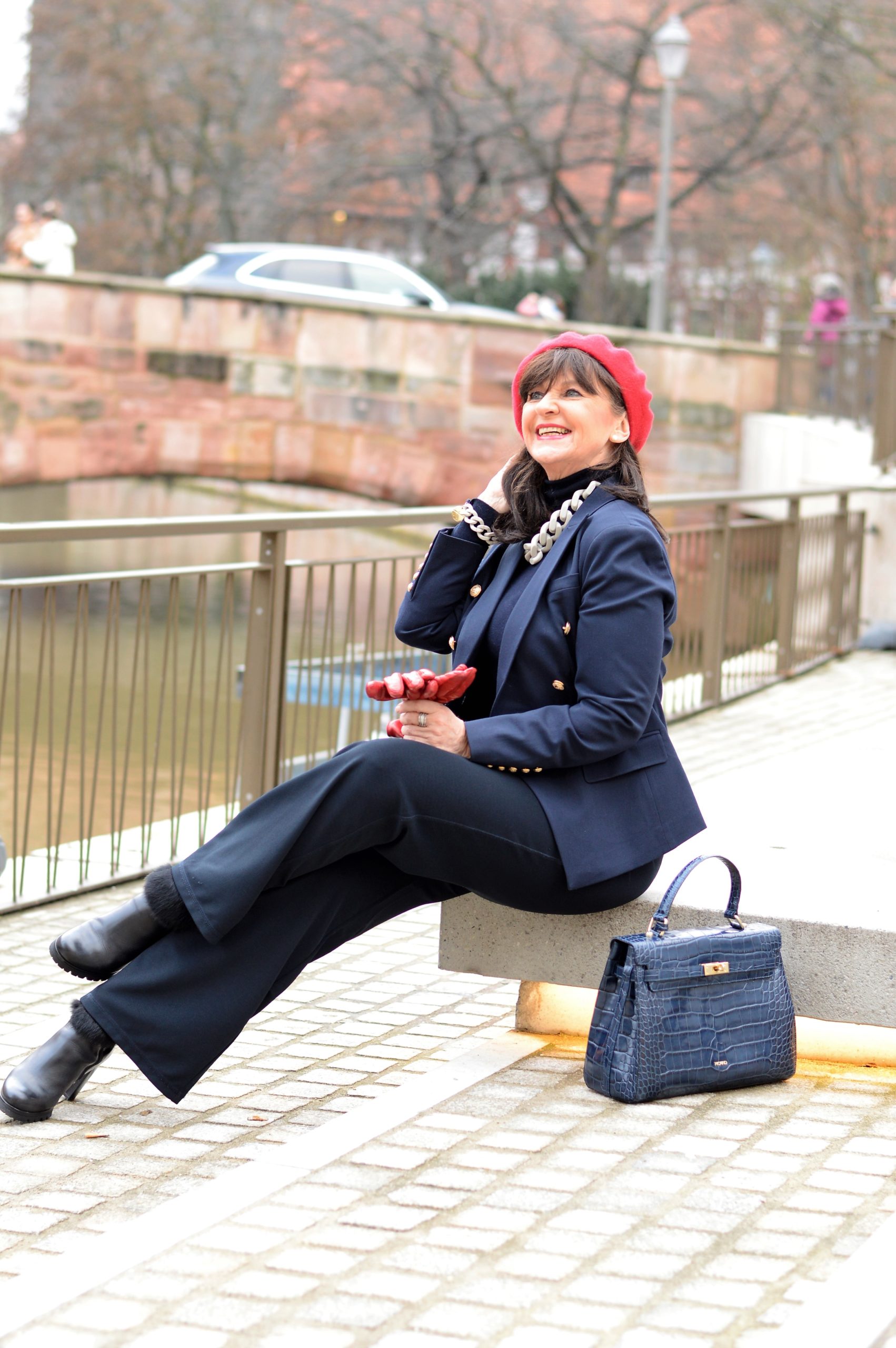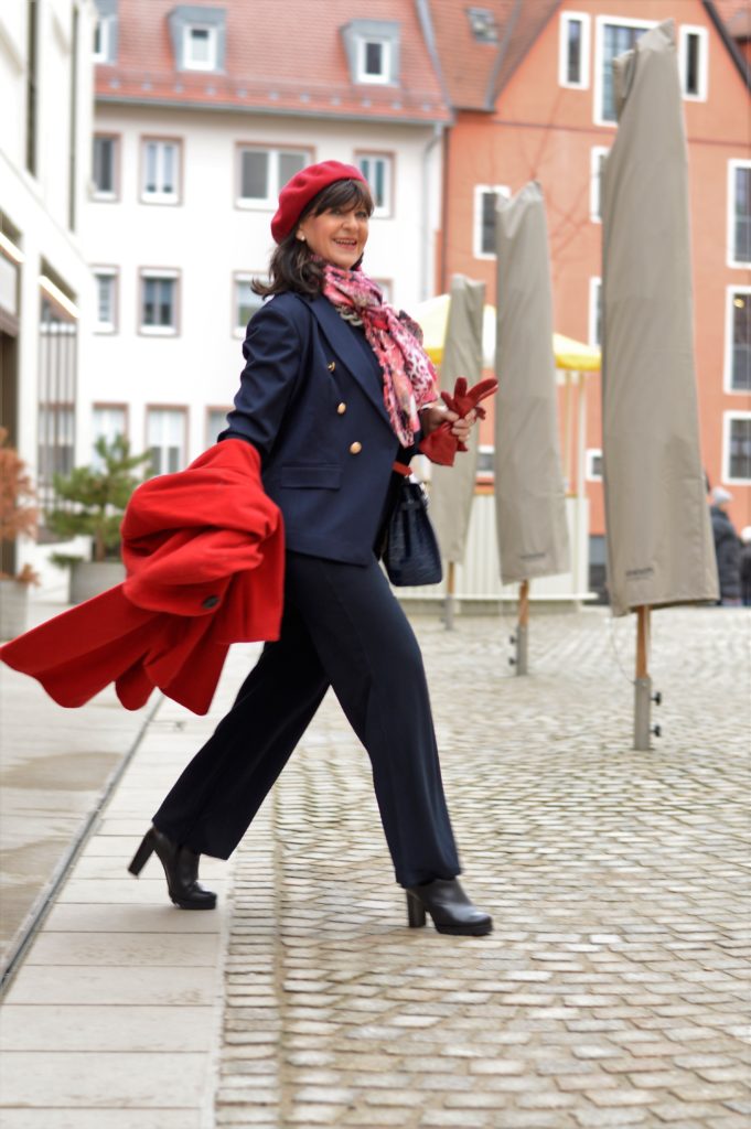 Ton-in-Ton ist eine tolle Kombination, um die Proportionen optimal wirken zu lassen. Ein Outfit in nur einer Farbe wirkt streckend und überaus professionell. Zu meinen Basisteilen kombiniere ich einen dunkelblauen Blazer. Mit den roten Accessoires wie Baskenmütze und Handschuhe werden kleine Eyecatcher gesetzt. Das klappt natürlich mit allen anderen Farben, die sich etwas vom Monochromen Look abheben.