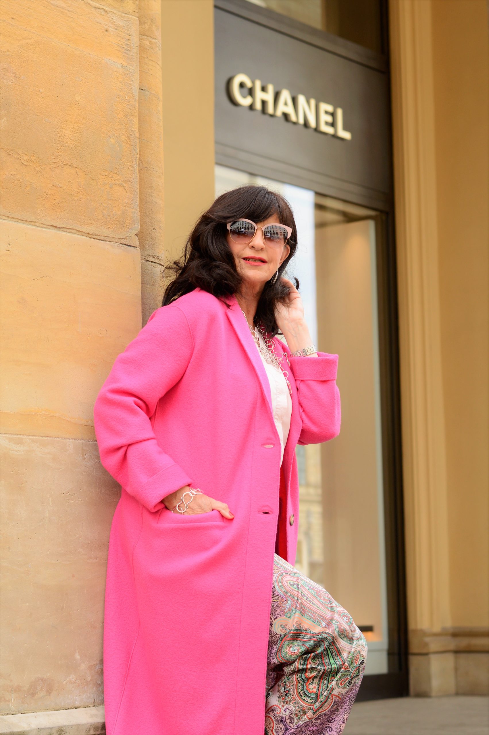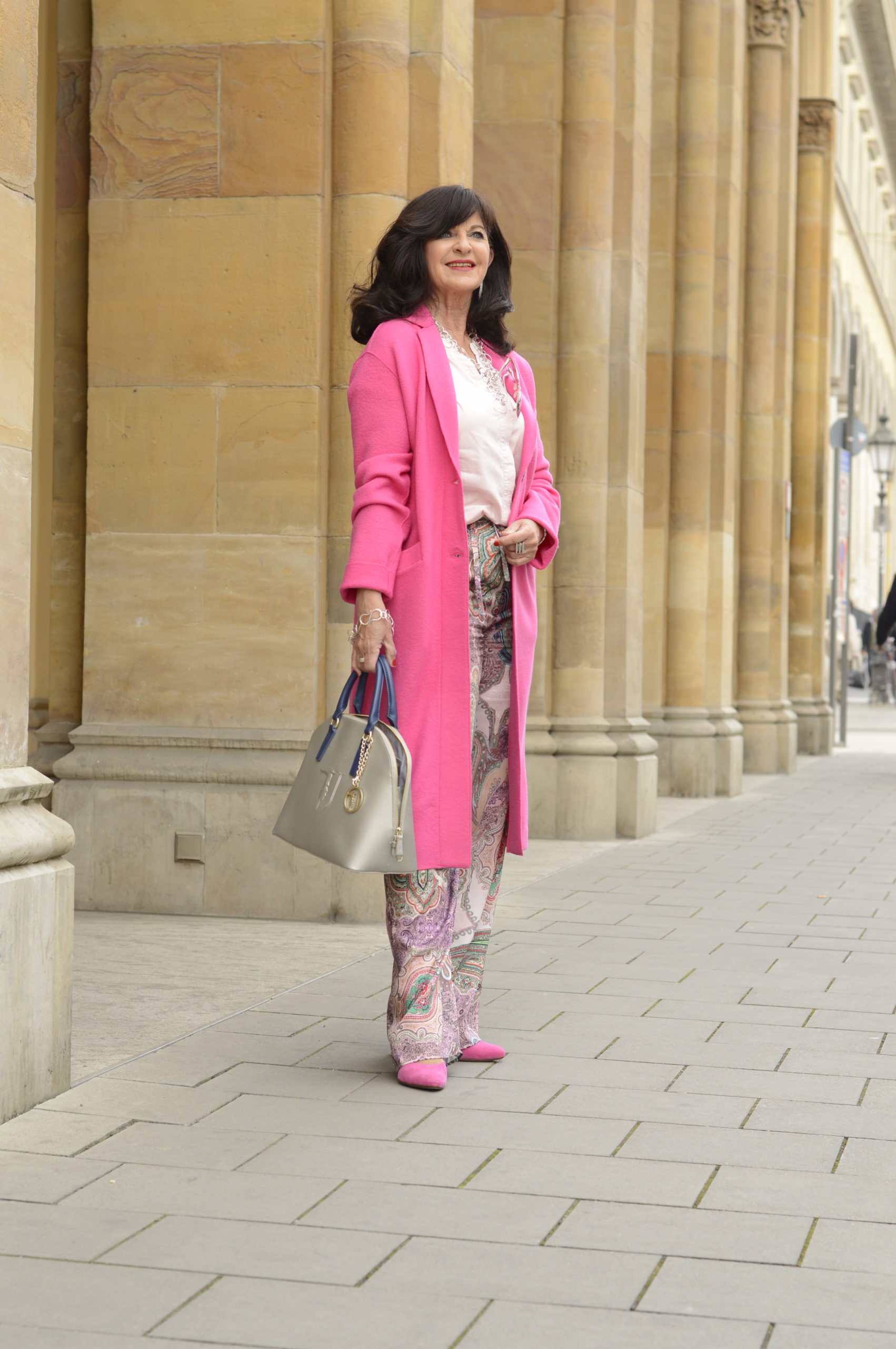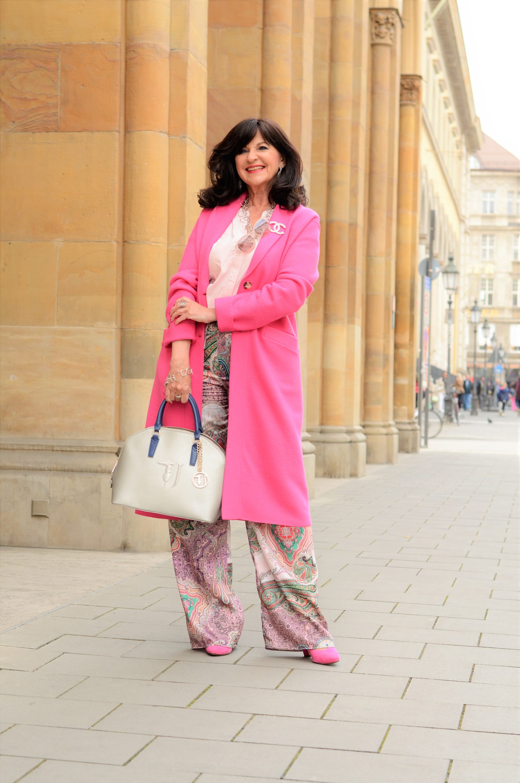 Die zarte Seidenbluse ist ohne Kragen und im leichten Roseton. Dazu kombiniere ich eine auffällige Kette in Silber. Zur Paisleyhose trage ich hohe Pumps in Pink. Das ist definitiv ein Outfit in dem die Trägerin gesehen wird.