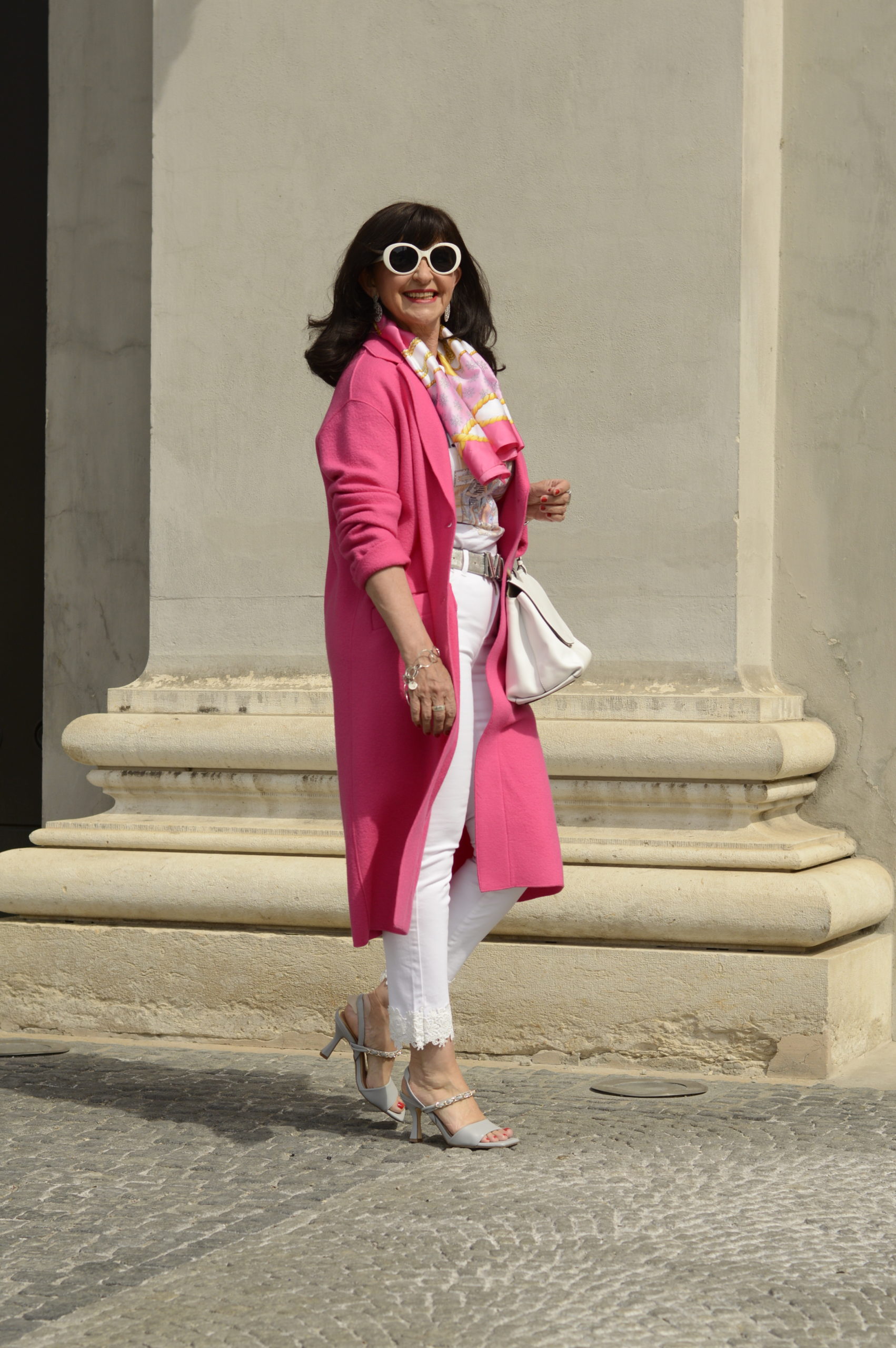 Weiße Jeans sind in der Freizeit meine liebsten Jeans. Klar, ab und zu trage ich sie in hell- oder dunkelblau. Aber weiße Jeans mag ich besonders gerne. Es ist ein großer Kontrast, den ich mit Pink und Weiß hervorrufe. Unter dem Mantel habe ich mich für ein Statement-Shirt entschieden. Genauso gut könnte ich die weiße Bluse vom Look 1 dazu tragen.