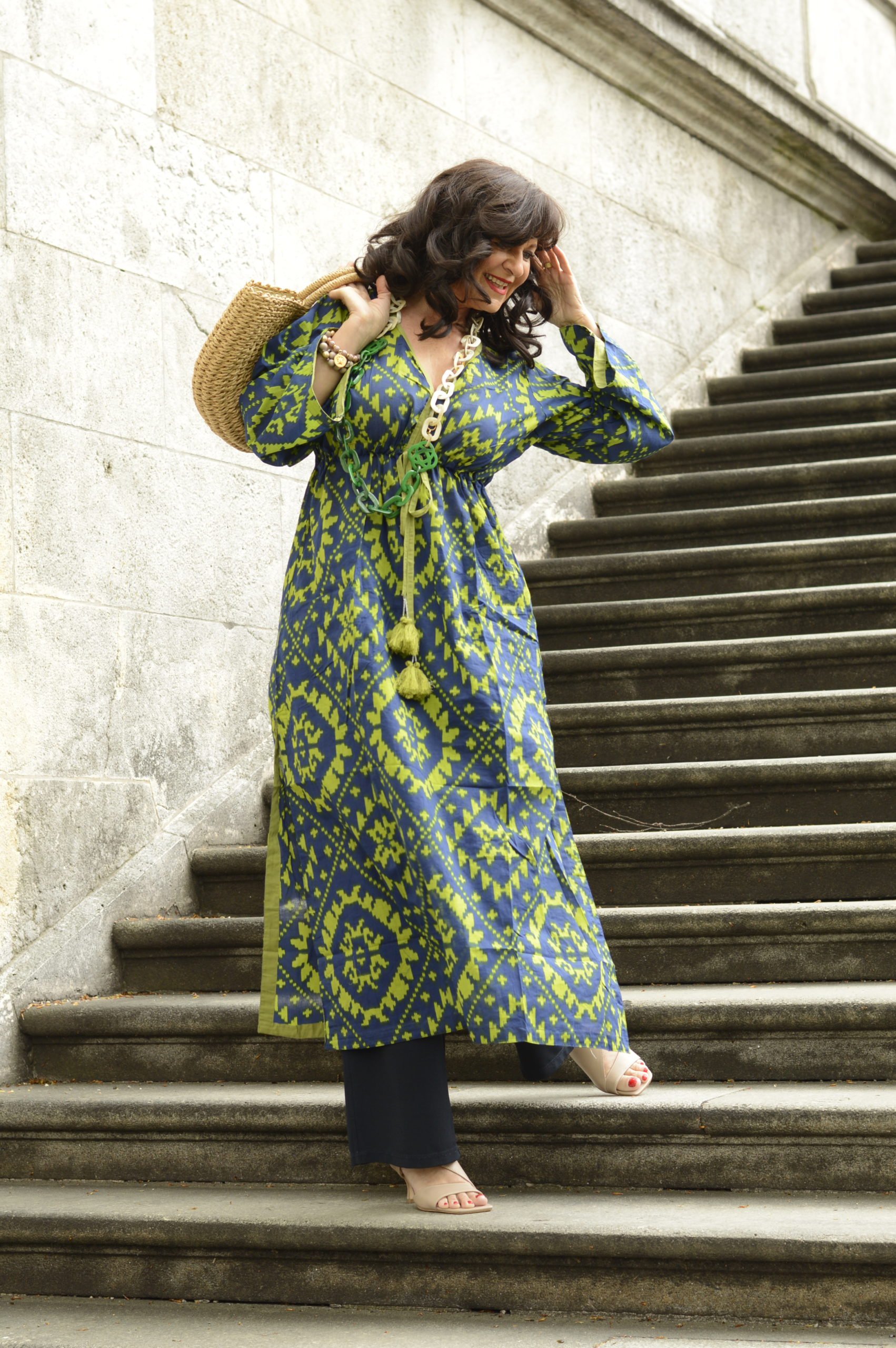 Ein langes Tunikakleid mit dem extravaganten, handbedrucktem Print in Blau-Grün. In diesem schicken Tunikakleid hat man enorm viel Bewegungsfreiheit. An der Seite hat es zwei längere Schlitze und das 100 %ige Baumwollmaterial ist extrem leicht. Durch den umlaufenden Tunnelzug kann ich die Weite unterhalt des Brustbereiches flexibel verstellen. Für einen weiteren Blickfang sorgen die auffälligen Quasten, die den Tunnelzug beweglich machen. Das ist ein weiterer Eyecatcher zum extravaganten Print.