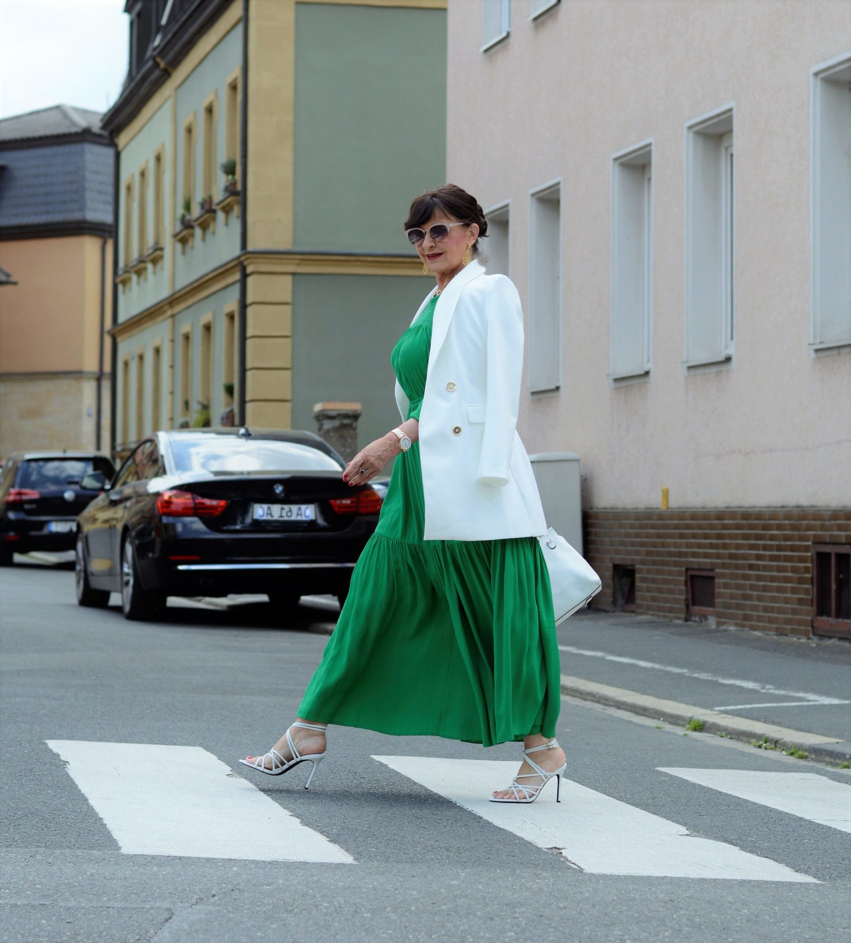Grünes Maxikleid mit weißem Blazer