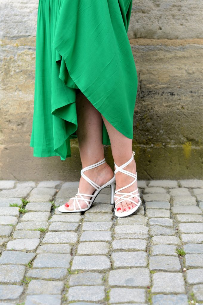 Mein luftig leichtes Maxikleid besticht auf jeden Fall durch seine Farbe. Es ist so unkompliziert und extrem luftig geschnitten. Gleichzeitig unterstreicht es die weibliche Seite an uns Ladys. Das Kleid ist nicht gefüttert und ist in Volants gefertigt. Wenn ein Windhauch kommt, schwingt der Rockteil wunderschön mit. Wenn wir etwas schnelleren Schrittes gehen sieht es besonders feminin aus. Für den Urlaub ist es die perfekte Begleitung. Zum schicken Abendessen schlüpfen wir in das grüne Maxikleid und sind bereits toll angezogen. Manche mögen es mit weißen Sneakers tragen, andere bevorzugen schicke Sandalen. Ich habe weiße hohe Sandaletten für mich gewählt. Sie passen perfekt zu einem schicken und edlen Look.