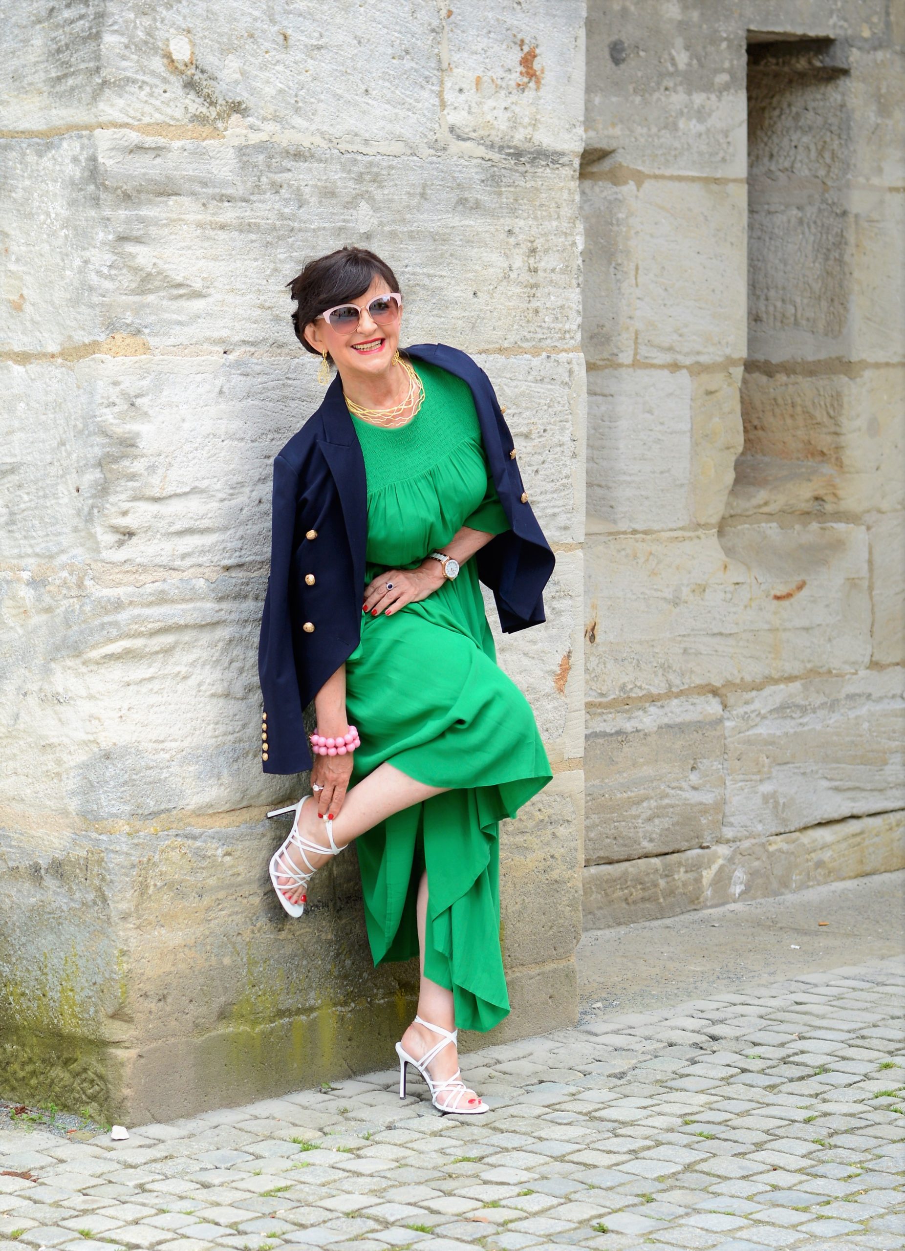 Der heutige Look besticht durch die auffällige Kleiderfarbe – GRÜN. Eine Farbe, wie ich schon häufiger erzählt habe, die ich erst im letzten Jahr für mich entdeckt habe. In diesem Jahr habe ich mich richtig in die Farbe verliebt. Im Sommer trage ich sehr gerne weiße Blazer, ob kurz, tailliert oder Longblazer. Weiße Blazer sehen zu grüner Kleidung wunderbar clean aus. Ein weißer Blazer sieht selbst zur Jeans gut aus, wie ich es in der letzten Woche im Jeans-Beitrag vorgestellt habe.