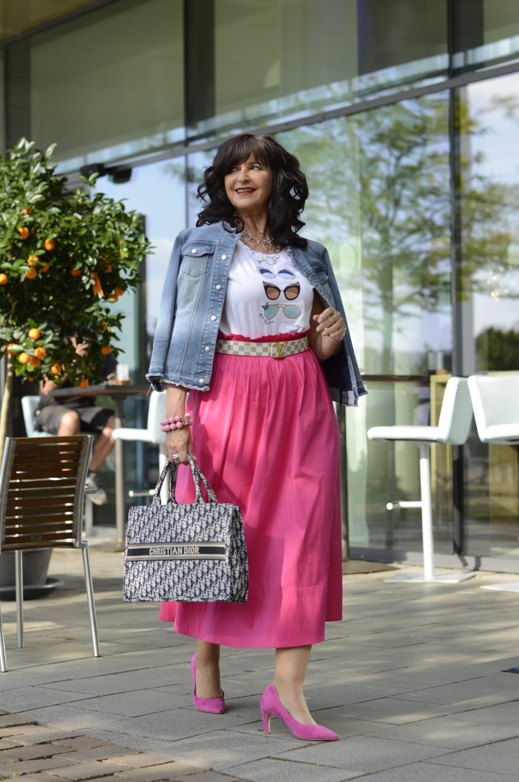 Die Jeansjacke ist der Kombipartner zum Rock. Da der Schnitt zeitlos ist, habe ich die Jacke wieder hervorgeholt. Sie ist schon einige Jahre in meinem Kleiderschrank vorhanden. Für das Unterteil habe ich mich für ein Statement-Shirt entschieden. Pinkfarbige Pumps ergänzen mein Outfit. Diese habe ich vor einigen Wochen in Erlangen zum absoluten Sonderpreis gekauft.