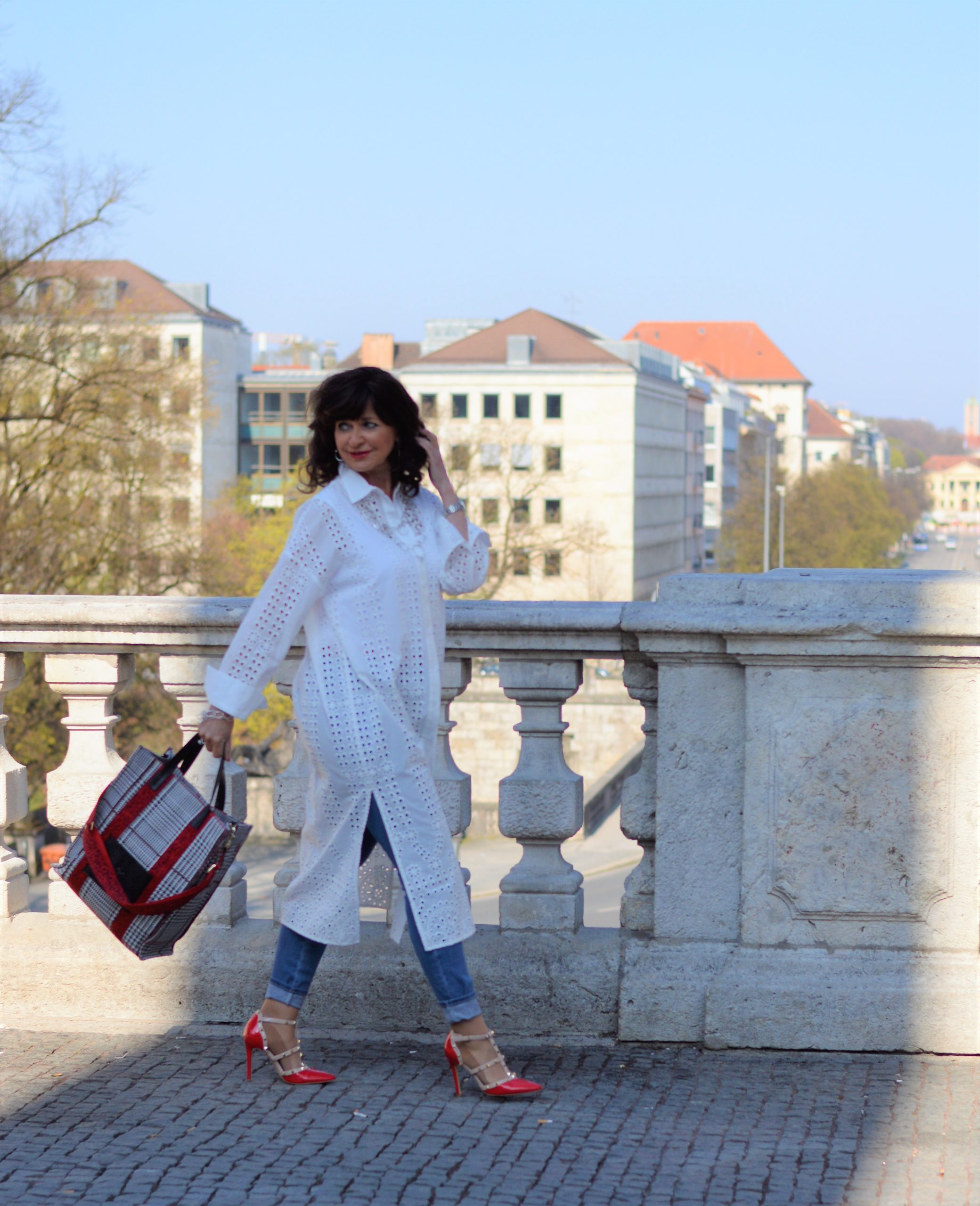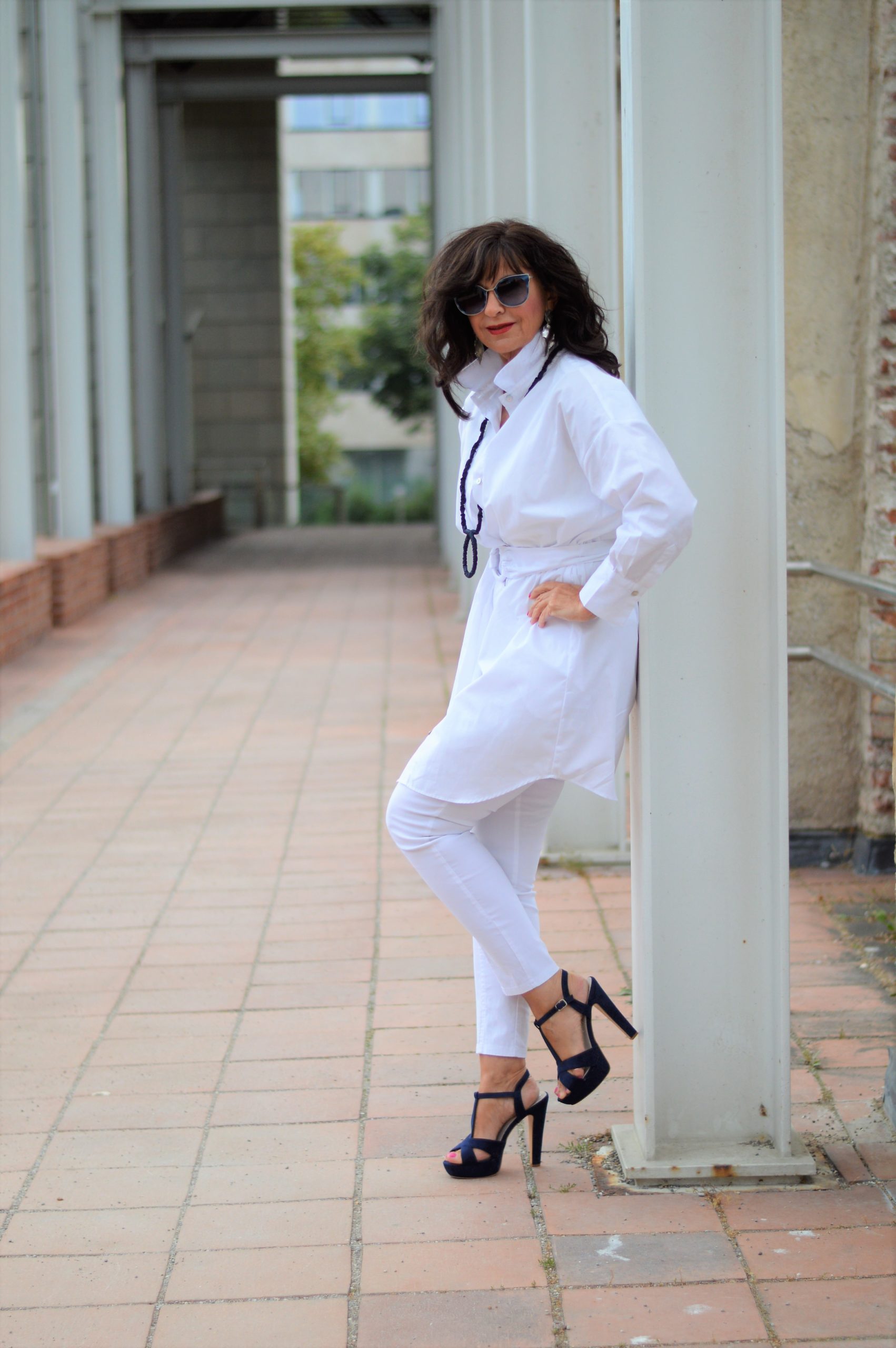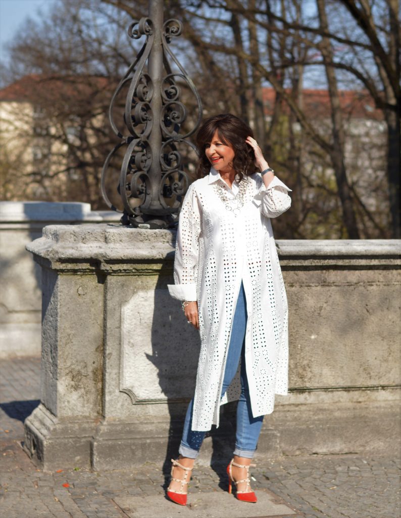 Falls Dir ganz in Weiß zu viel ist, probiere einen Look mit einer XL-Bluse oder einem weißen Kimono aus. Meine weiße Longbluse mit durchsichtigem Spitzen-Design sieht hervorragend zur engen Jeans aus. Probiere es einmal aus, bestimmt hast Du eine weiße XL-Bluse im Schrank.