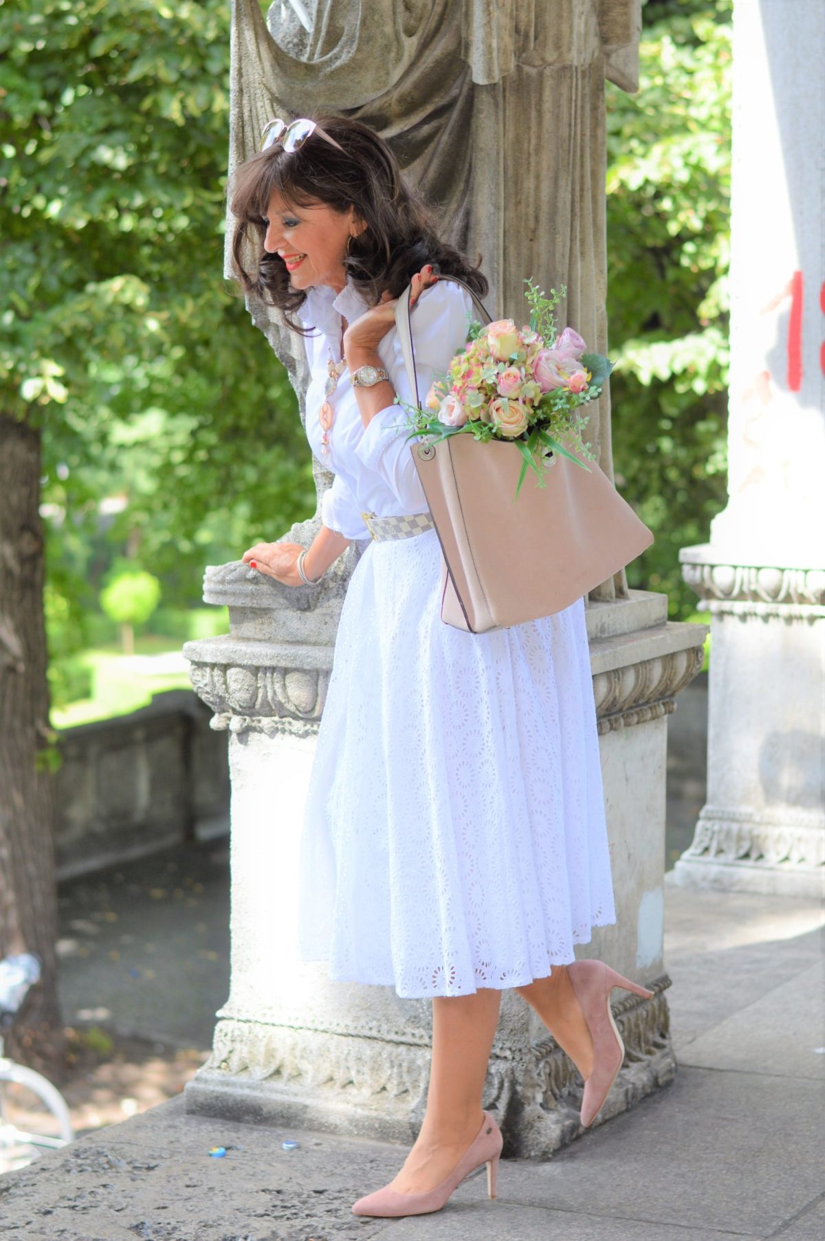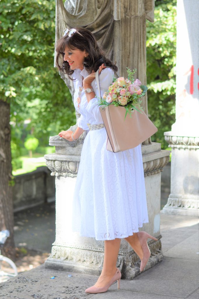 Wer mit Akzenten spielen möchte setze auf kleine Farbtupfer. Das kann eine auffällige Halskette sein. Oder eine Tasche in gelb, pink, grün sorgt für einen richtigen Eyecatcher bei einem All-White-Look. Zarte Pastelltöne eignen sich überaus vorteilhaft zu einem All White Look. Das komplette Outfit wirkt dadurch sehr feminin in clean. Ich habe bei meinem Look darauf geachtet, dass Sonnenbrille, Halskette, Handtasche und die Pumps in einem zarten Roséton harmonisch wirken. Selbst der Blumenstrauß nimmt die Farbigkeit des Looks auf.