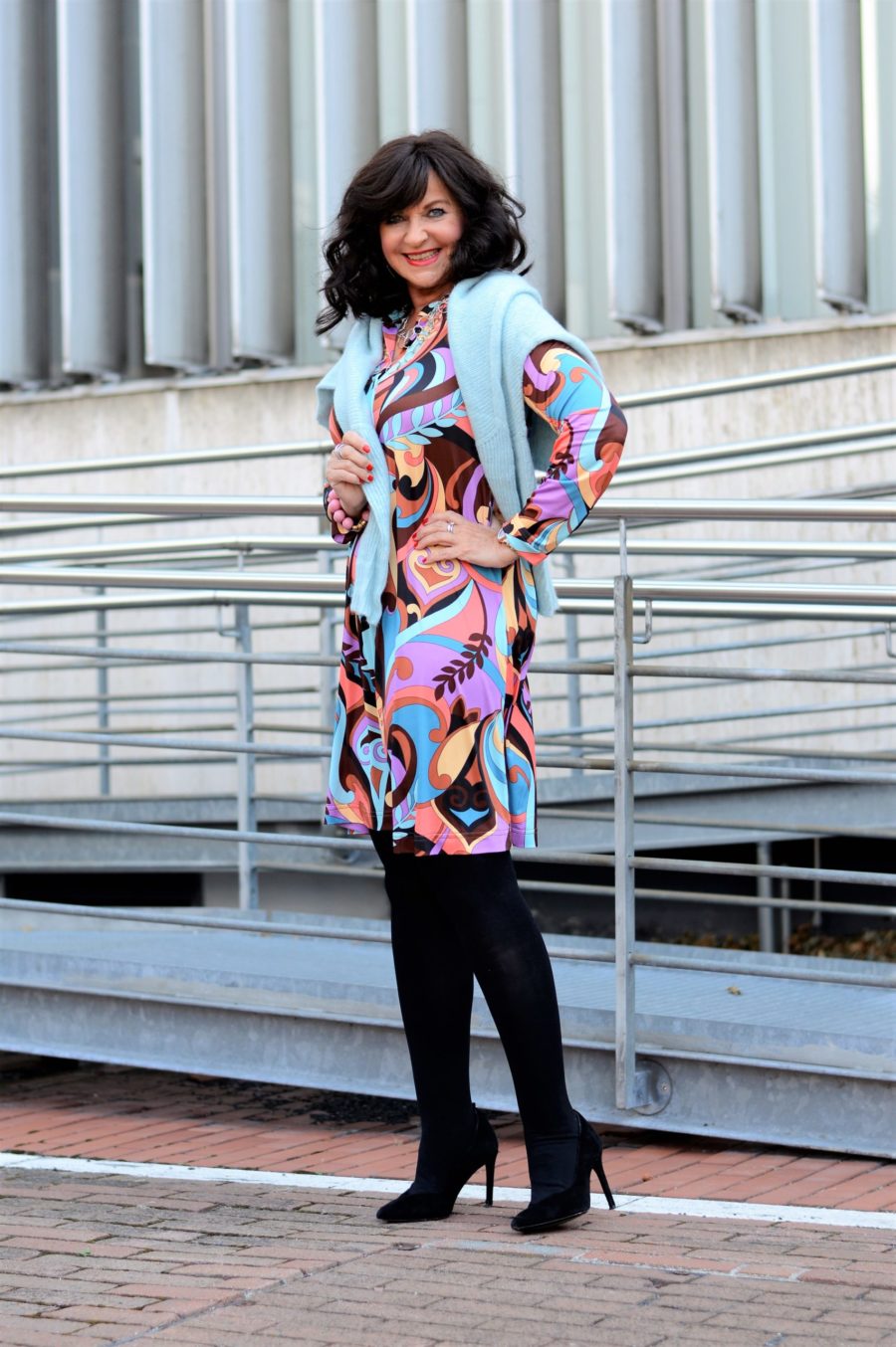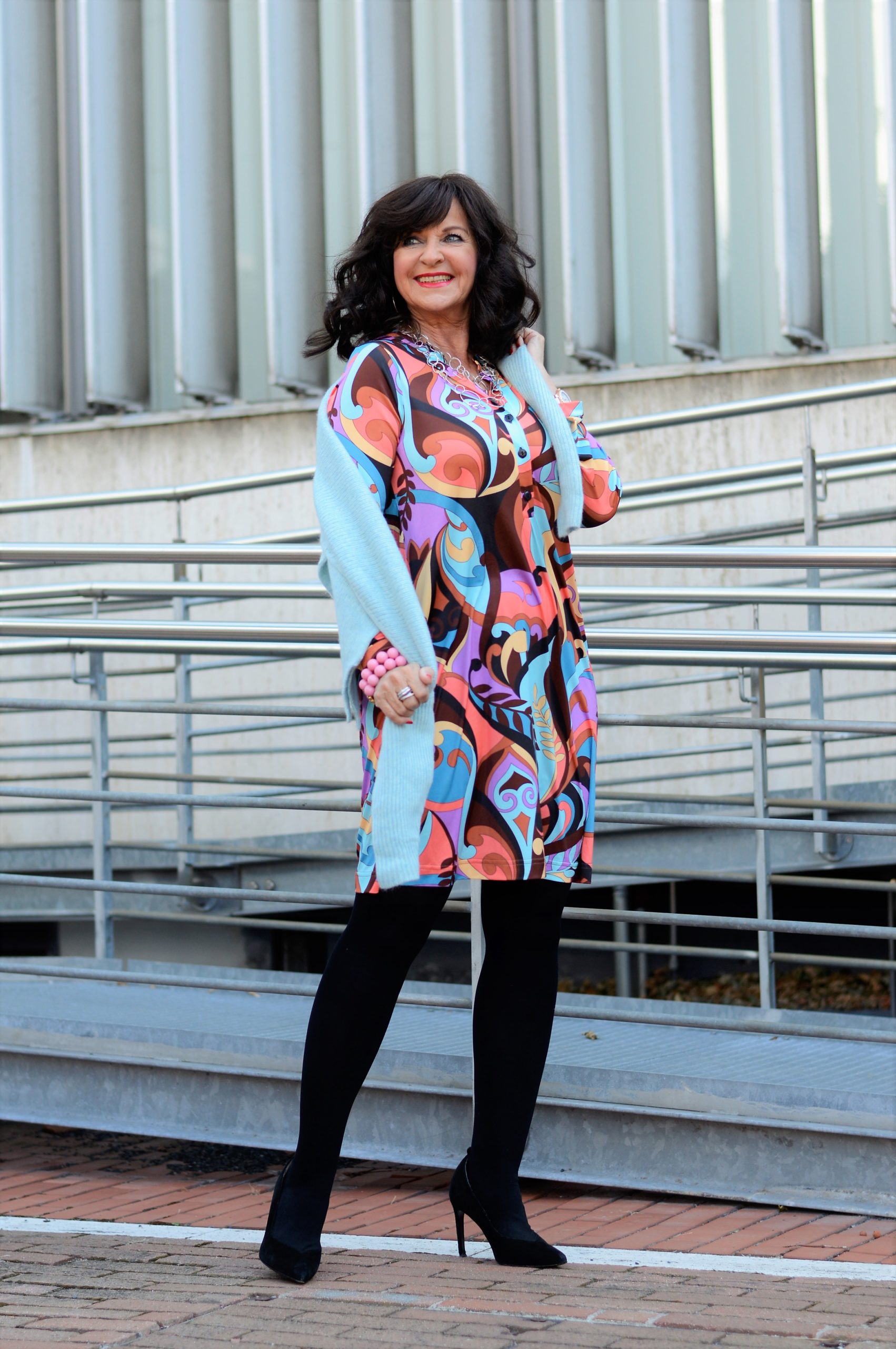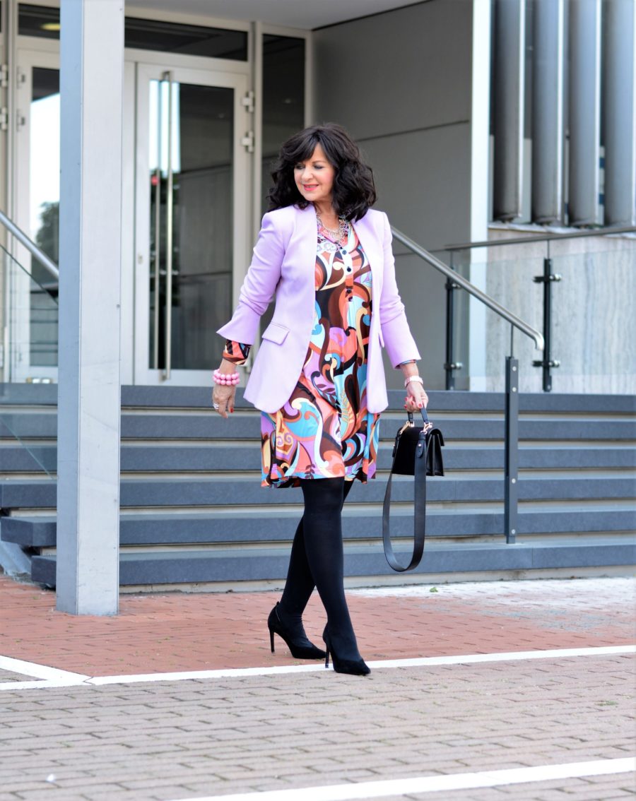Die Farben des Prints sind die Farben des Herbstes. Dadurch kann CAROLINE so viele Kombipartner haben wie sie will. Für den modischen Business Look kombiniere ich das Kleid mit einem Blazer in zarten Fliedertönen. Damit wird das Business-Meeting ganz bestimmt erfolgreich.