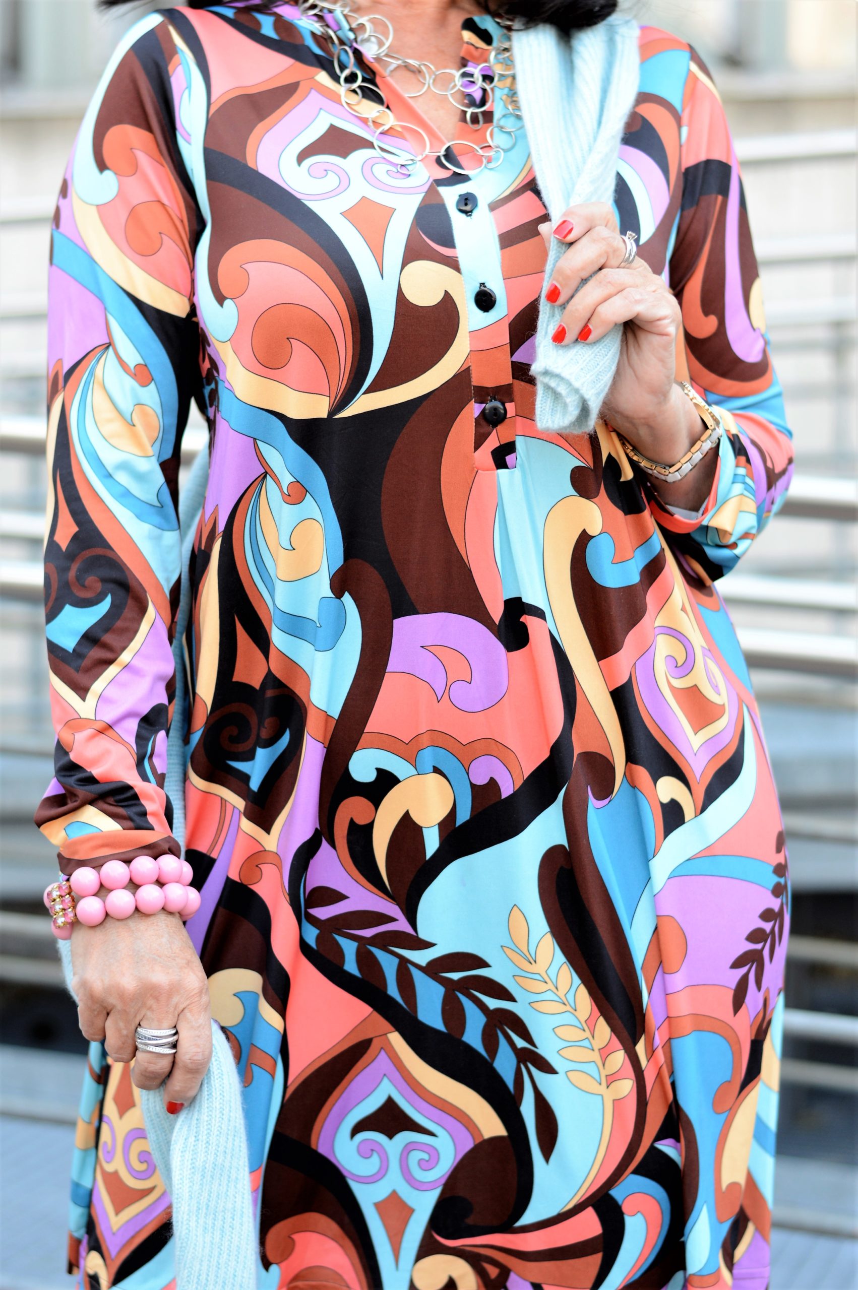 Trage ich CAROLINE eher im Casual Look, dann wähle ich einen zarten Kaschmirpulli als Kombipartner. Ein helles türkis passt wunderbar zum Print und gibt dem Look eine gewisse Frische.