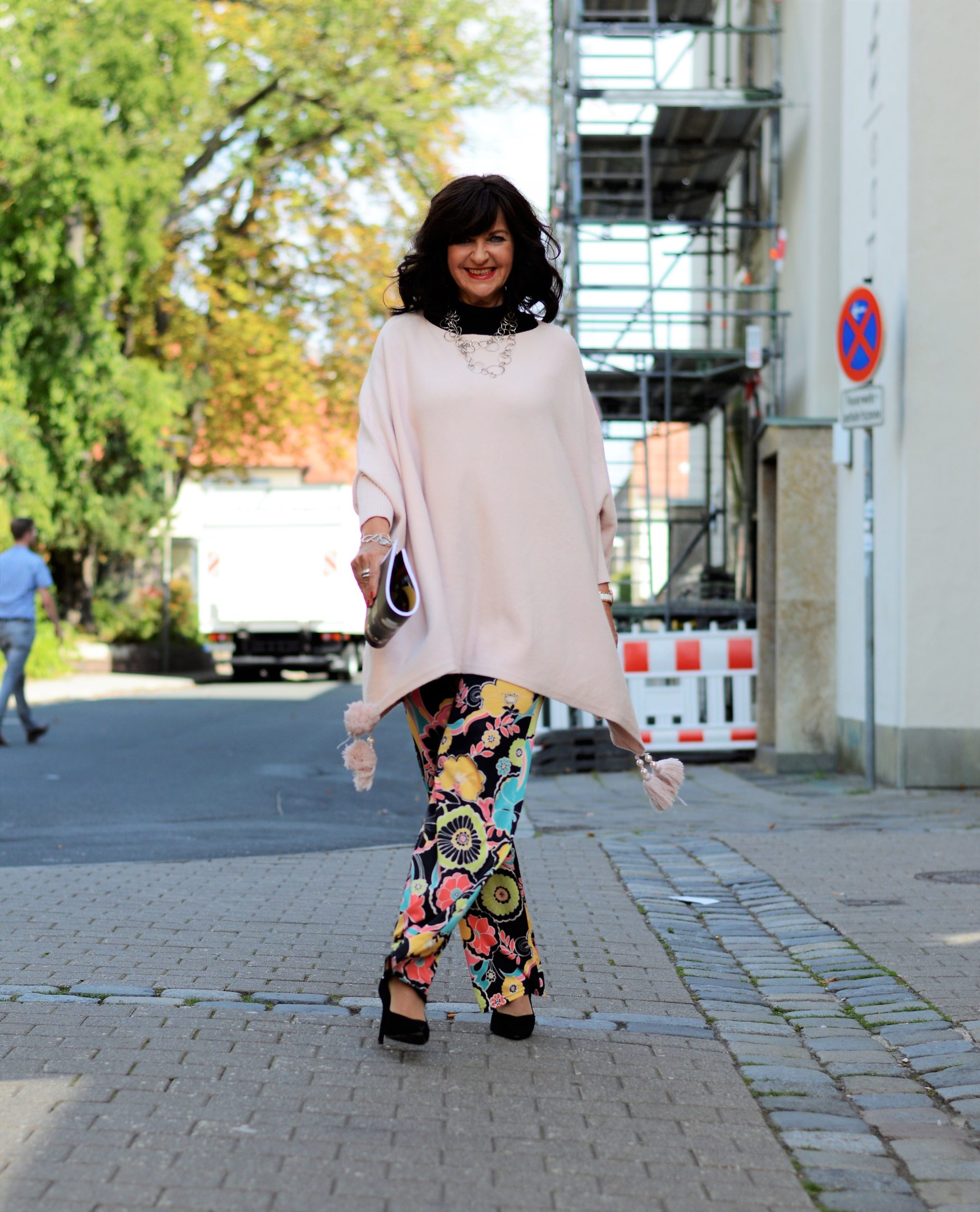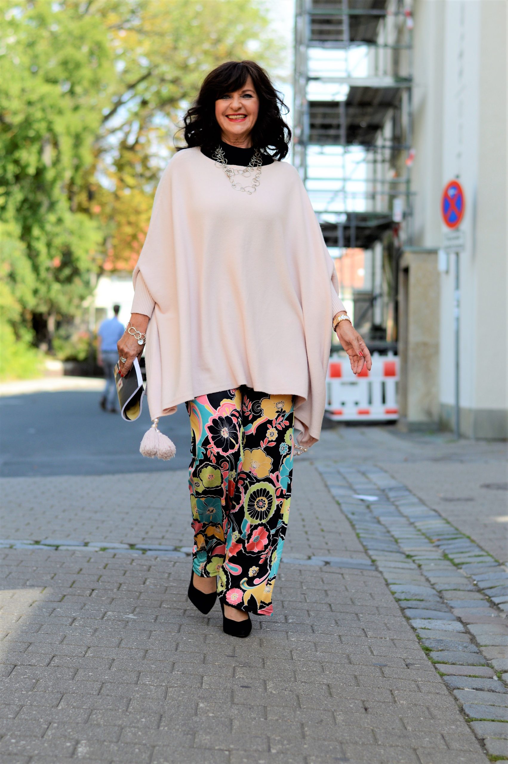 Mit schwarz im Oberteil finde ich sie besonders eloquent und modisch. Ich trage dazu einen Seidenrolli und einen breiten Gürtel. Sollte es etwas kühler werden, schlüpfe ich ganz einfach in einen Blazer. Dieser kann schwarz sein, aber auch alle anderen Farben, die im Print vorkommen. können als Blazer oder als Oberteil zu HOSE SPINO BLOSSOM kombiniert werden.