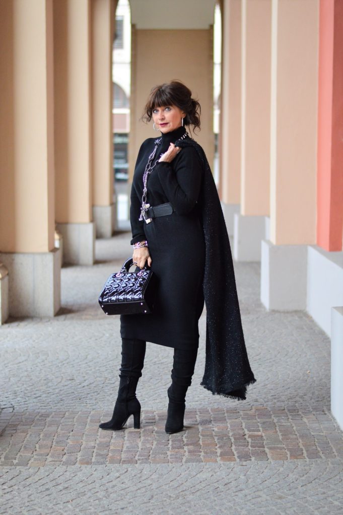 Wer nicht so farbenmutig ist, der greift zu einem schwarzen oder grauen Strickkleid. Das Schwarze ist mein erstes Strickkleid gewesen. Ich weiß es noch, wie ich es in München entdeckt habe und überlegte, ob es überhaupt zu mir passend ist. Da mir gleich zahlreiche Kombinationen eingefallen sind, habe ich es natürlich gekauft. Ich trage es sehr gerne mit Overknees und im All-Black-Look. Mit einer Lederjacke sieht es genauso gut aus wie zu einem Strickmantel. Eben ein Allrounder.