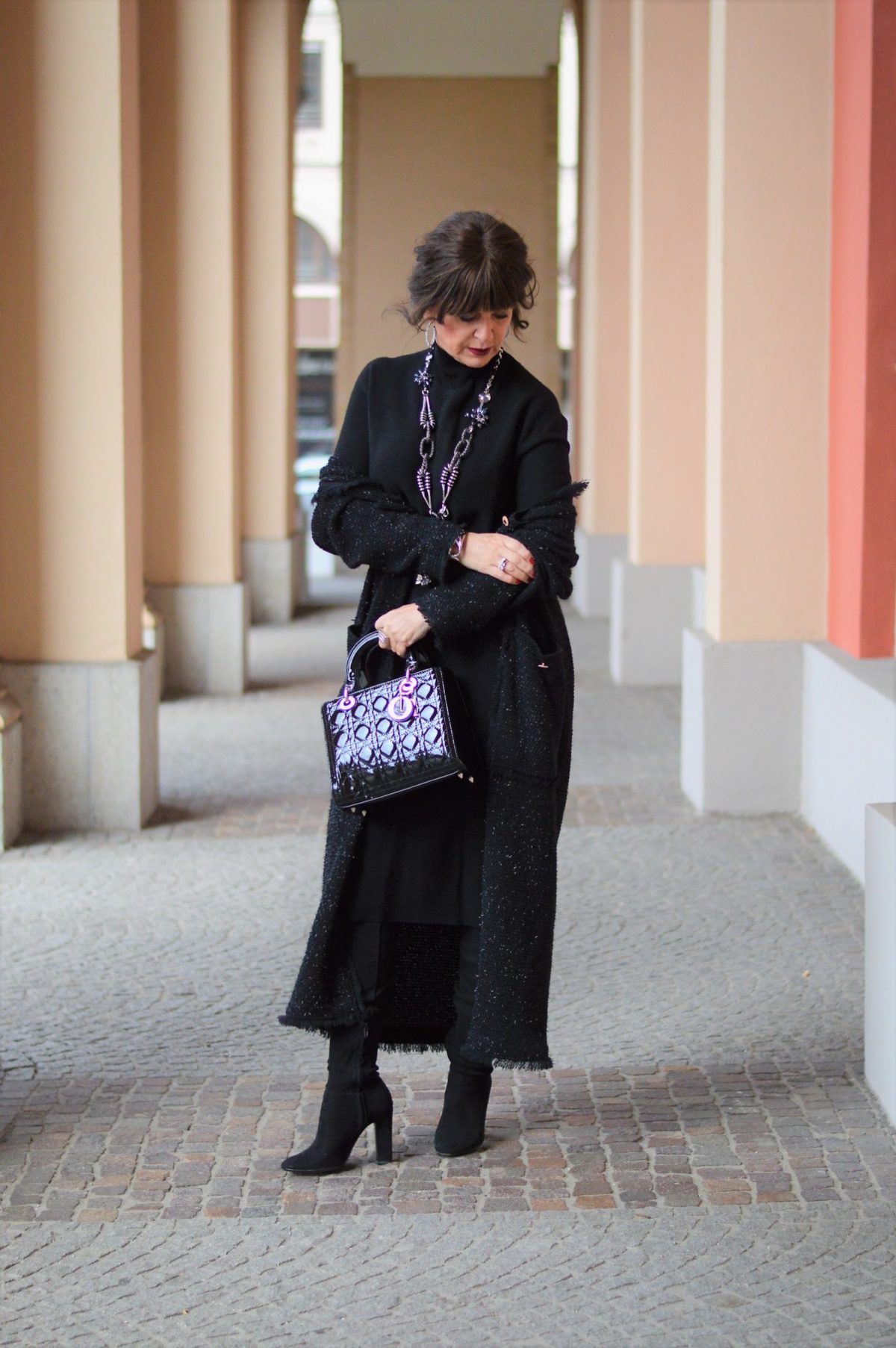 Wer nicht so farbenmutig ist, der greift zu einem schwarzen oder grauen Strickkleid. Das Schwarze ist mein erstes Strickkleid gewesen. Ich weiß es noch, wie ich es in München entdeckt habe und überlegte, ob es überhaupt zu mir passend ist. Da mir gleich zahlreiche Kombinationen eingefallen sind, habe ich es natürlich gekauft. Ich trage es sehr gerne mit Overknees und im All-Black-Look. Mit einer Lederjacke sieht es genauso gut aus wie zu einem Strickmantel. Eben ein Allrounder.