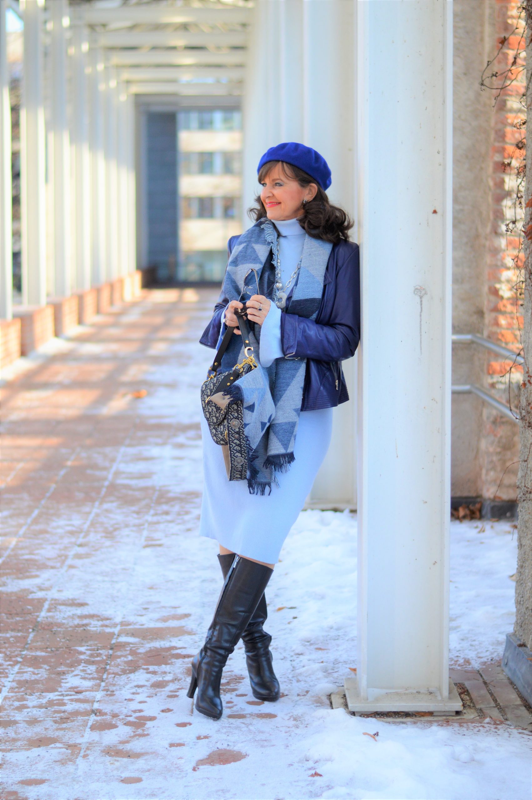 Um dieses hellblaue Strickkleid werde ich immer beneidet, wenn ich es an habe. Es ist wirklich eine seltene Farbe in Sachen Strickkleider. Vor vielen Jahren habe ich es auf einer Geschäftsreise im Schaufenster gesehen und habe es mir sofort gekauft. Farblich bin ich mutig und kombiniere es sogar mit rosé. Es ist eines meiner Lieblingskleider in Sachen Strick.