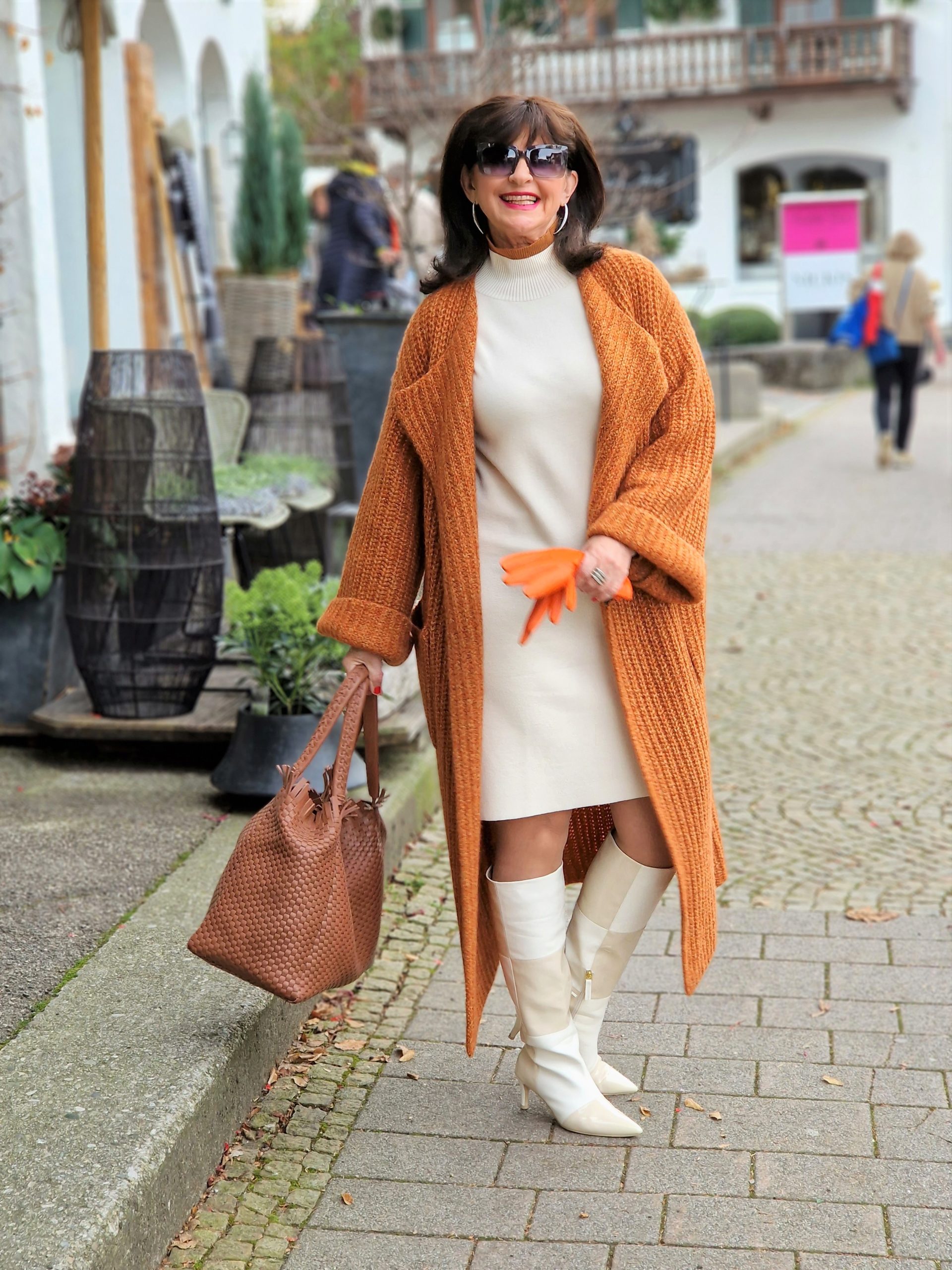 Wie schön, dass der All-over-White Look oder helle Farben nicht nur im Sommer, sondern auch im Winter angesagt ist. Meine beiden hellen Strickkleider sind von unterschiedlicher Strickqualität. Das eine Kleid mit den orangefarbigen Handschuhen ist eher feiner in der Strickart. Als Kontrast kombiniere ich einen Strickmantel in grober Qualität.