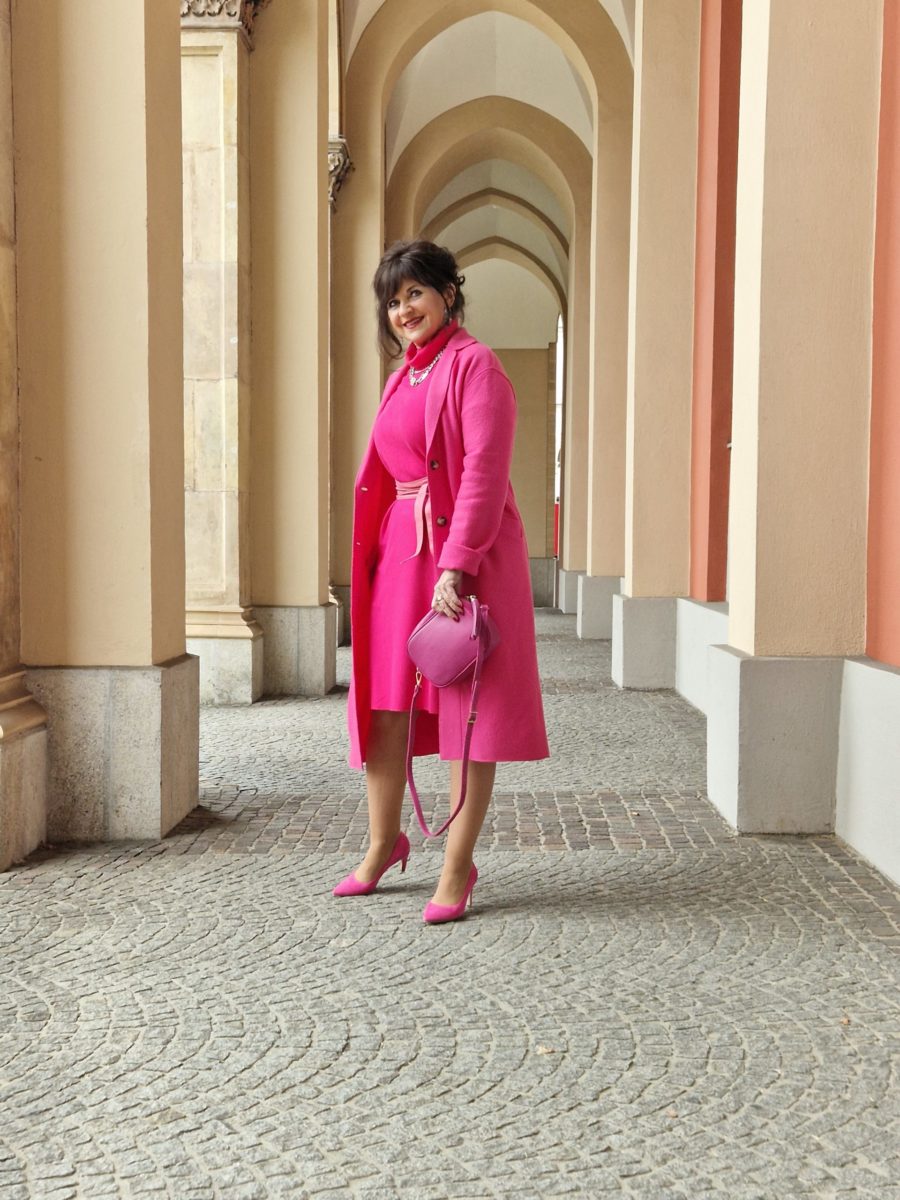 Das pinke Strickkleid hat eine optimale Länge, um Boots, Stiefel oder Pumps dazu zu kombinieren. Die knallige pinke Farbe macht gute Laune. Ich trage es mit dem farblich passenden Strickmantel. Ton-in-Ton ist angesagt, deshalb sind alles Accessoires wie Gürtel, Handtasche und Handschuhe ebenfalls in dieser Gute-Laune-Farbe. Das Kleid werde ich sicherlich an den Feiertagen tragen. Es ist bequem und lässt sich optimal sogar ohne Gürtel tragen.
