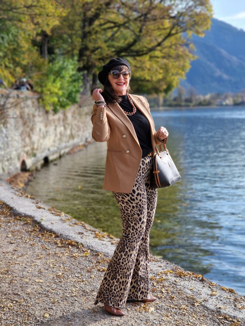 - Zur Hose kombiniere ich einen schwarzen Rolli und einen beigen Blazer. Die Stiefeletten sind farblich auf die Hose abgestimmt. Die Handtasche habe ich in Bozen gekauft, die ebenfalls die Farbigkeit des Looks komplettiert.
