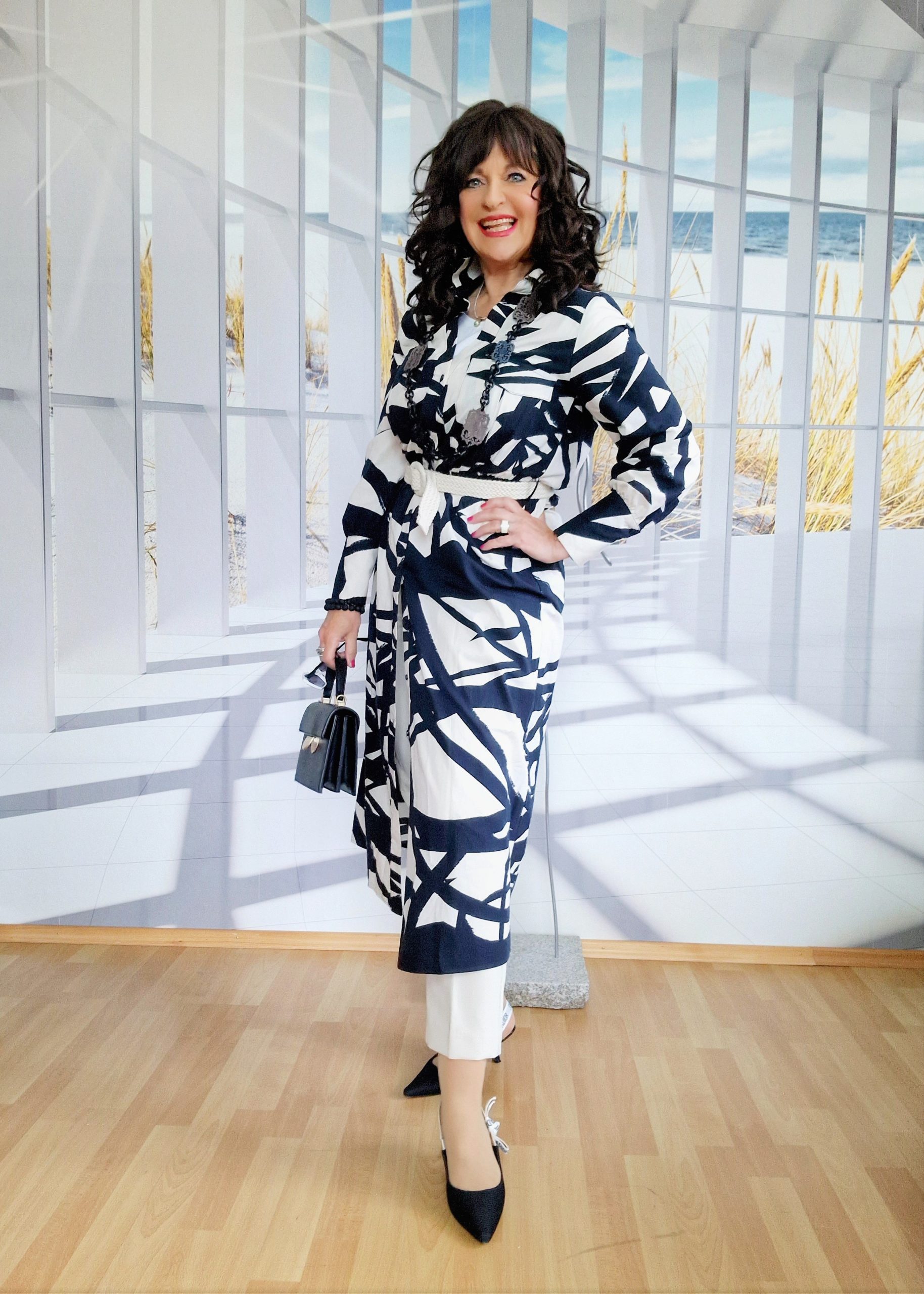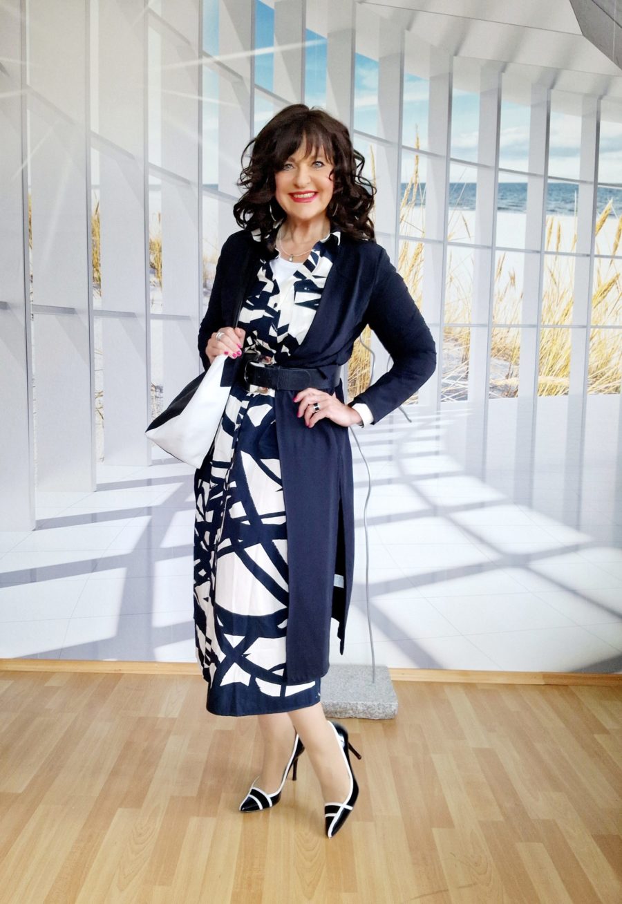 Beim ersten Look mit weißem Gürtel die schwarze Kette an der, wie zufällig, aber doch genau passend, die schwarz – weiße Brille hängt, dazu die Sling-Pumps in gleicher Farbe.