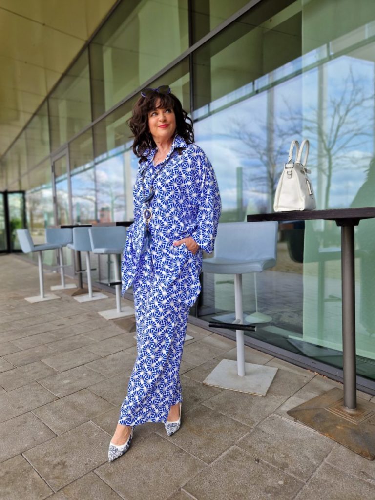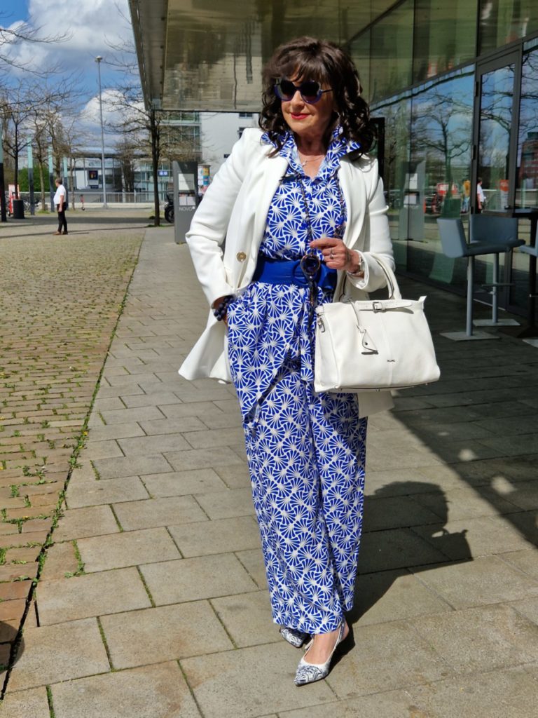 - Und wie Du in den Bilder siehst, passt der weiße Longblazer ideal zu dem Zweiteiler. Zur Betonung der Taille wähle ich einen royalblauen breiten Gürtel.