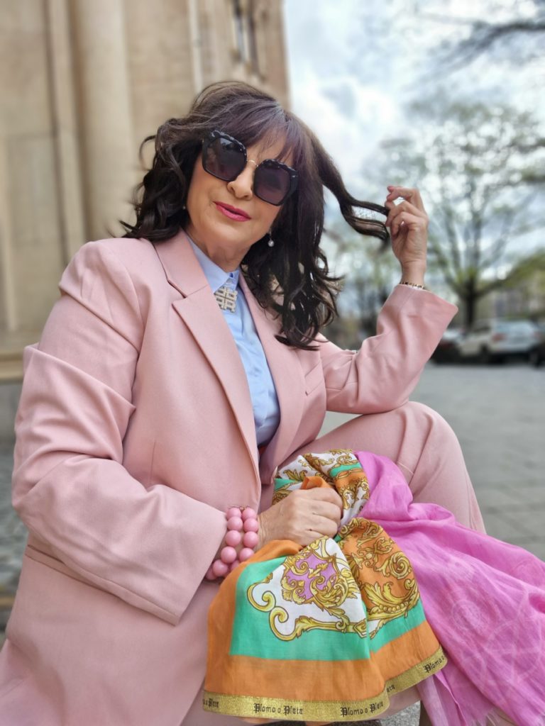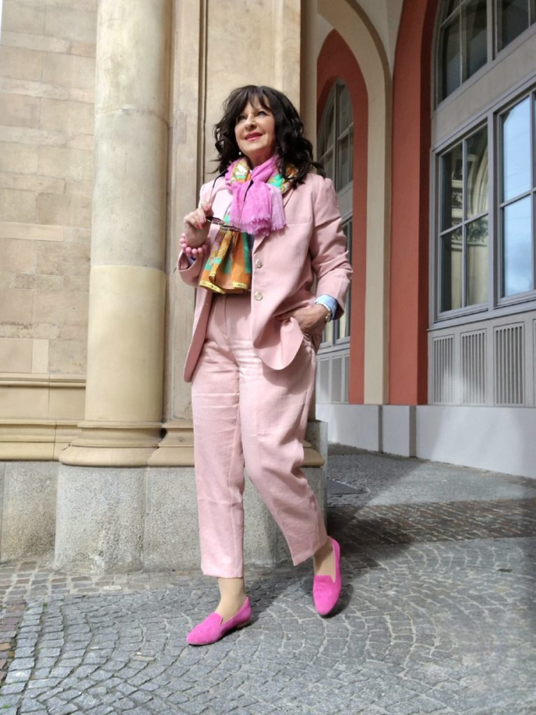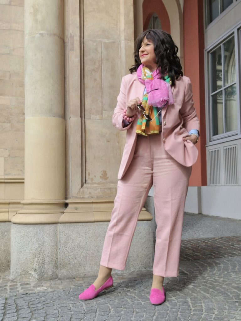 Ein Hosenanzug ist in dieser Saison so angesagt wie noch nie. Ehrlich gesagt, ist er nicht wirklich etwas Neues. Er ist aktuell ein Must Have, und zwar nicht nur in dunkelblau oder schwarz. Ich freue mich besonders darüber, dass es den Power Suit, wie er plötzlich „neudeutsch“ genannt wird, in zauberhaften Farben gibt. Ich trage bei meinem heutigen Look den Hosenanzug mit einer hellblauen Bluse. Schicke Ballerinas sind gerade gefragt wie nie – und das ist gut so.