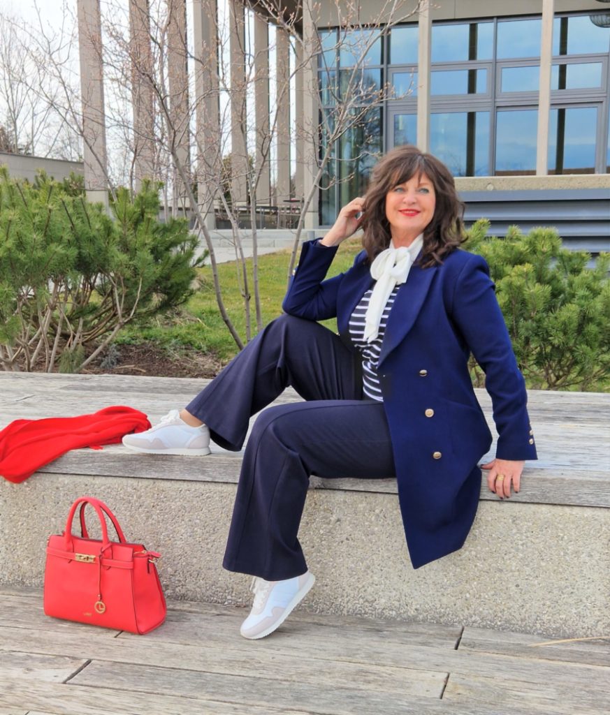 Liebe Martina, heut bin ich beim Stöbern im Archiv auf den blauen Hosenanzug vom Mai 23 gestoßen und habe ihn dann gleich für heute nachgestylt mit Ringelshirt, weissen Sneakern (!!!) und den roten Accessoires. War alles in meinen Schränken vorhanden 😀 Mein Hosenanzug stammt von Max Mara (ist einfach meine Lieblingsmarke für Hosen und Anzüge…) und das Shirt von Zara (alles gekauft vor ca. 3 Jahren). Ist das nicht lustig? Ich fühle mich super wohl und chic darin. Danke für Deine Tips!
