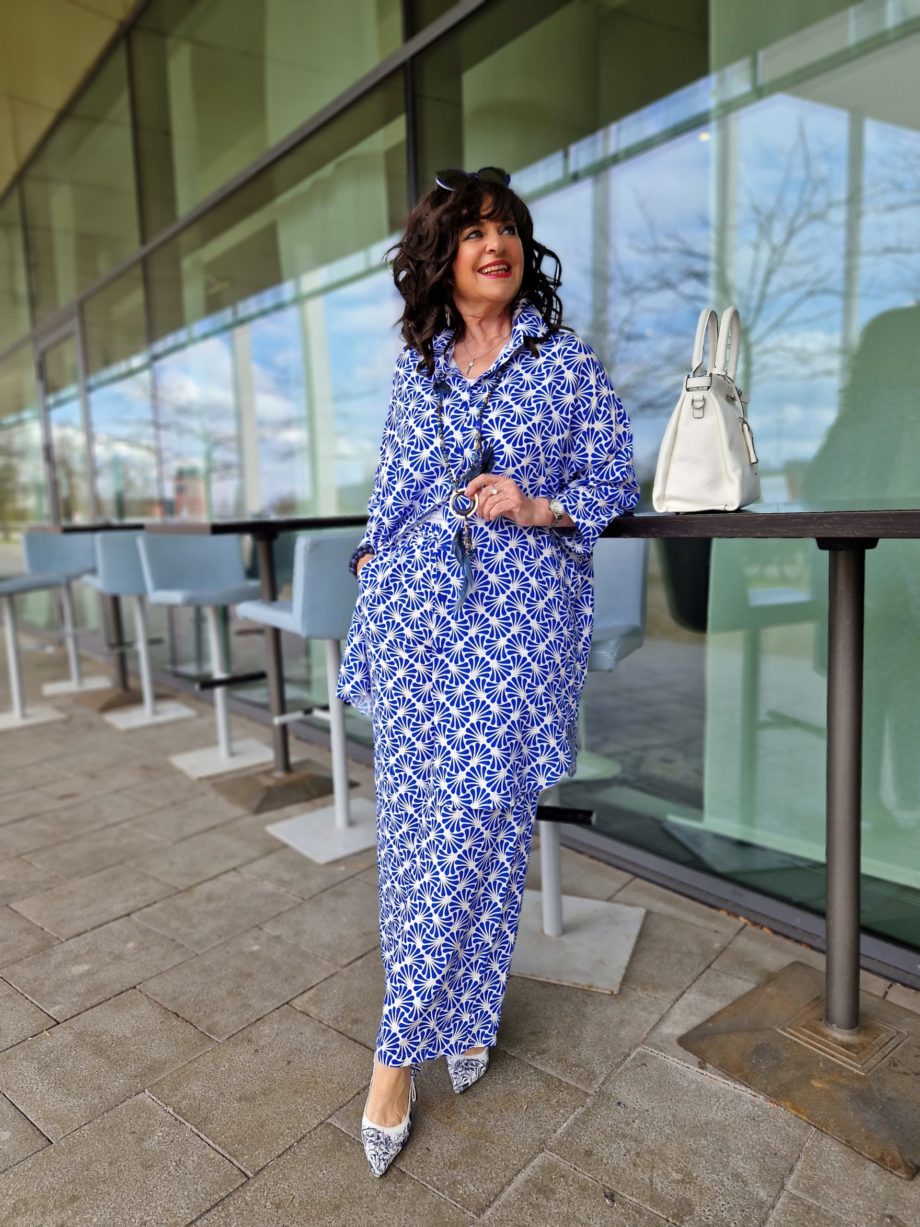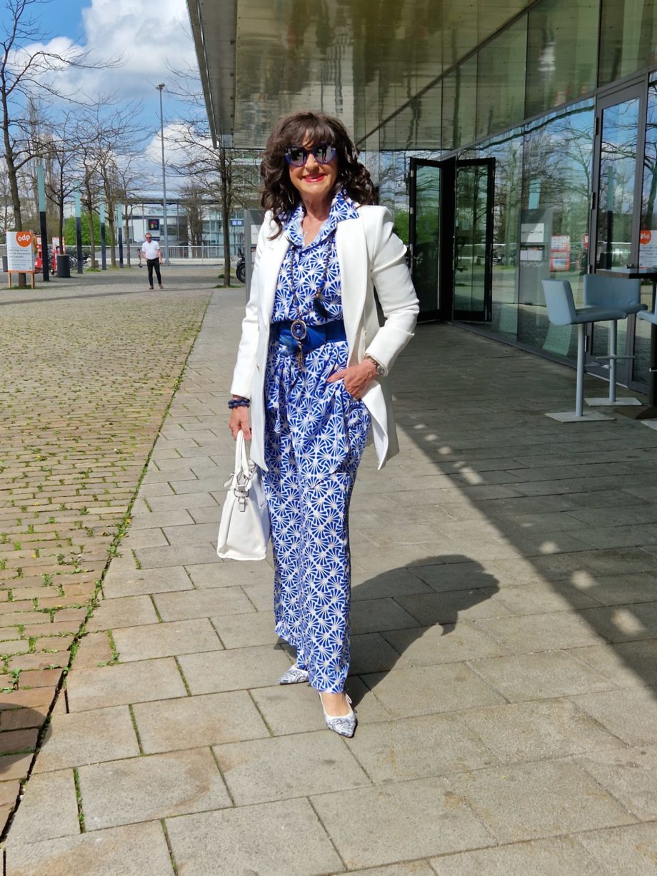 - Und wie Du in den Bilder siehst, passt der weiße Longblazer ideal zu dem Zweiteiler. Zur Betonung der Taille wähle ich einen royalblauen breiten Gürtel.
