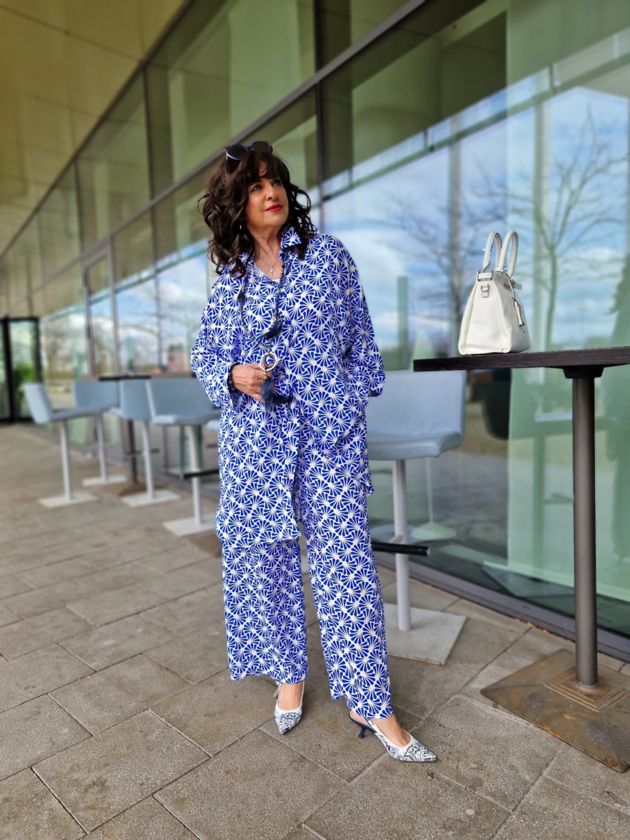 Ein Hosenanzug ist in dieser Saison so angesagt wie noch nie. Ehrlich gesagt, ist er nicht wirklich etwas Neues. Er ist aktuell ein Must Have, und zwar nicht nur in dunkelblau oder schwarz. Ich freue mich besonders darüber, dass es den Power Suit, wie er plötzlich „neudeutsch“ genannt wird, in zauberhaften Farben gibt. Ich trage bei meinem heutigen Look den Hosenanzug mit einer hellblauen Bluse. Schicke Ballerinas sind gerade gefragt wie nie – und das ist gut so.