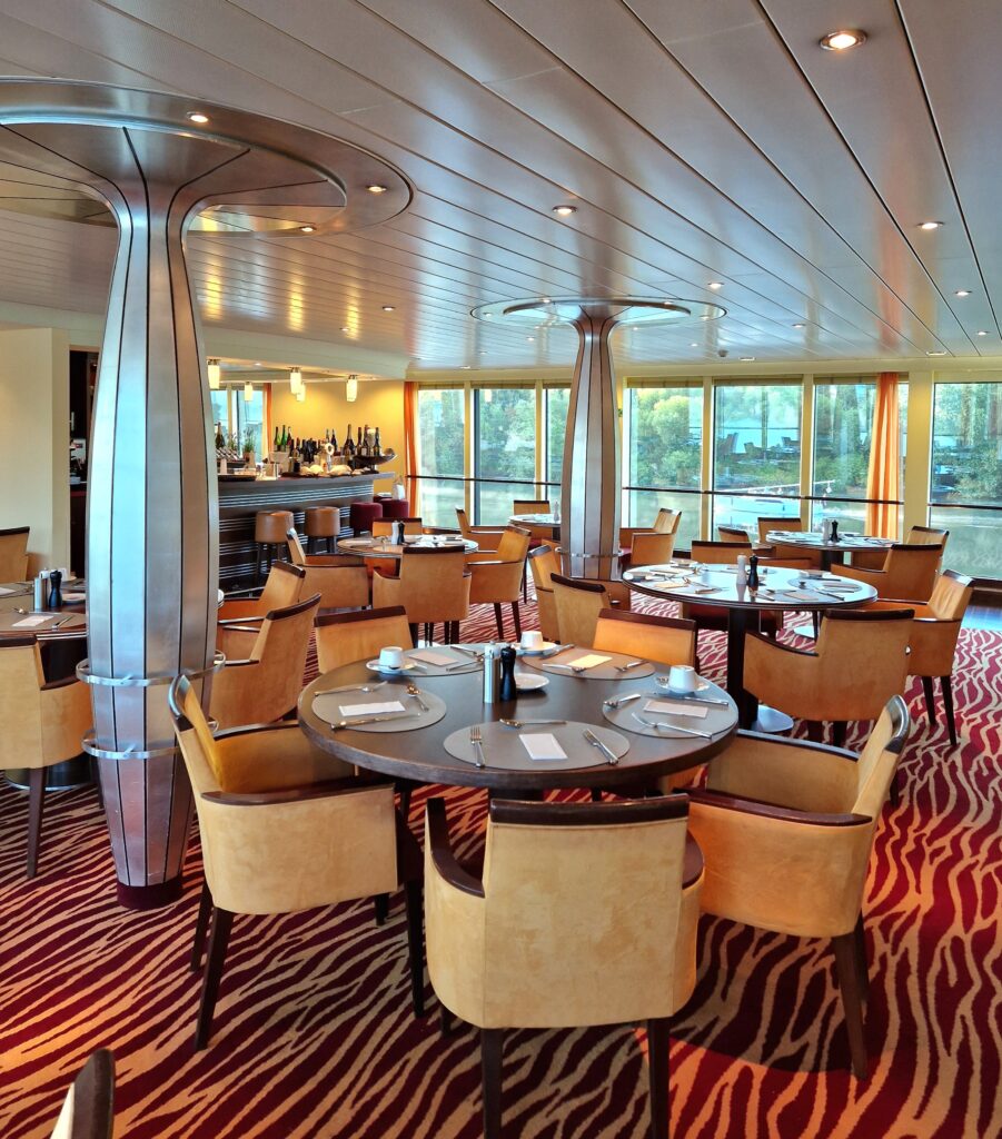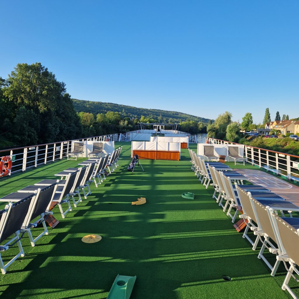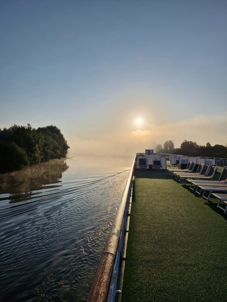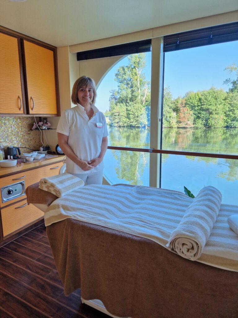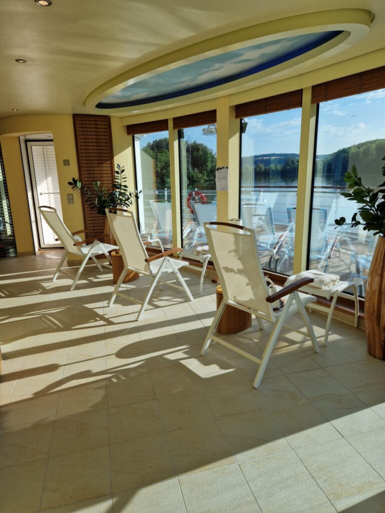 Es gibt Tage, da ist es an Bord schöner als an Land, zumindest für mein Empfinden. Als wir in LES ANDELEY angelegt haben, habe ich mich spontan entschieden, dass ich heute die Ruhe auf dem Sonnendeck genießen möchte. Eine Massage habe ich mir gegönnt und der Wellnessbereich gehörte mir an diesem Tag fast ganz alleine. Man muss nicht jeden Tag einen Ausflug machen oder jede Sehenswürdigkeit besichtigen. Schließlich soll sich jeder auf einer Flusskreuzfahrt nach seinem Belieben und Gefühlen den Tag gestalten. Das ist das Schöne am Reisen mit dem Flusskreuzfahrtschiff: Vieles kann – nichts muss.