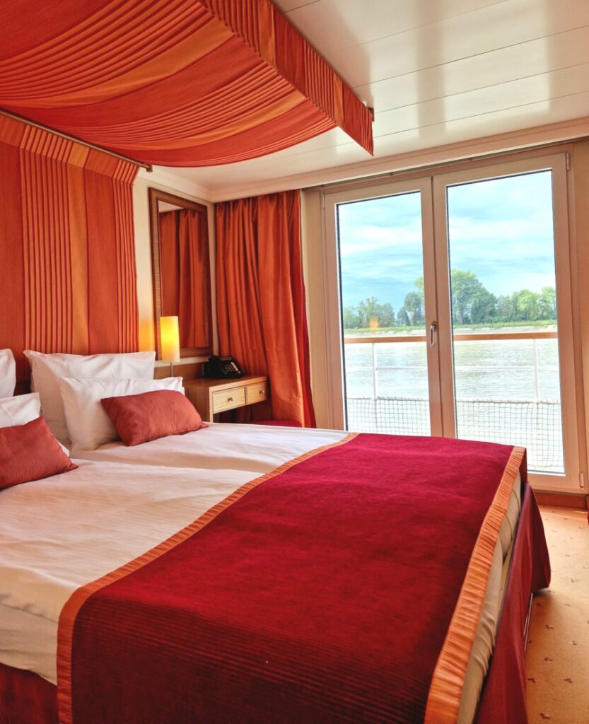 Die Außenkabinen sind mit einem französischem Balkon ausgestattet. Man hat einen einzigartigen Blick von drinnen nach draußen. Das ist ein sagenhaftes Gefühl, wenn man auf dem Bett liegt und man sieht die Landschaft an einem vorbei ziehen.