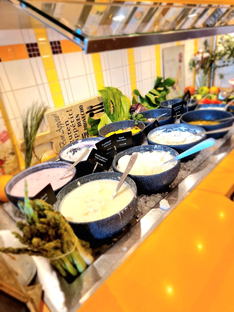 Frühstück, Mittagessen, Kaffeegenuss und das Abendessen werden am Buffet präsentiert. Die Auswahl ist reichhaltig. Selbst für Kinder ist täglich ein Kindermenü vorgesehen. Und für Frühaufsteher gibt es Kaffee und Croissant am frühen Morgen.
